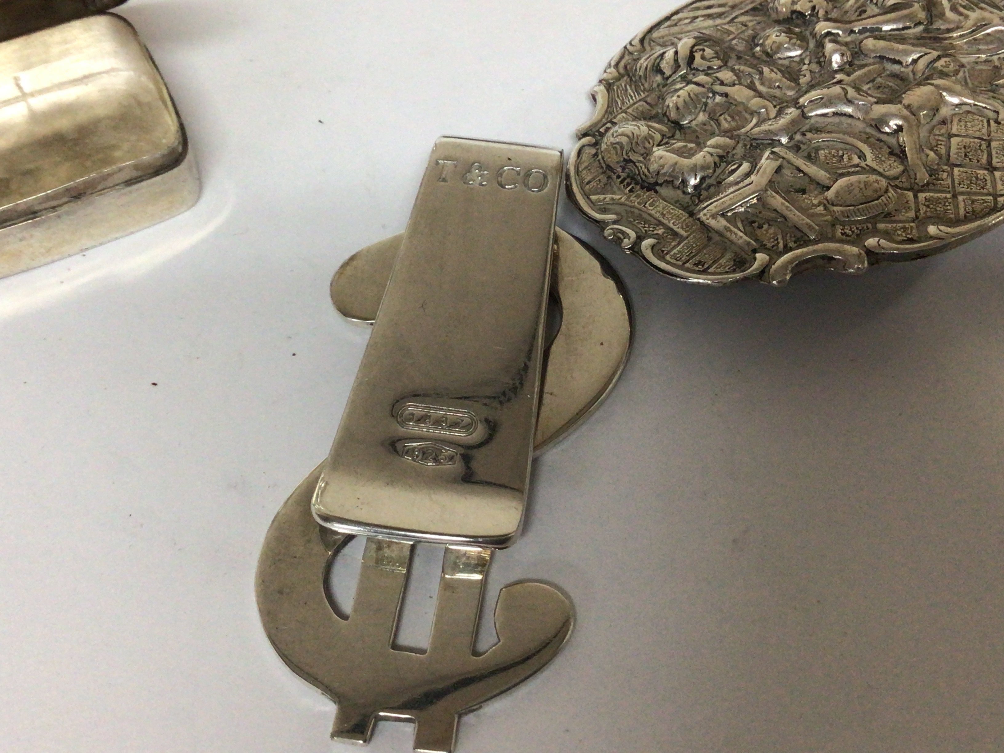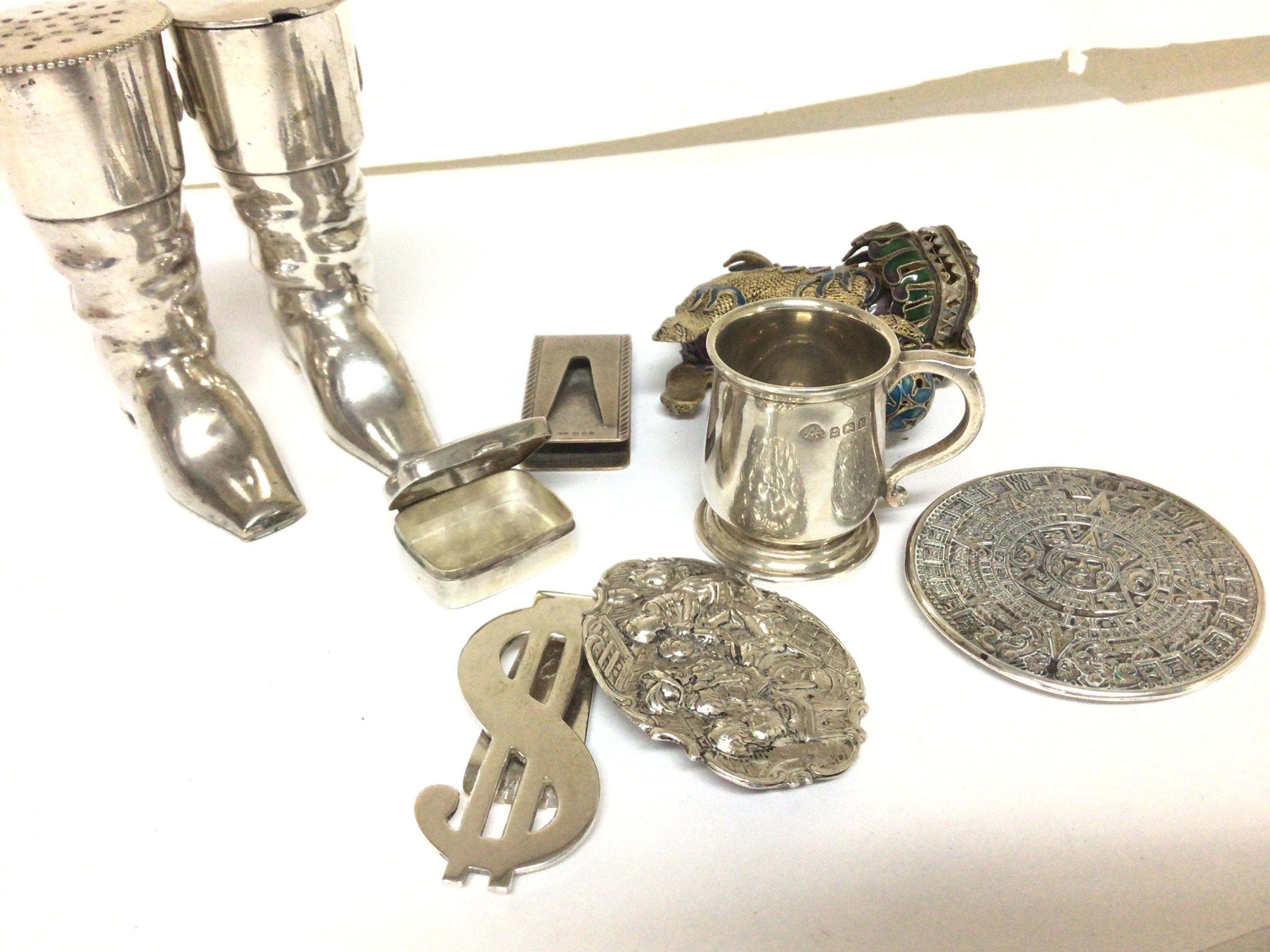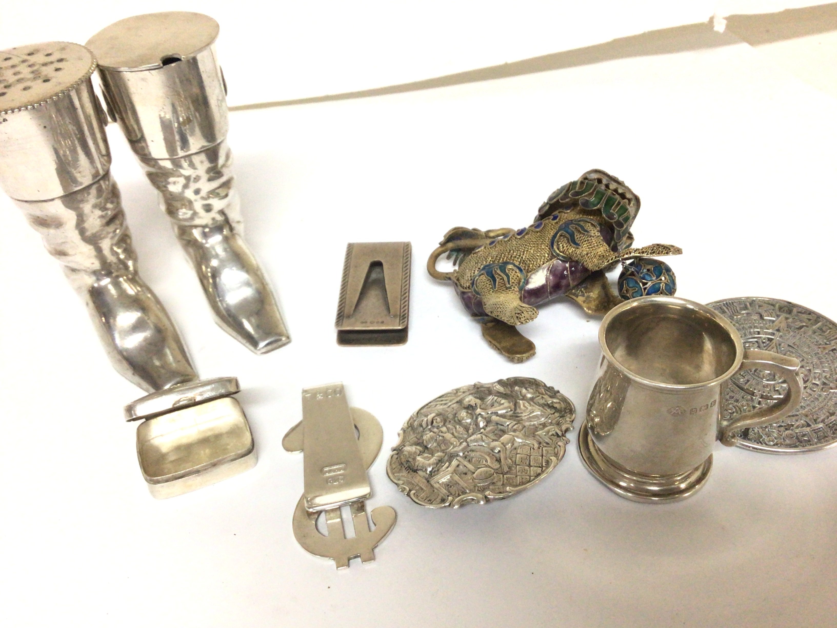 A collection of silver oddments silver money clips a small silver tankard silver brooch pendent one other continental silver brooch a pair of novelty silver plated condiments in the form of riding boots and an enamel Chinese ornate dog.