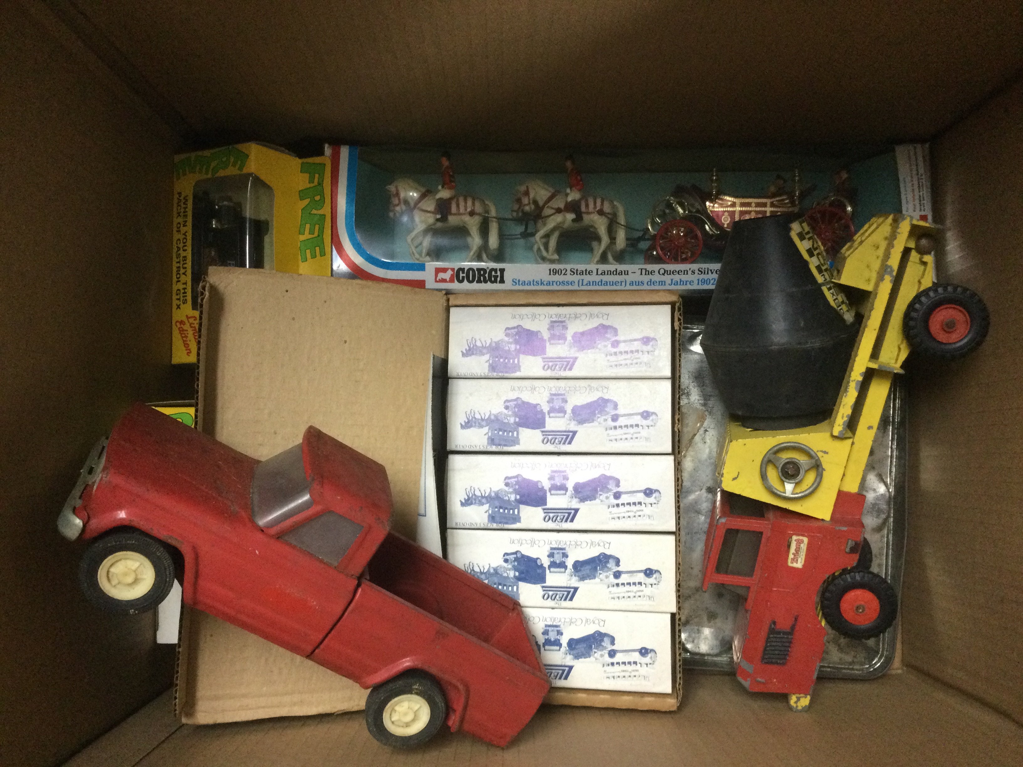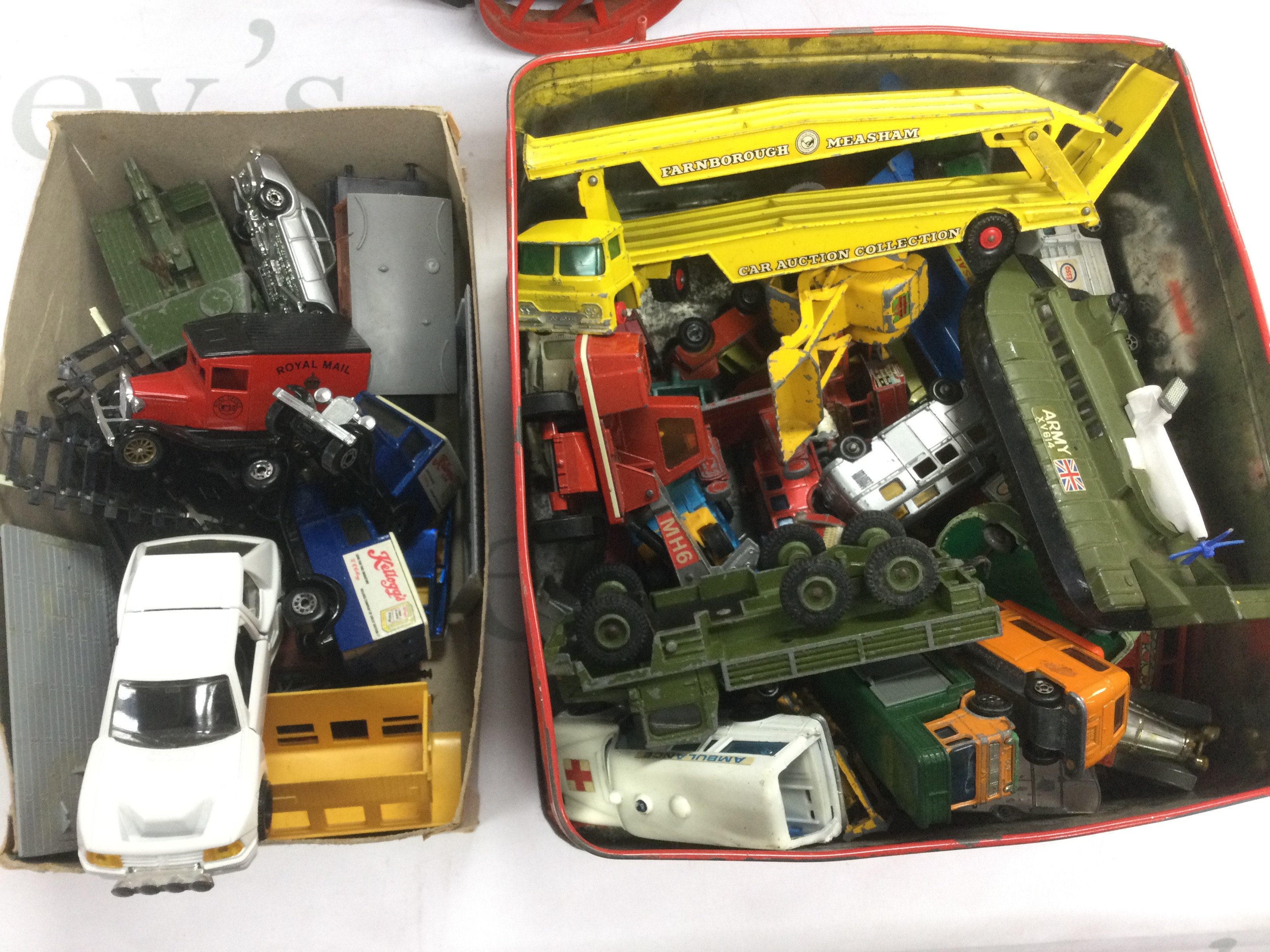 A box of playworn and boxed die cast vehicles. Shipping category D.