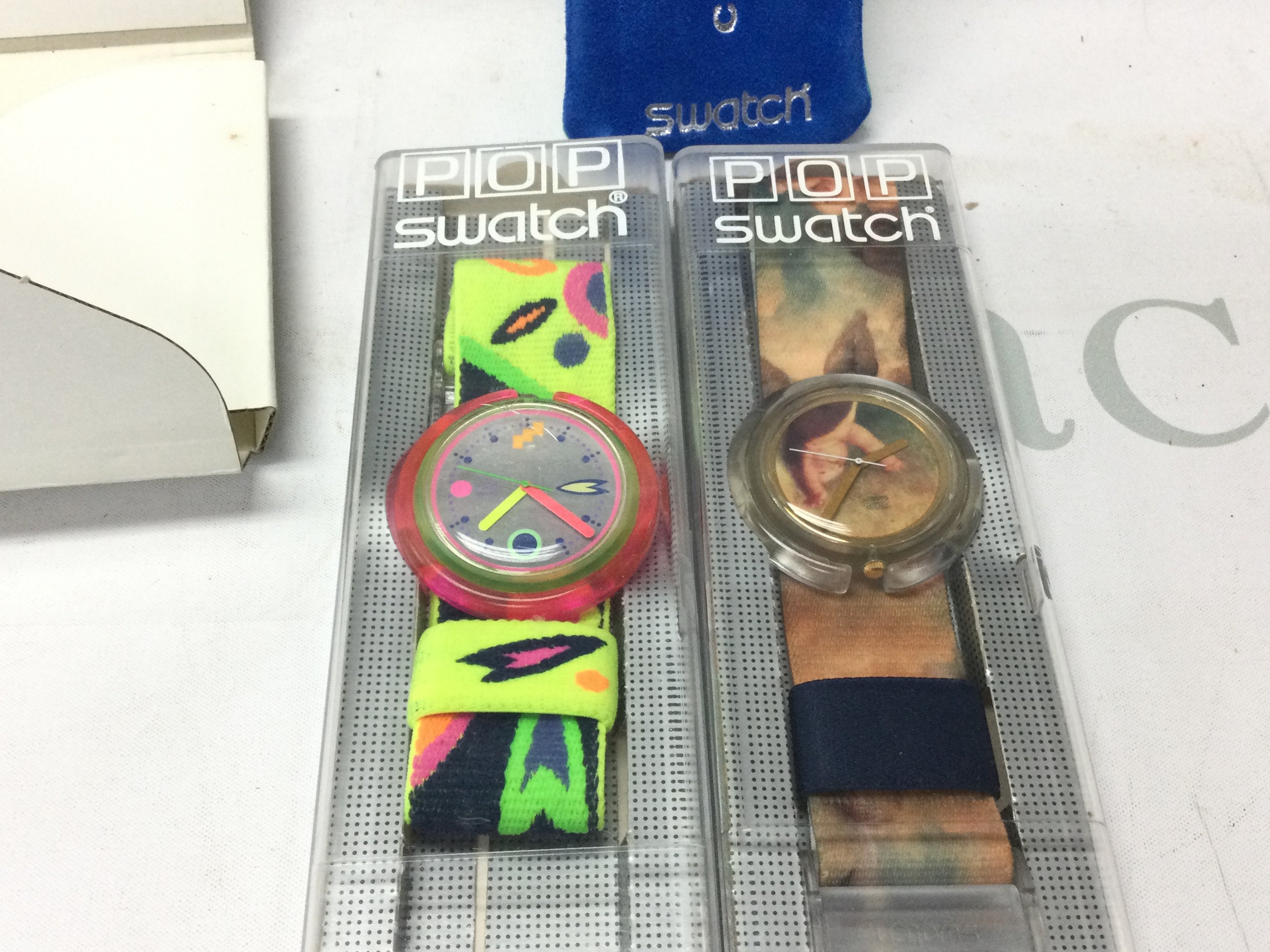 A 1994 crystal surprise swatch watch still sealed along with two pop swatch watches in cases. Postage B