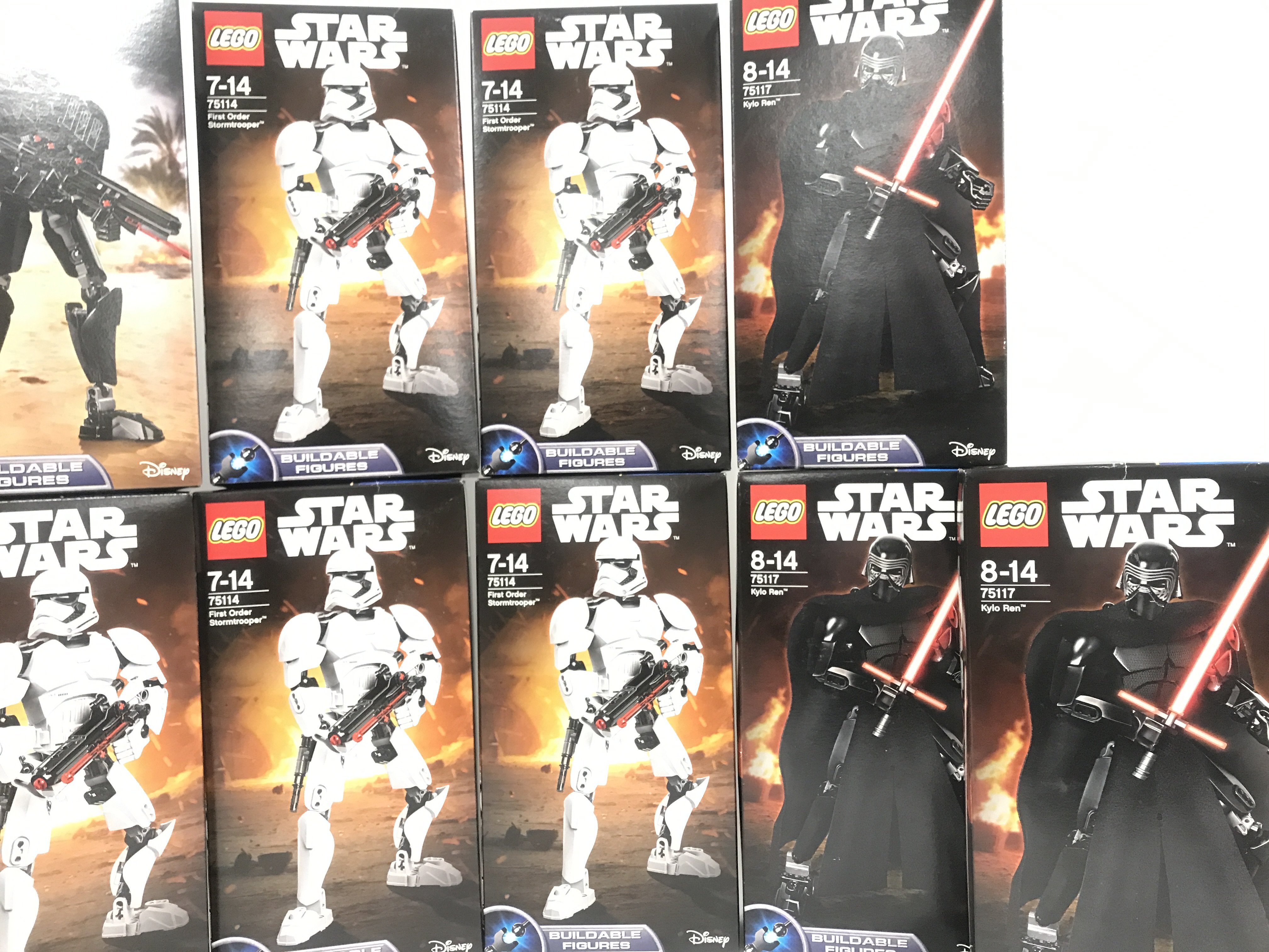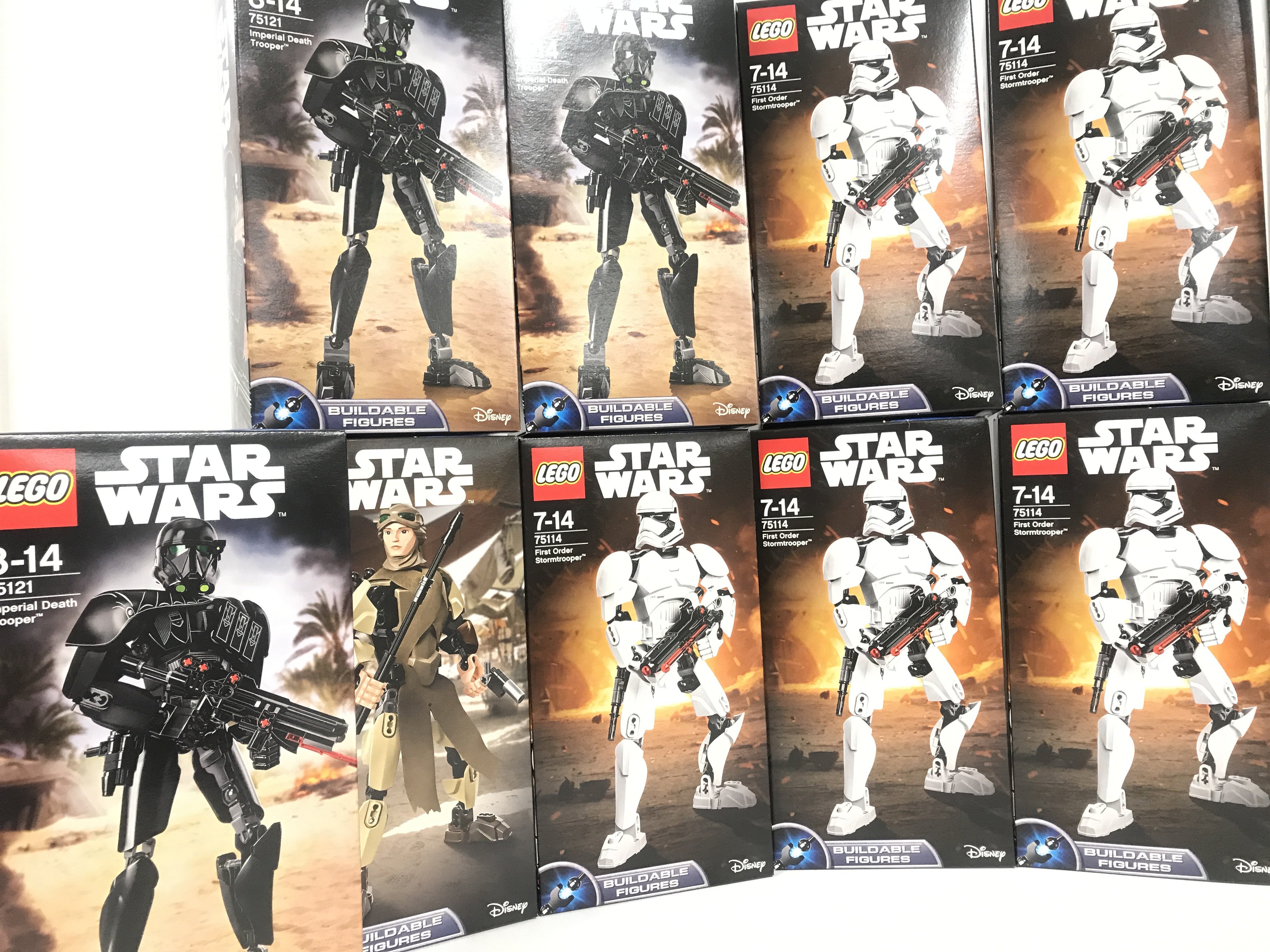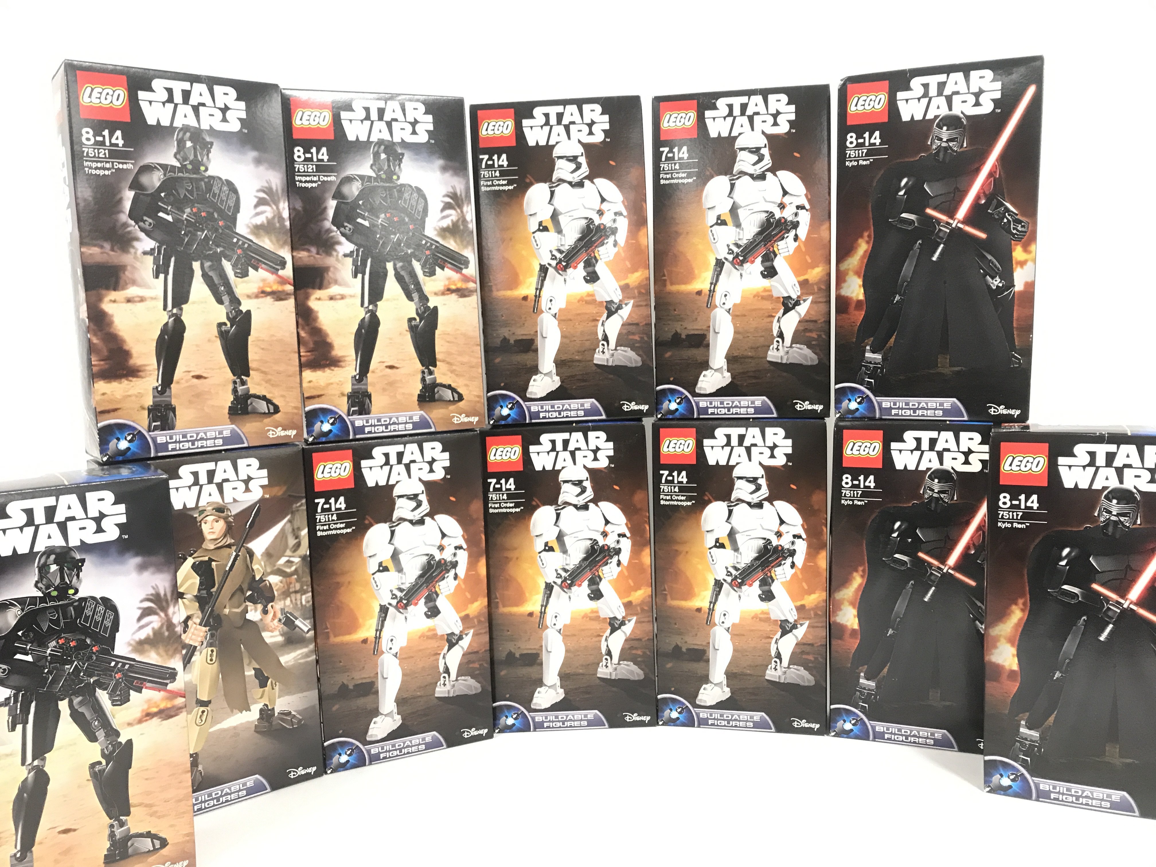 12 X Boxed And Sealed Lego Star Wars Buildable Figures. Including First Order Stormtrooper #75114. Kyle Ren #75117. Rey #75113 And Imperial Death Troopers #75121.