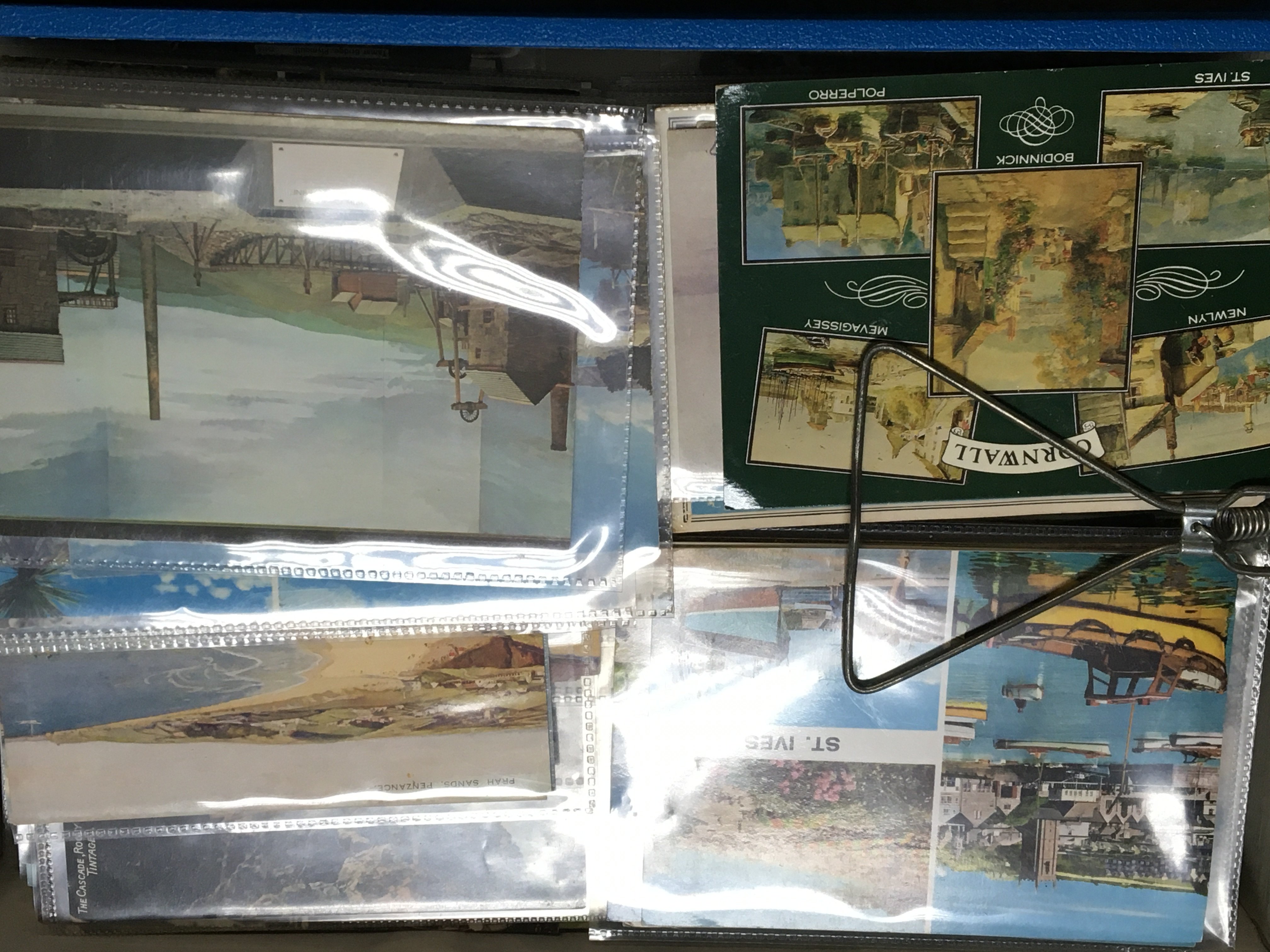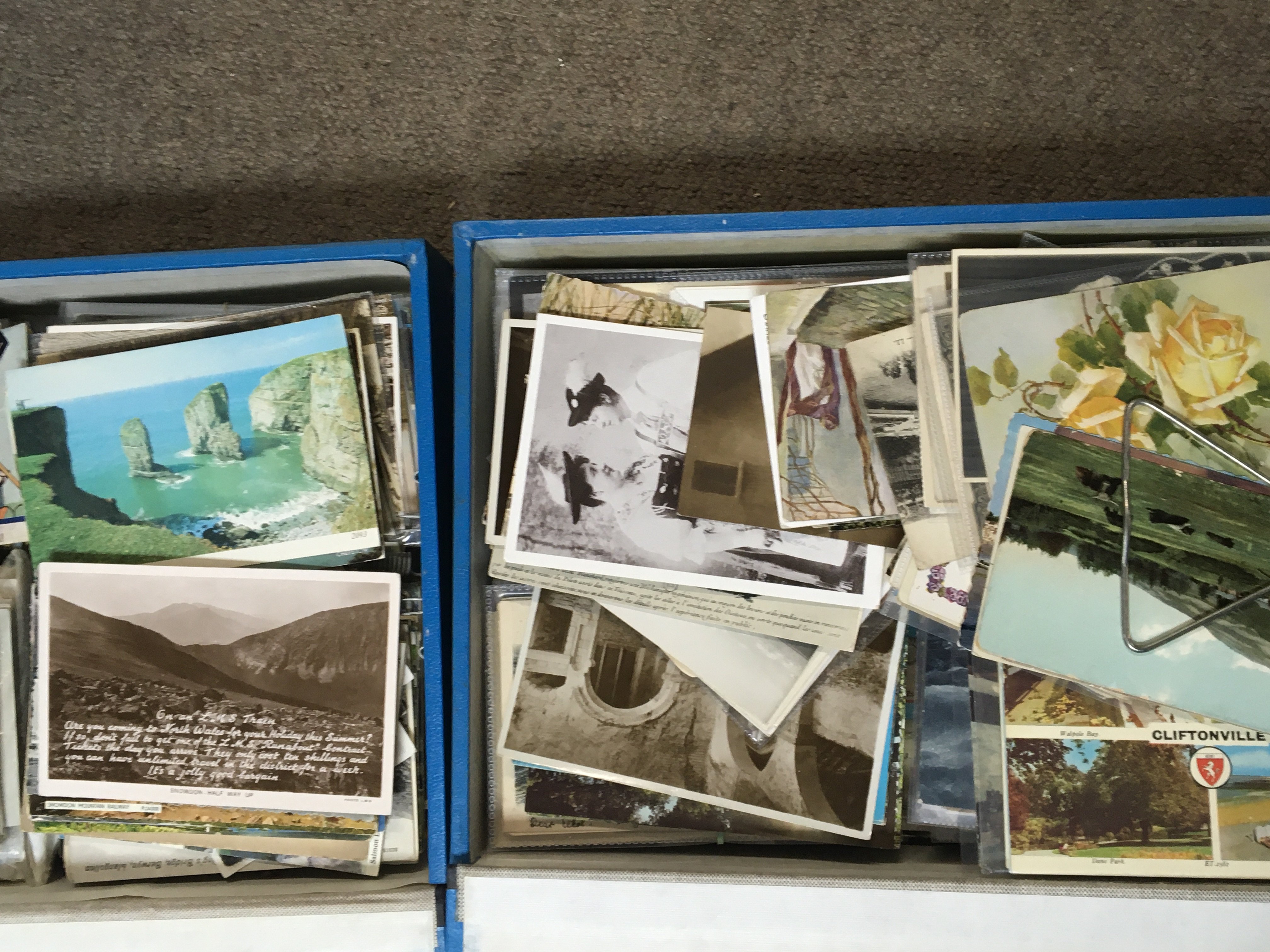 Three box files containing a collection of postcards including early comical cards of the George V period and many later cards a collection of Cornish postcards and others