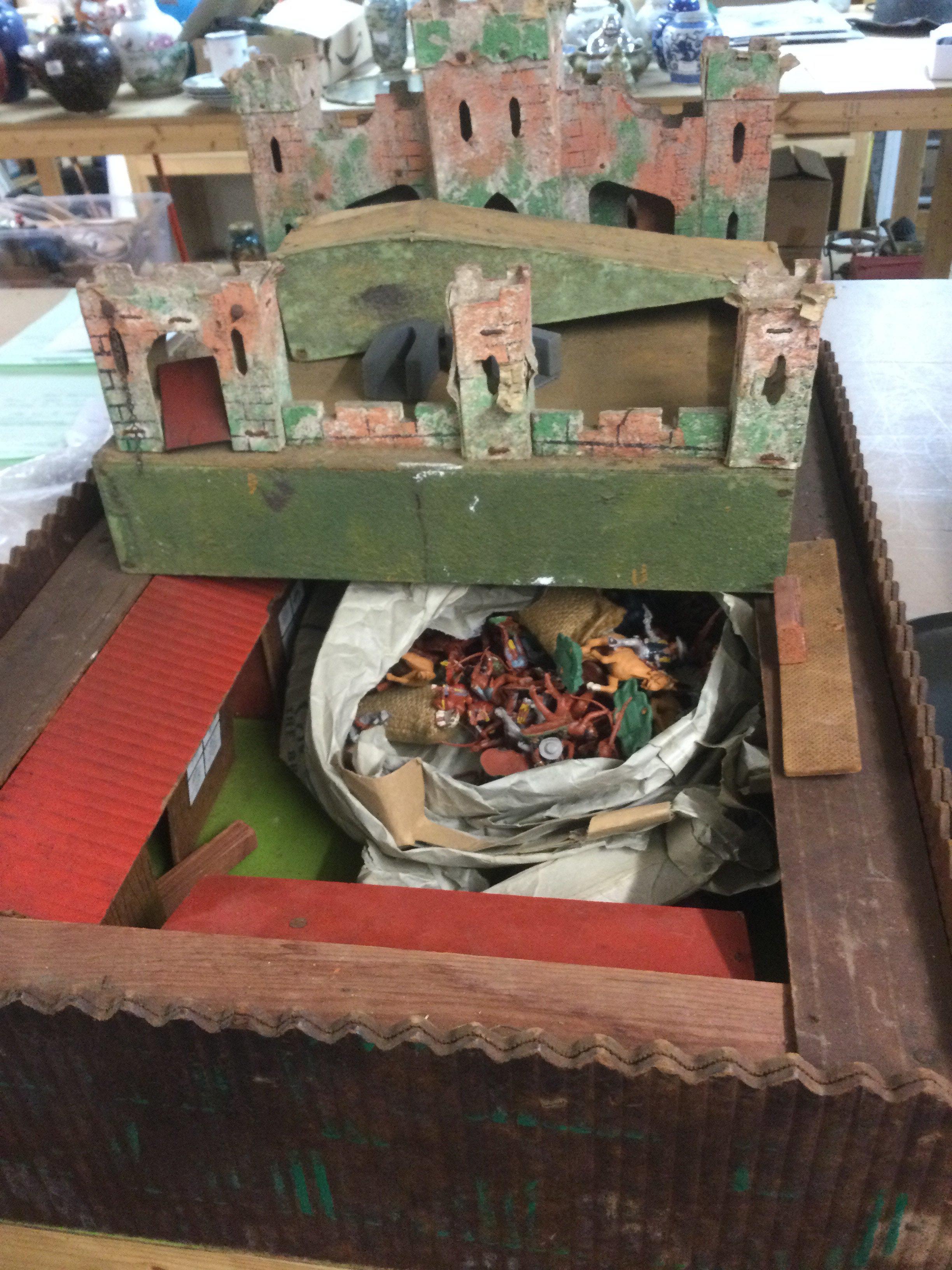A scratch built model castle and plastic figures, boxed Crossfire game and vintage dolls with accessories (3). Shipping category D.