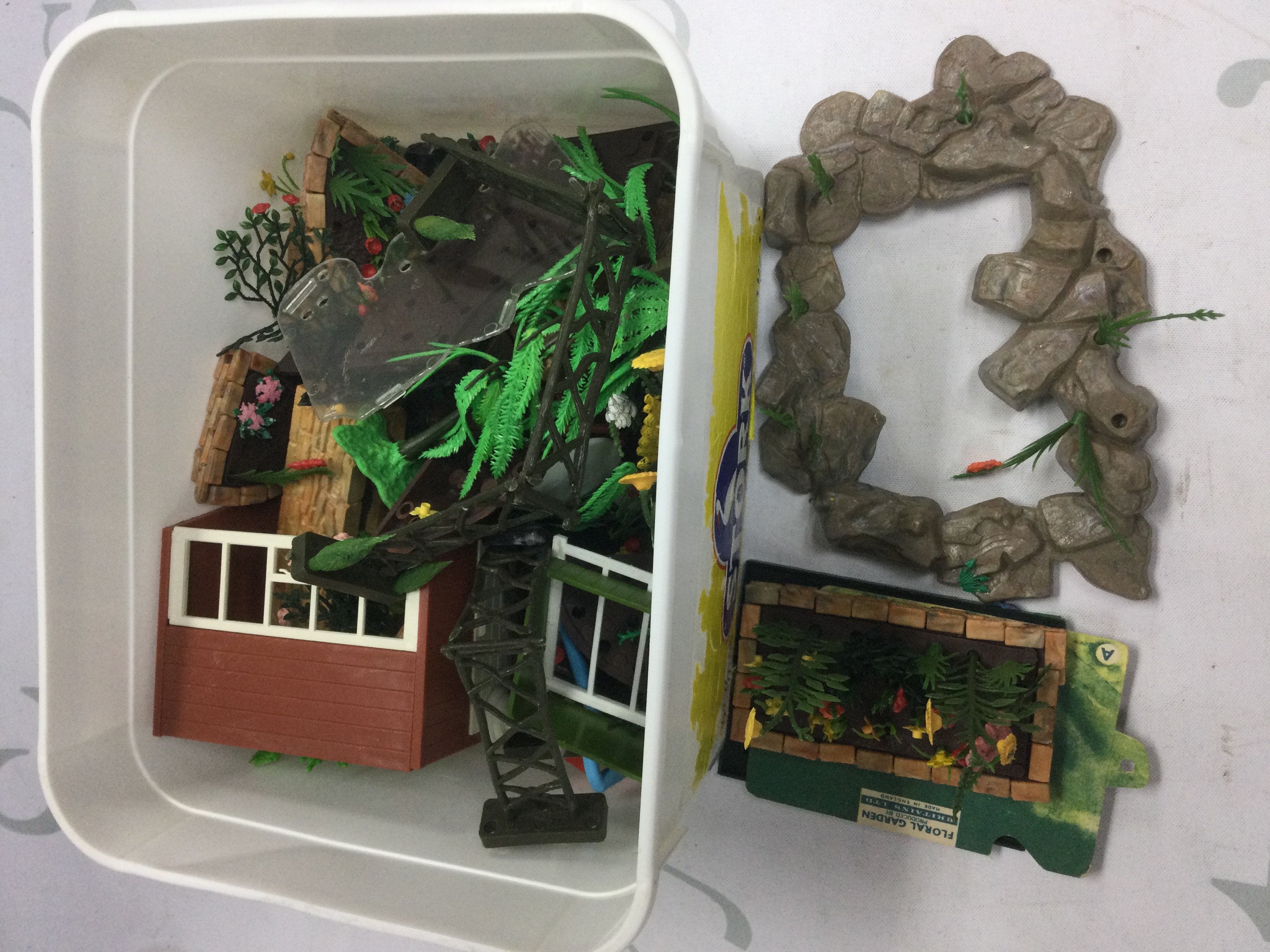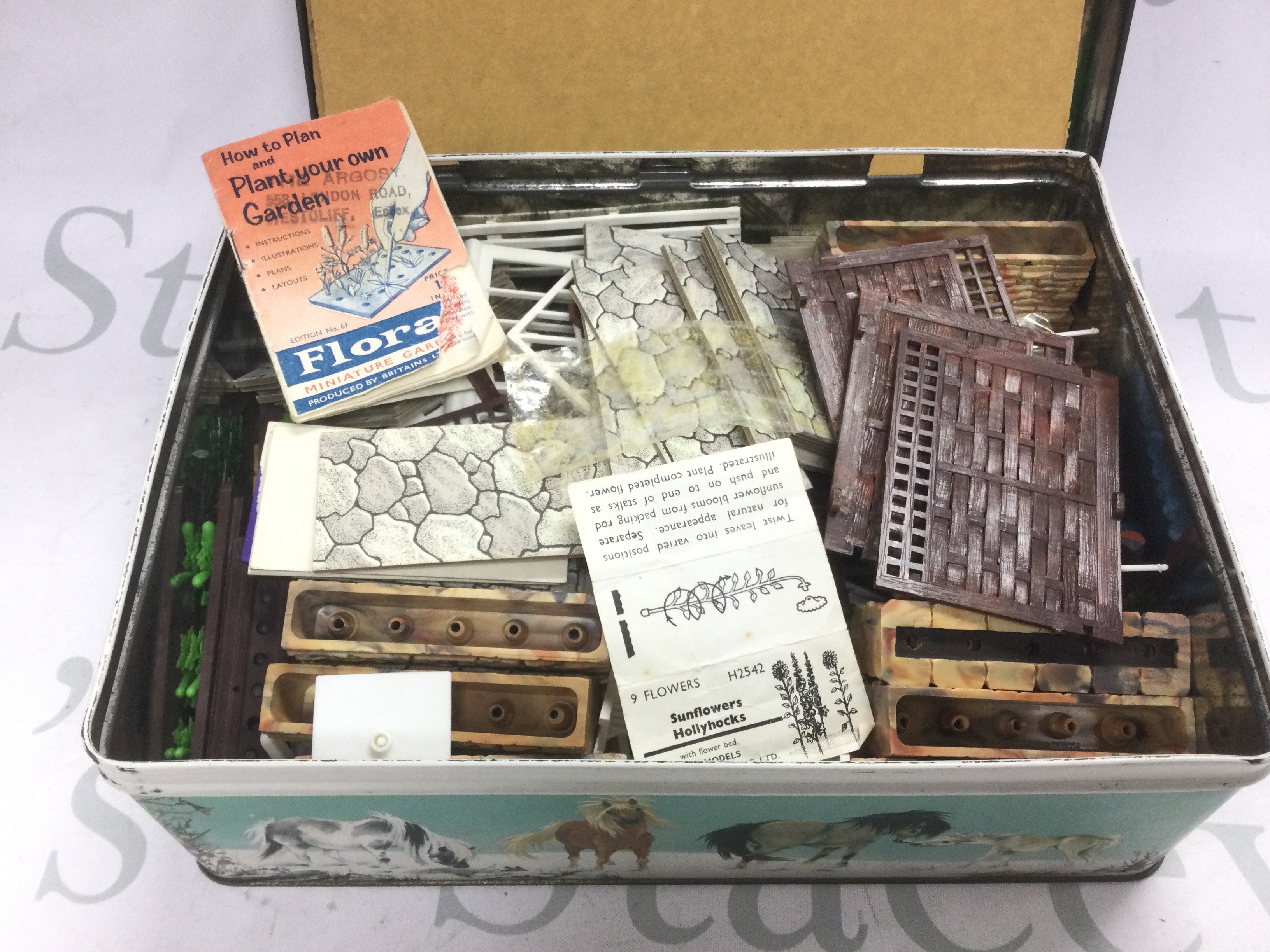 A tin and a tub of 1930s Britains miniature garden items (2). Shipping category B.