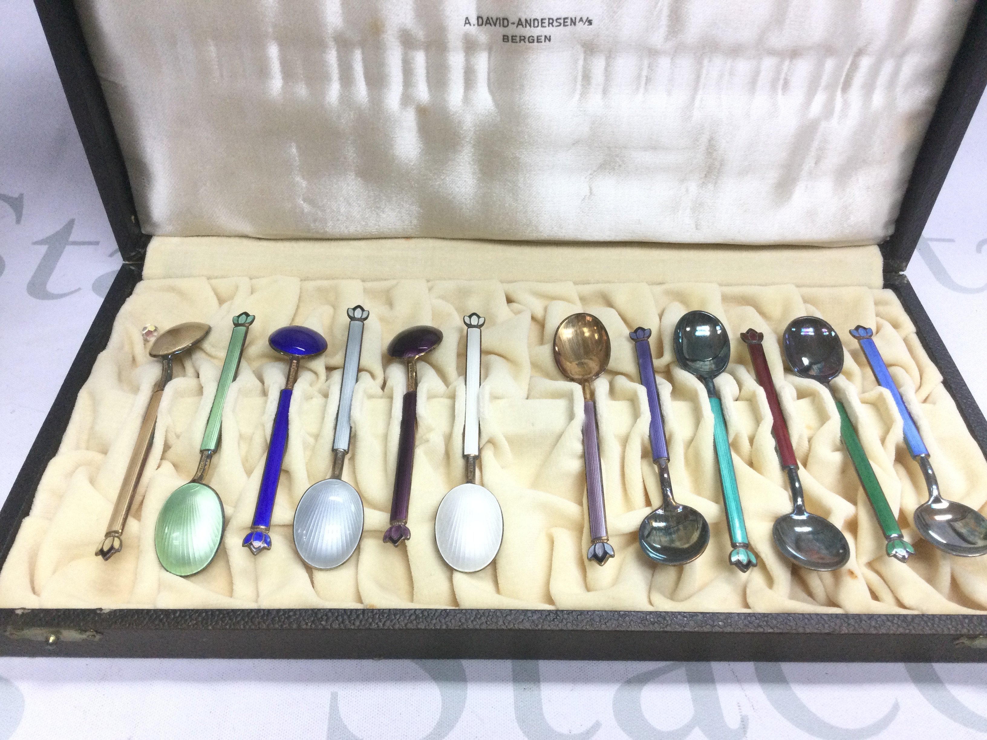 A cased set of 12 David Andersen Norwegian silver and enamel coffee spoons. Shipping category B.