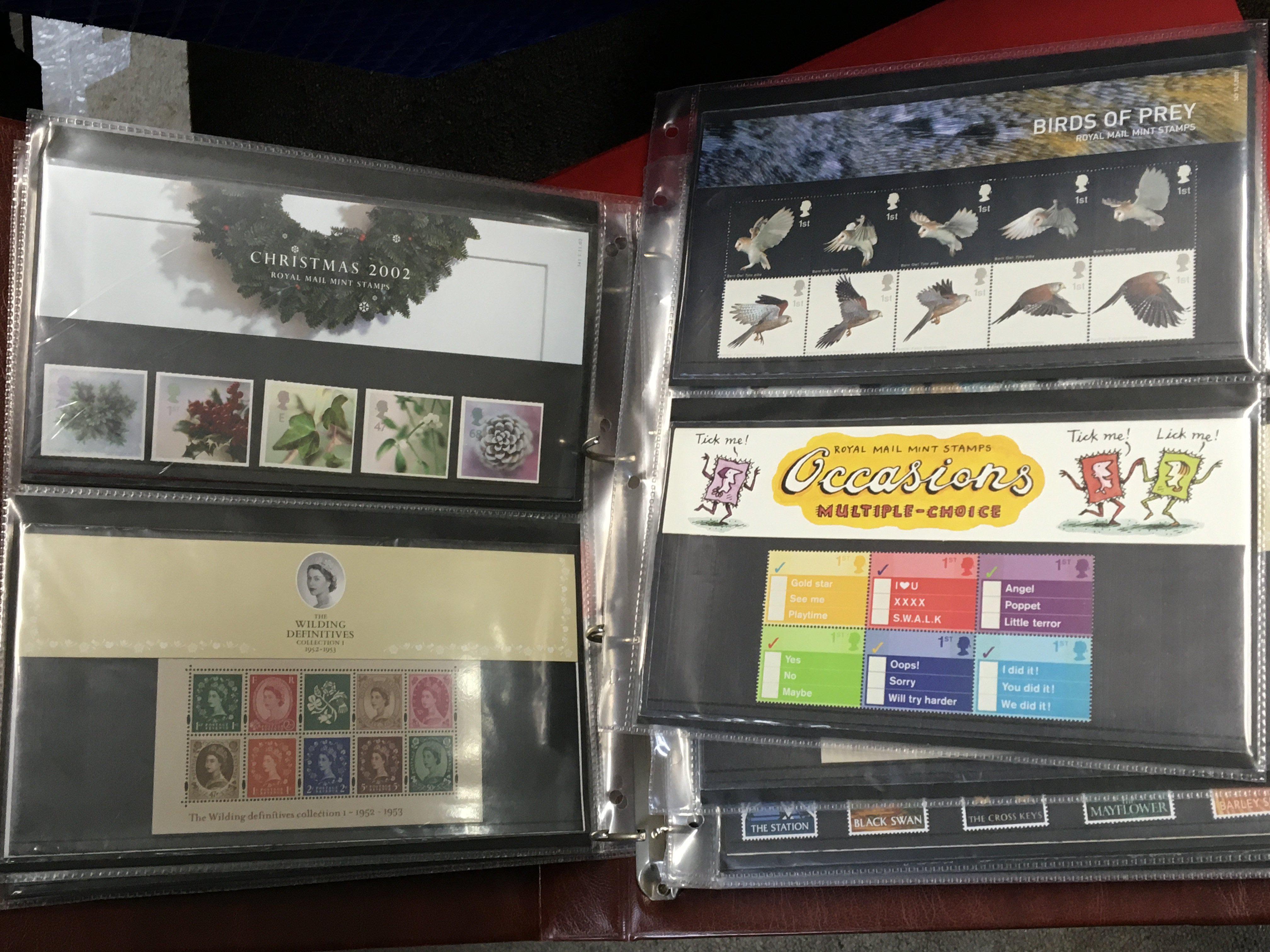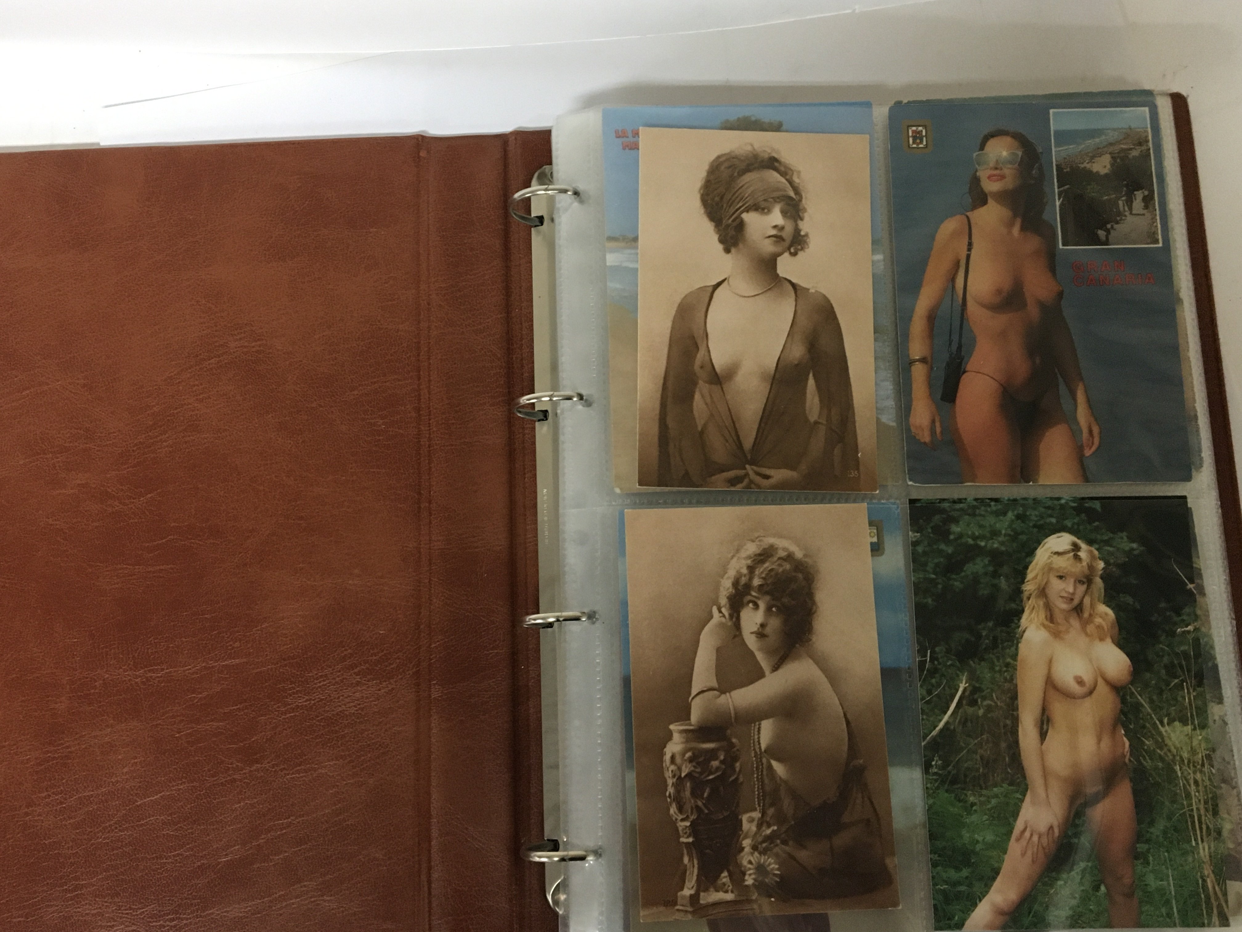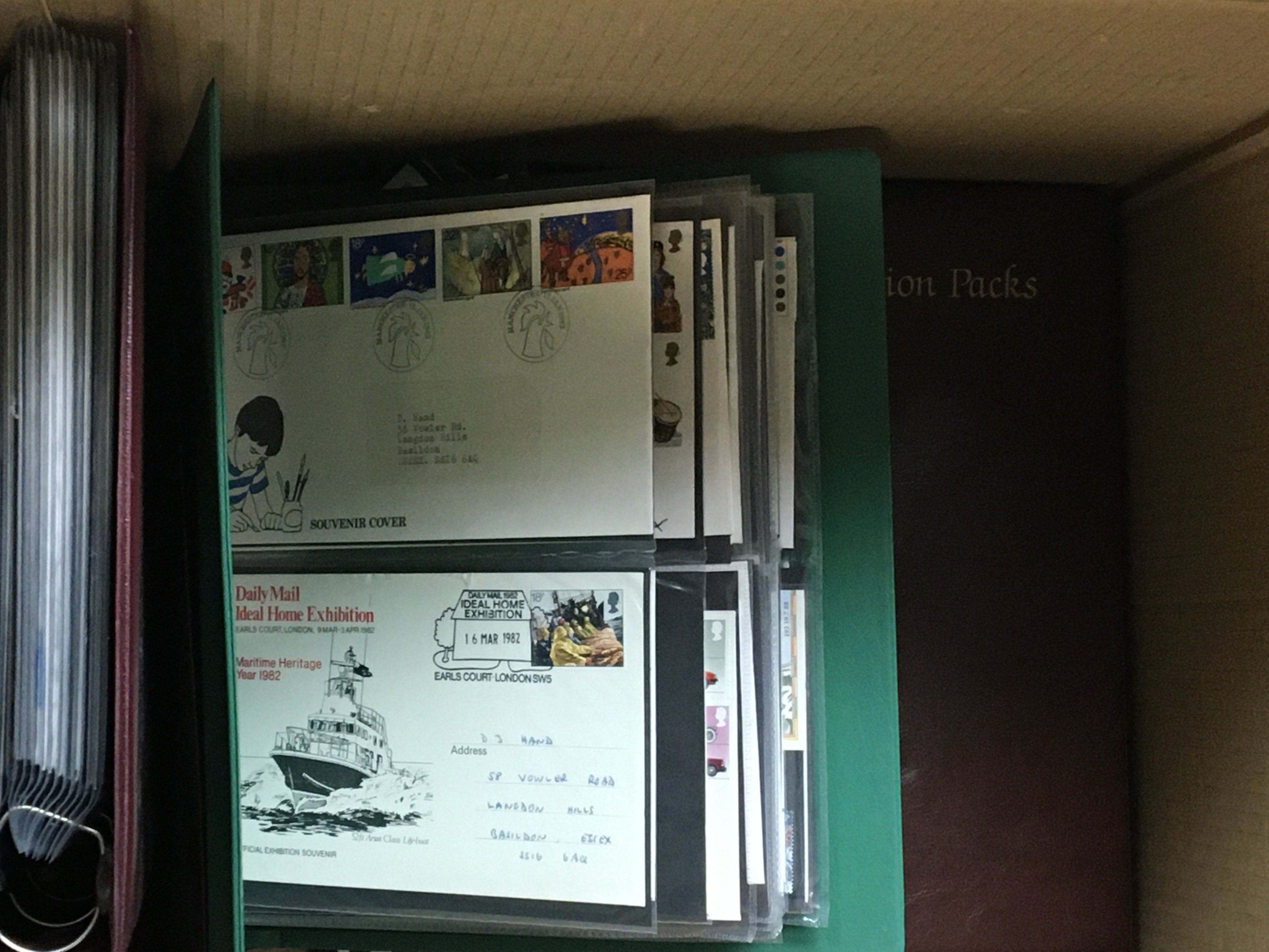 A box containing Royal Mail Albums of First day covers and some presentation packs and an album containing postcards depicting nudes.