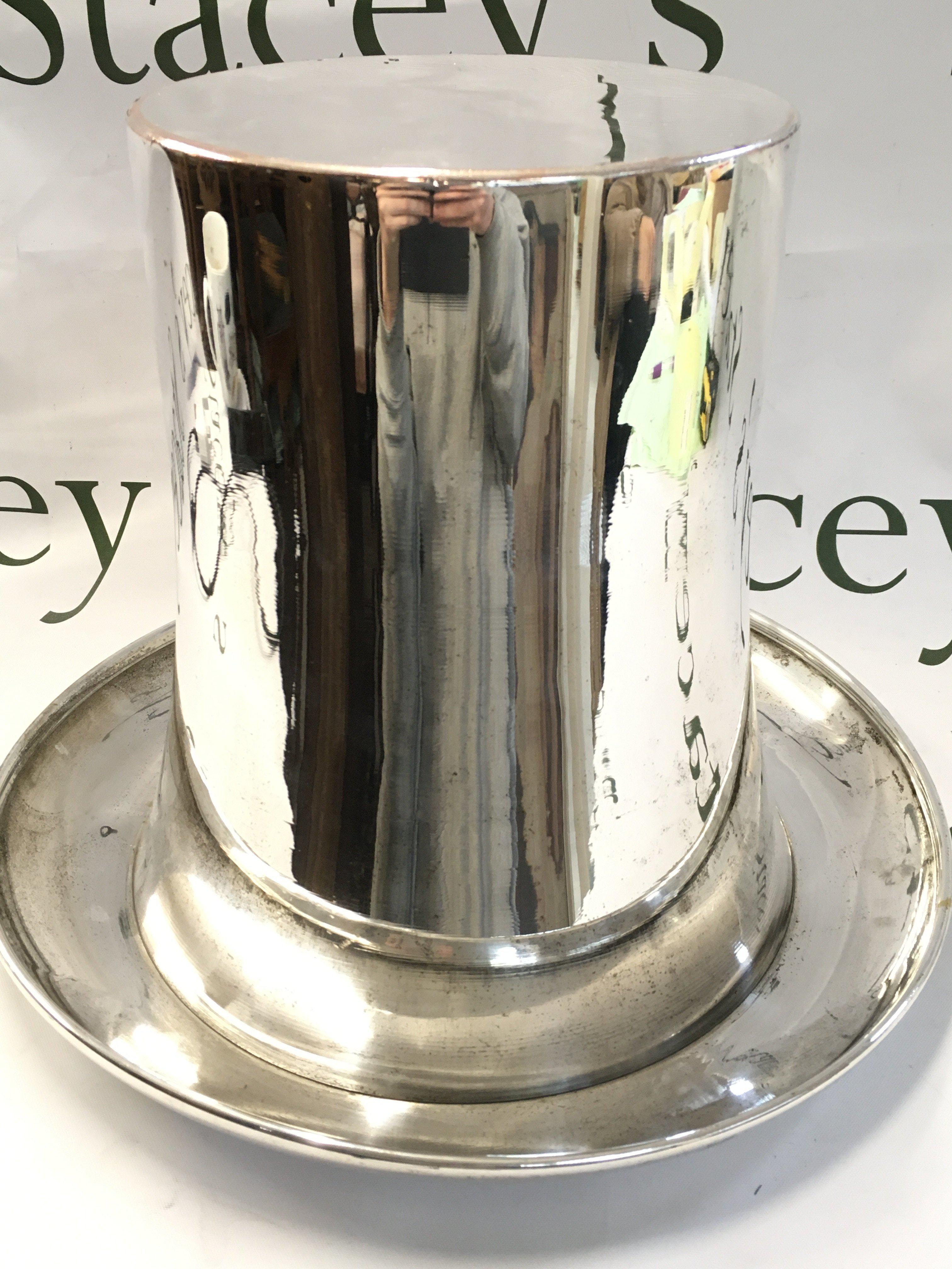 A 1980s silver plated top hat wine cooler, 23.5cm tall , 30cm wide approximately . Postage category C