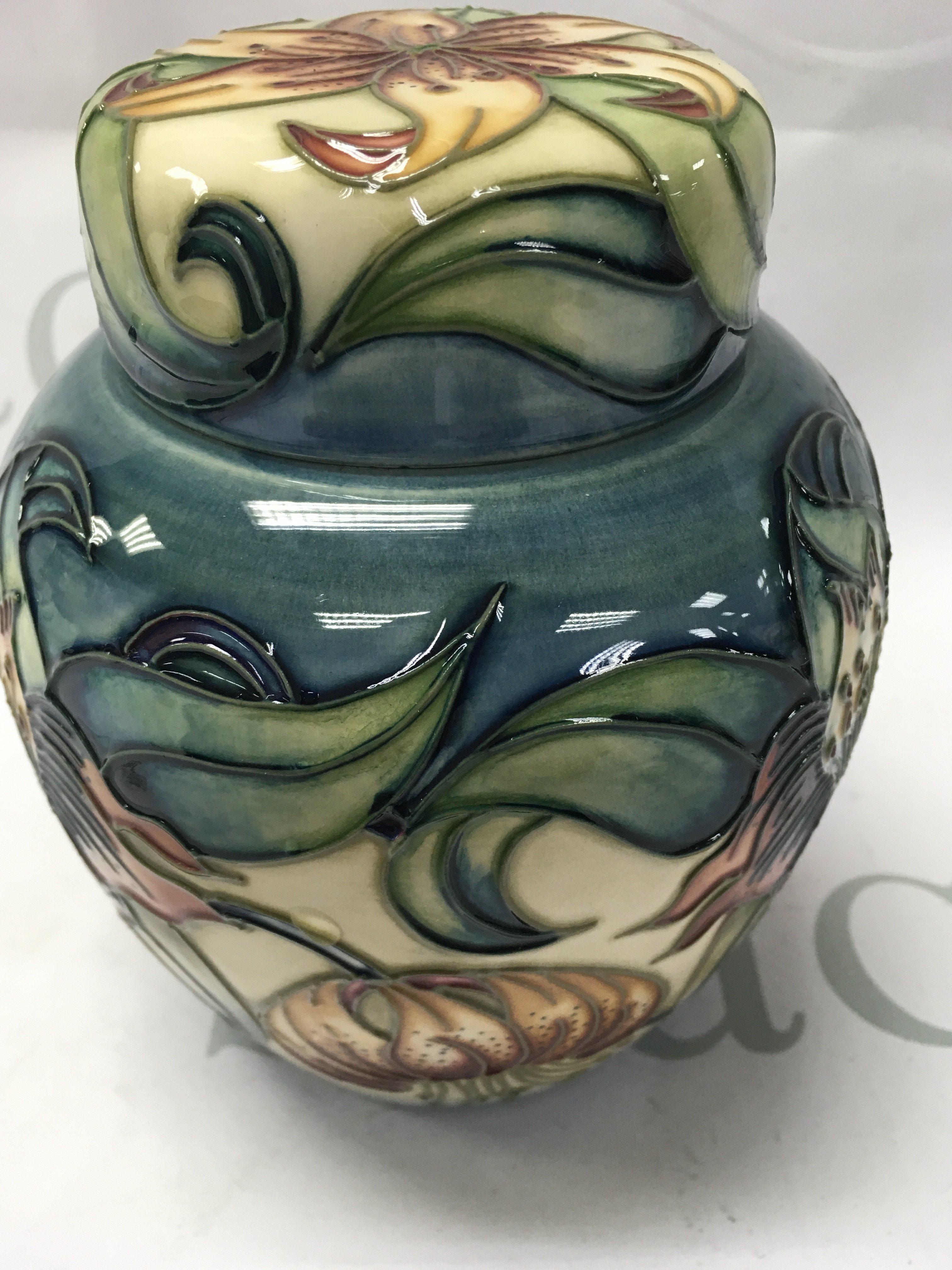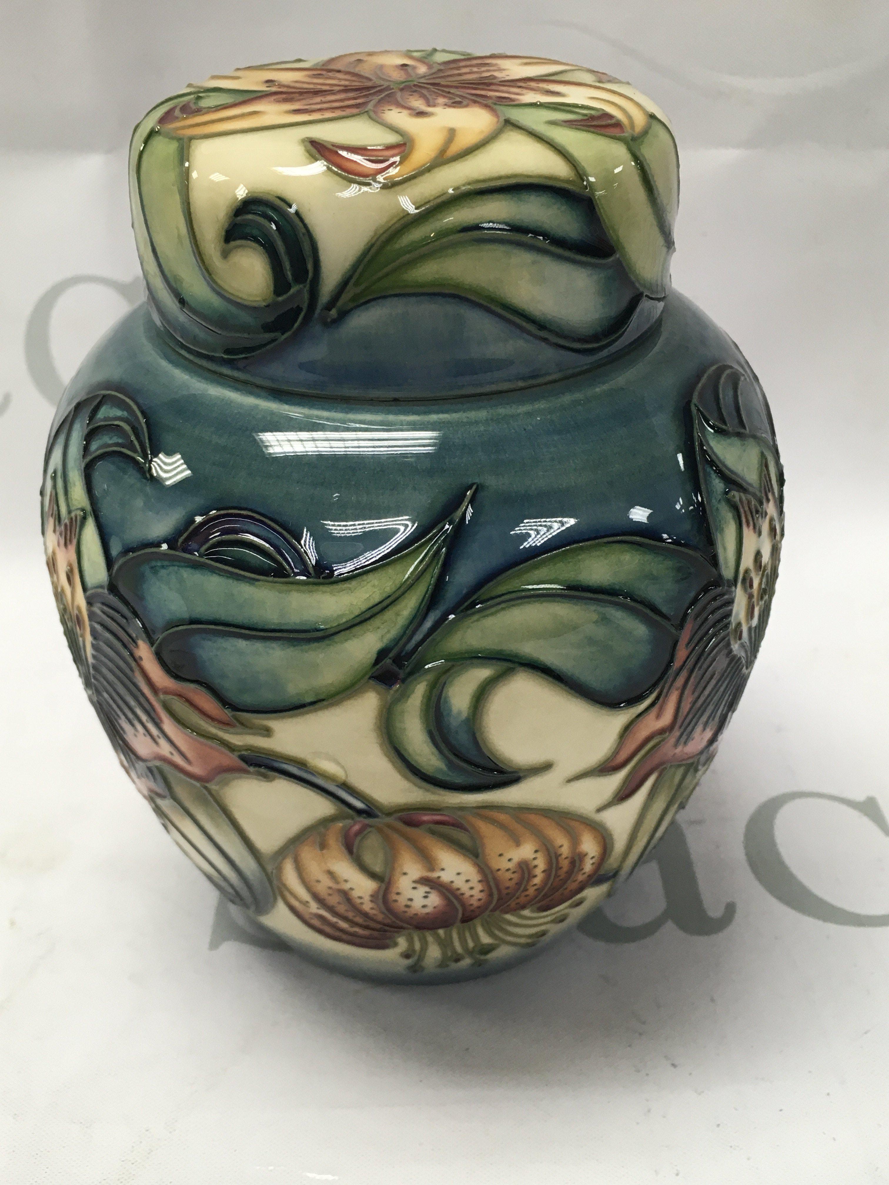 A Moorcroft ginger jar and cover decorated with Lily's. 16 cm .