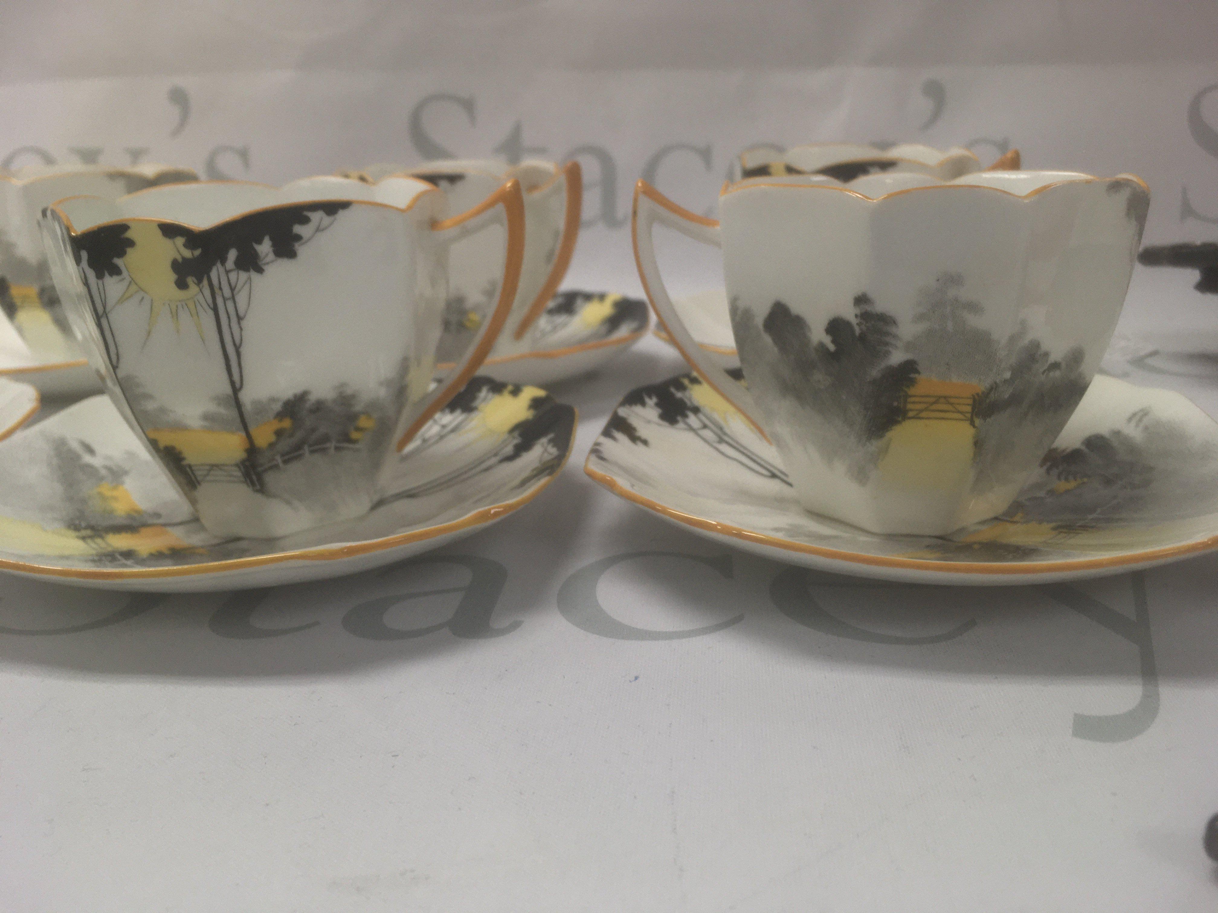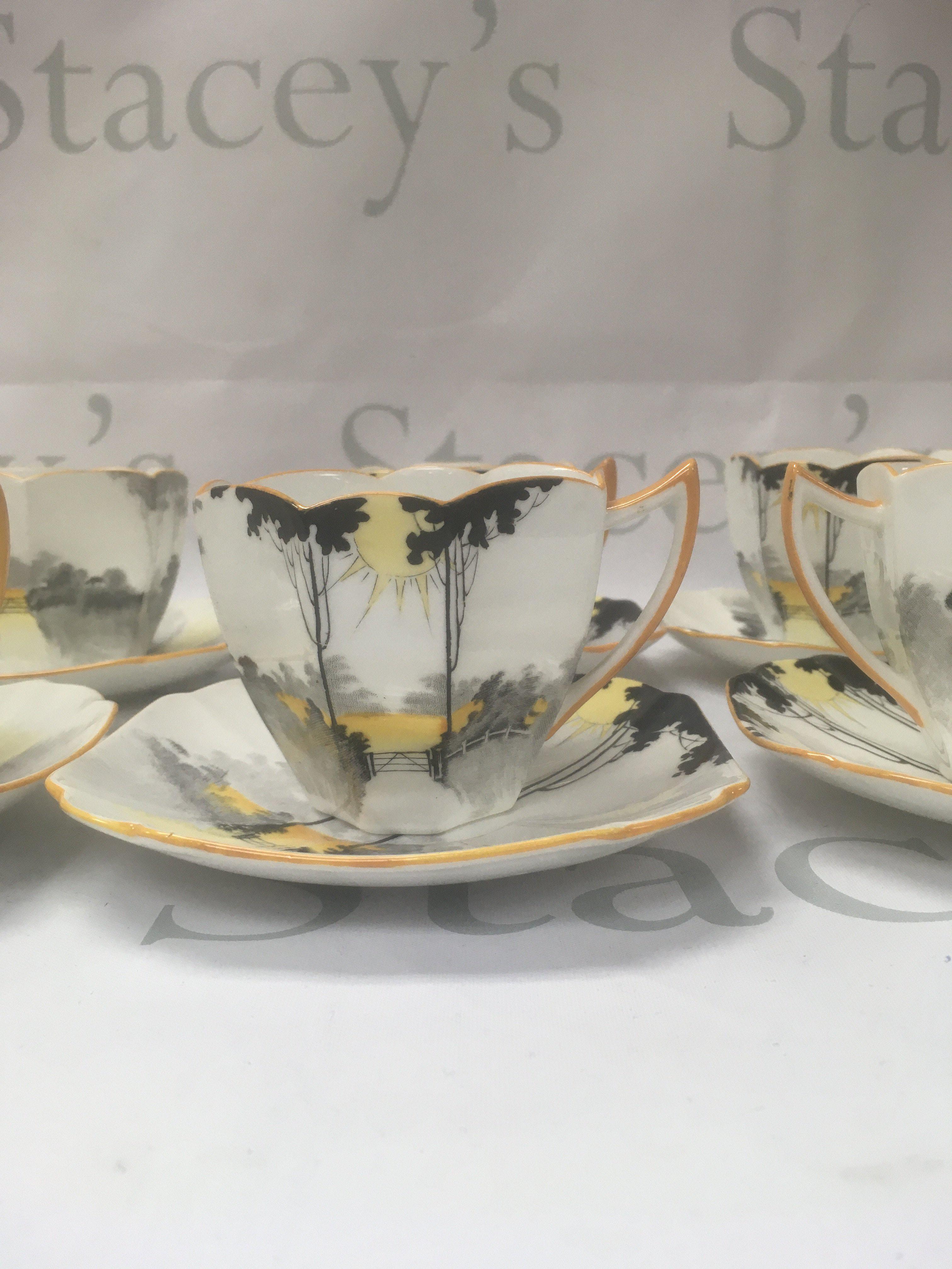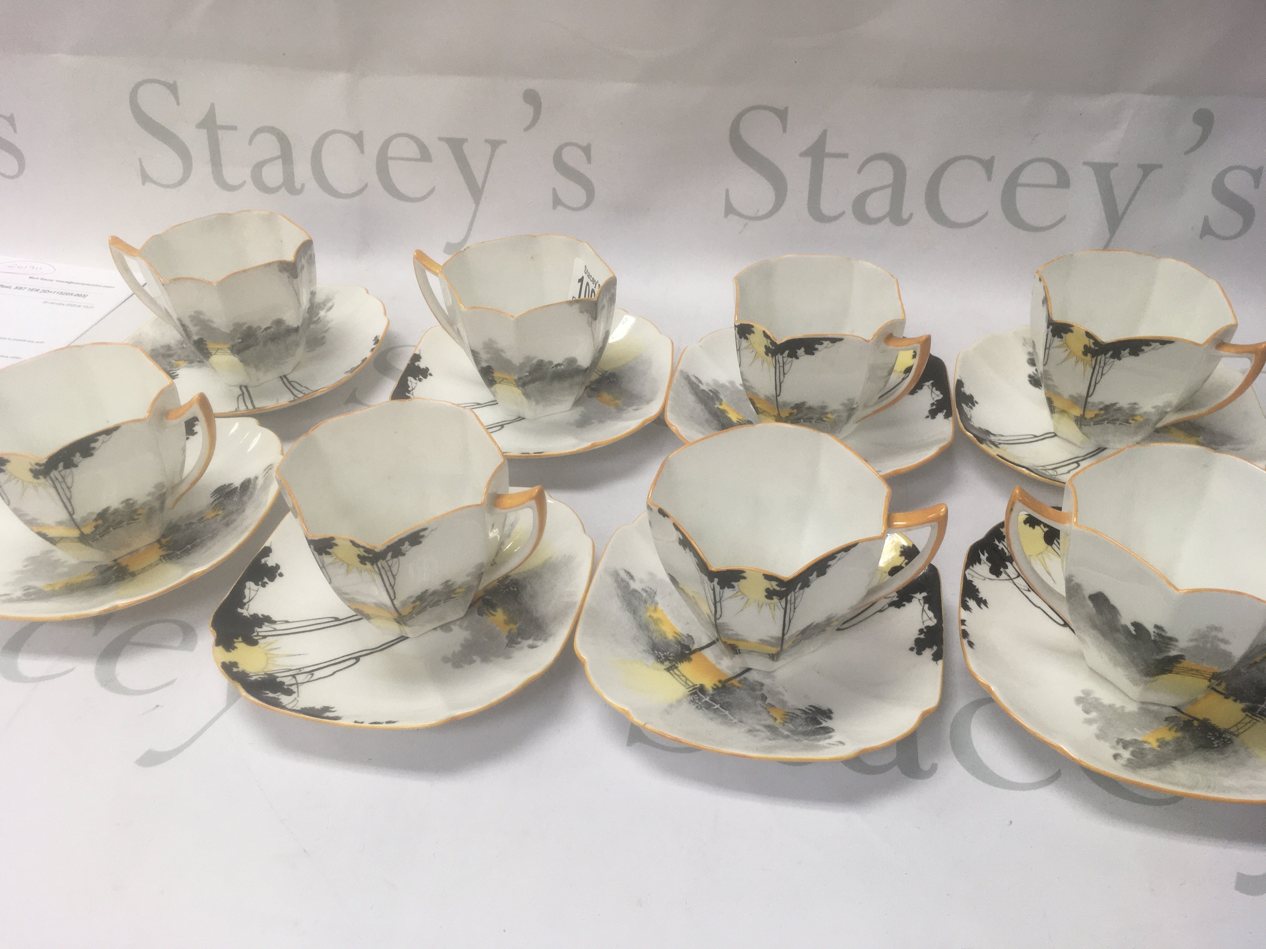 A set of eight Shelly cups and saucers Tall trees sunset pattern.