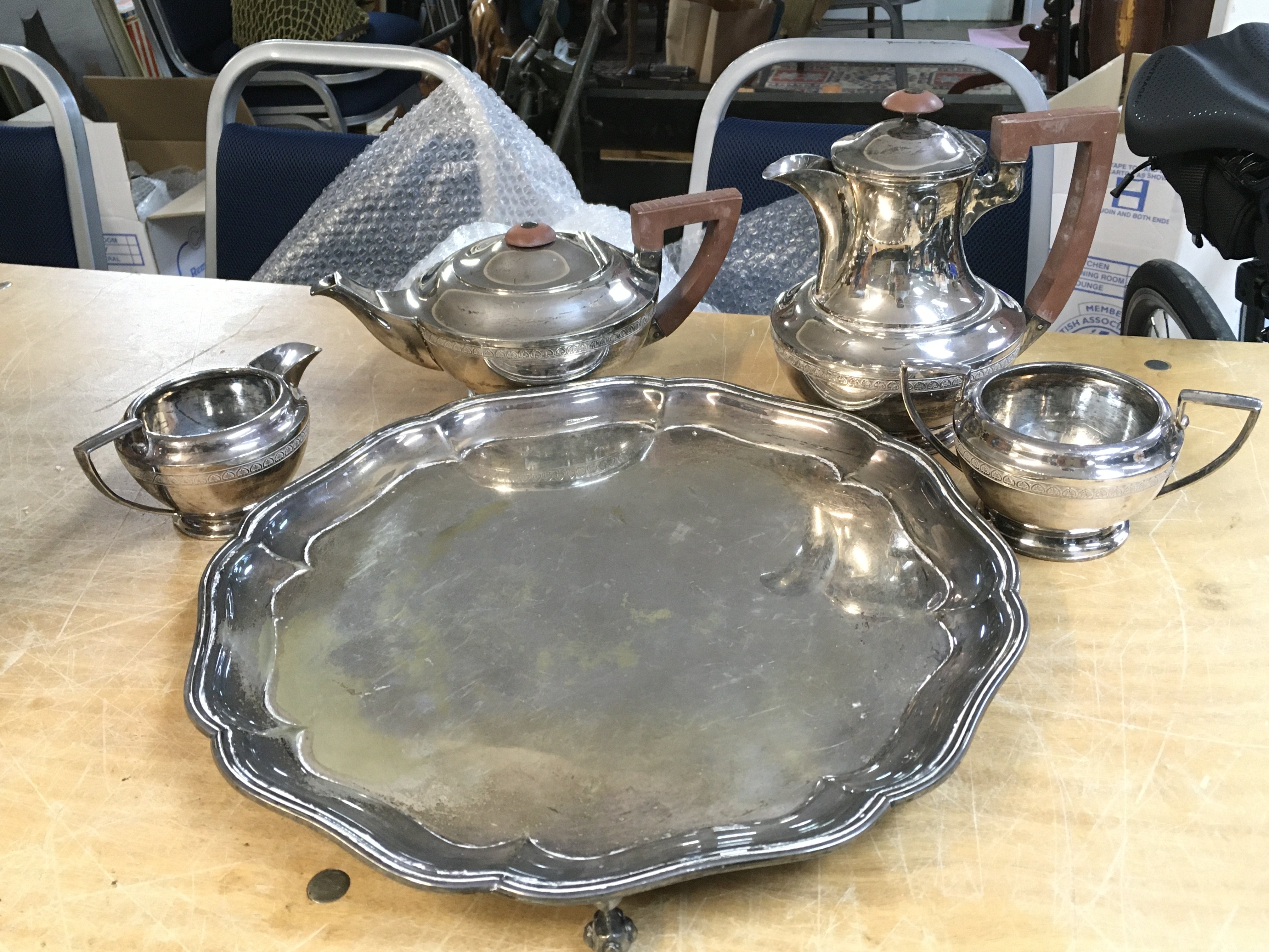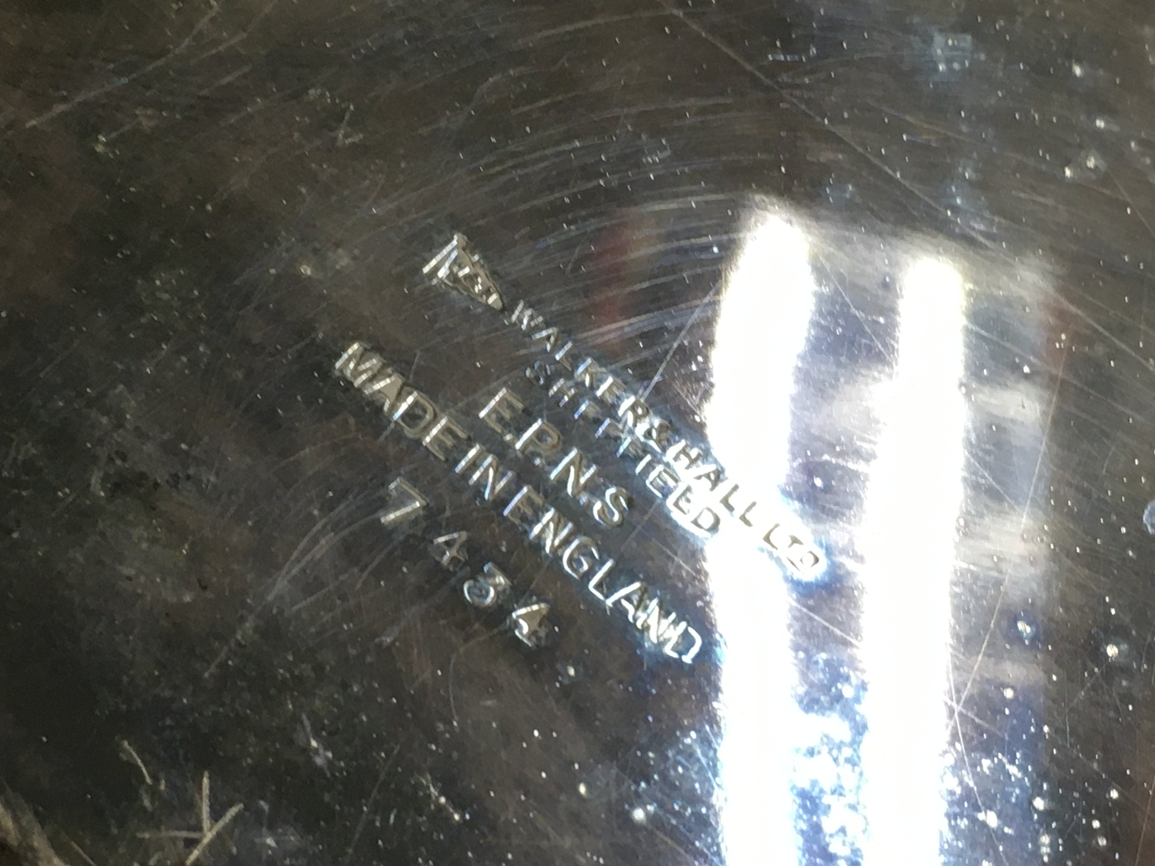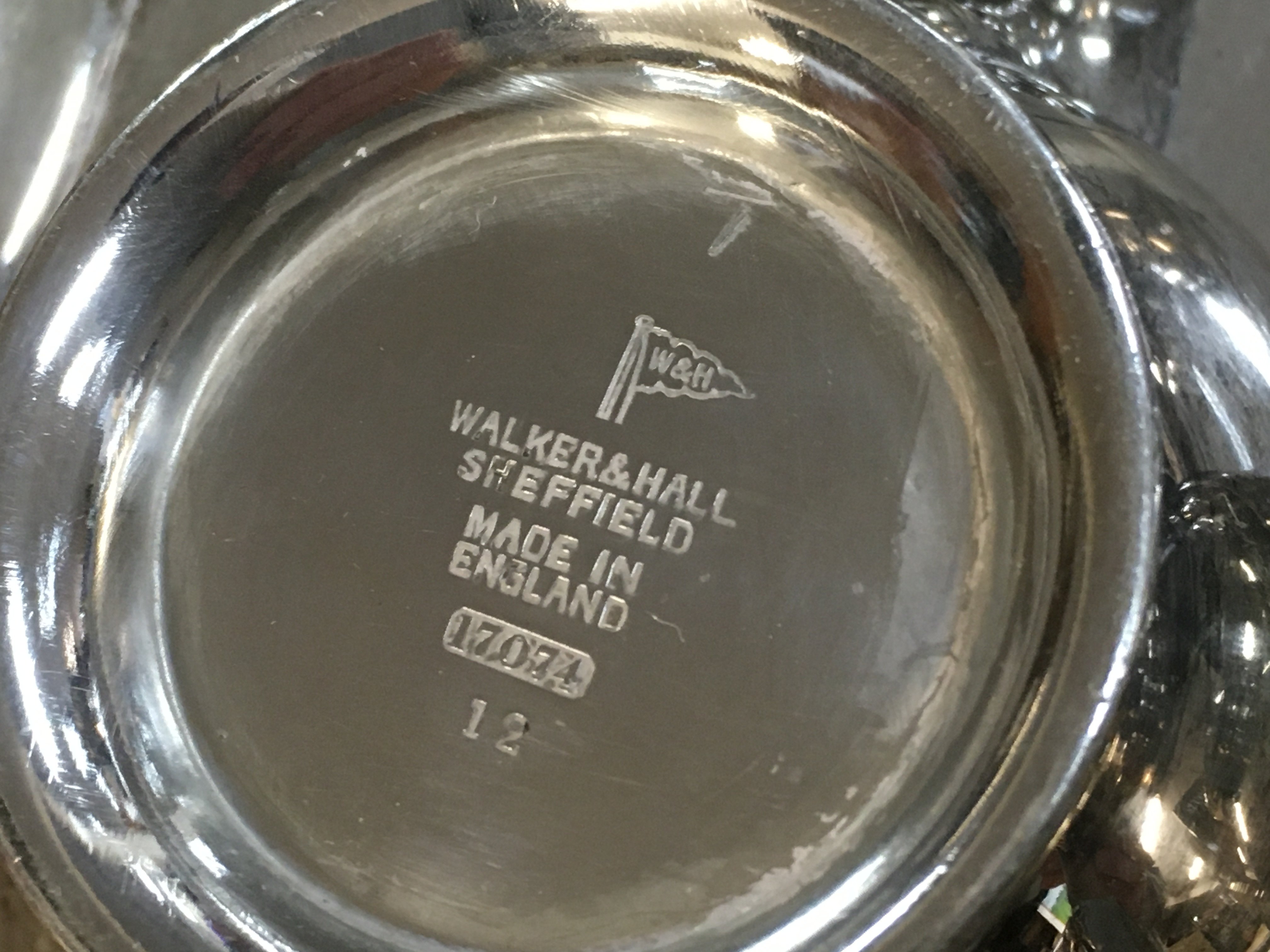 A collection of silver plate including a Walker & Hall teaset and a dish