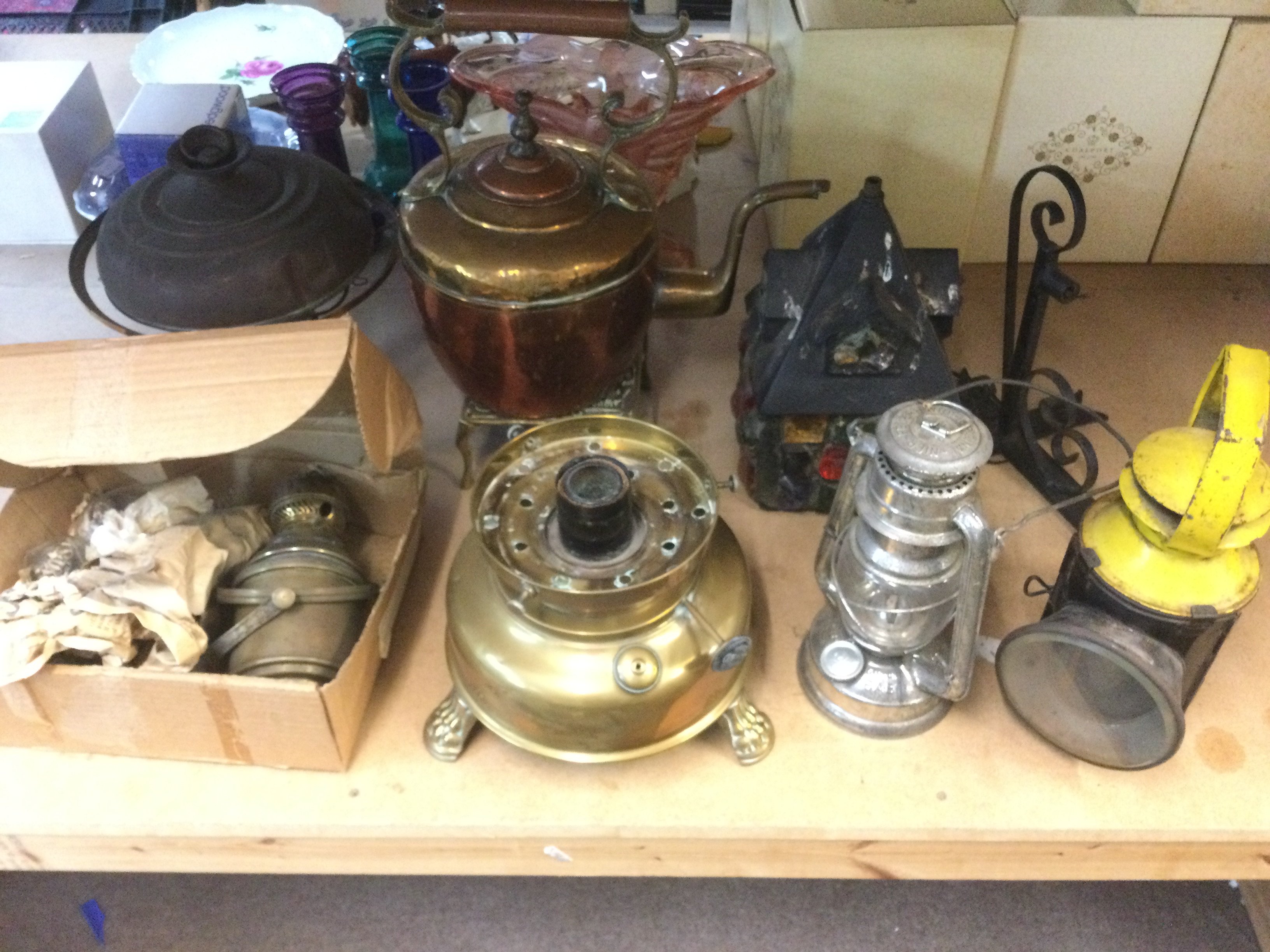 A brass kettle on stand, oil lamp accessories, railway lamp Shipping category D.