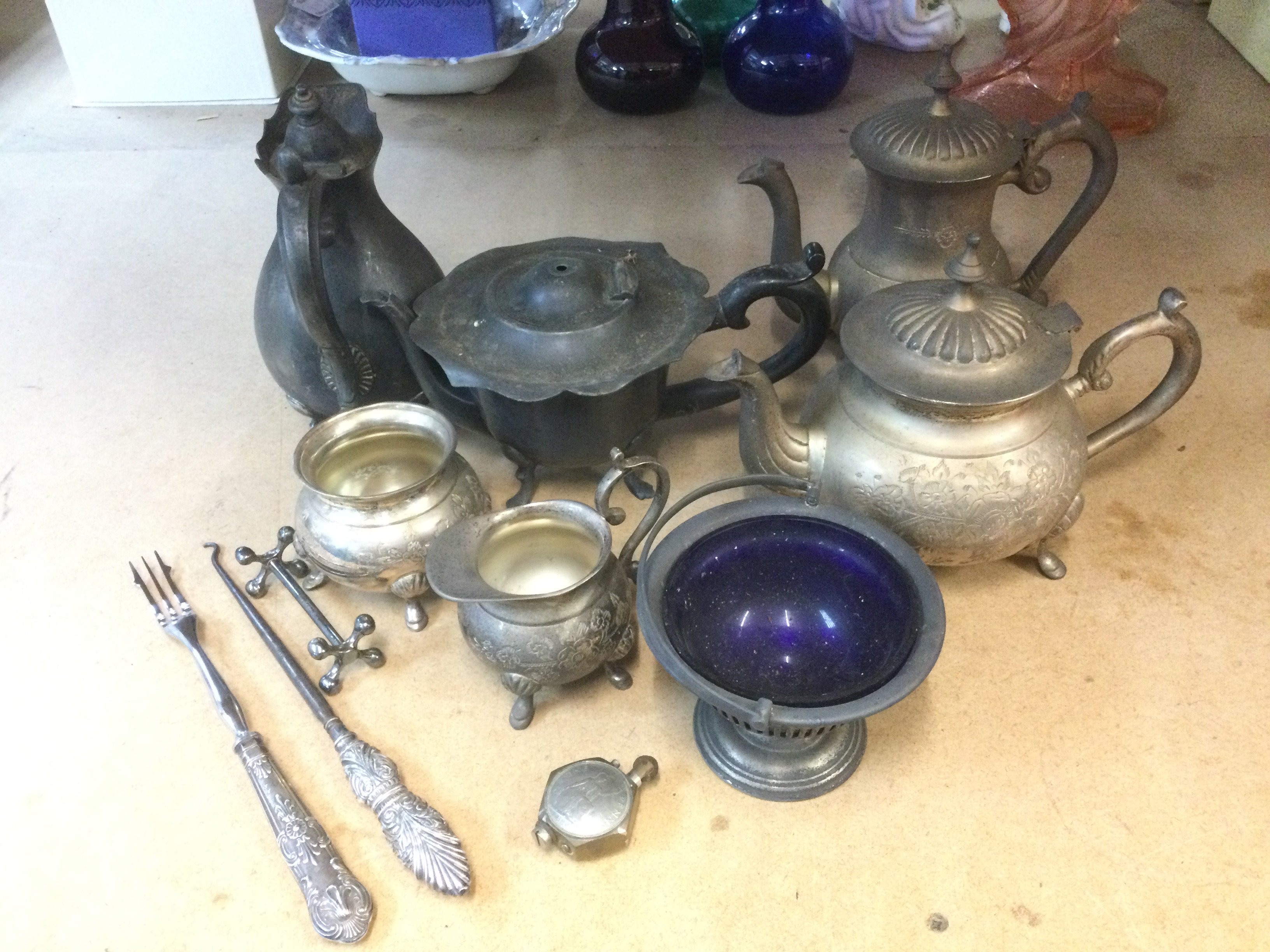 A silver handled button hook and toasting fork plus other metalware items. Shipping category D.