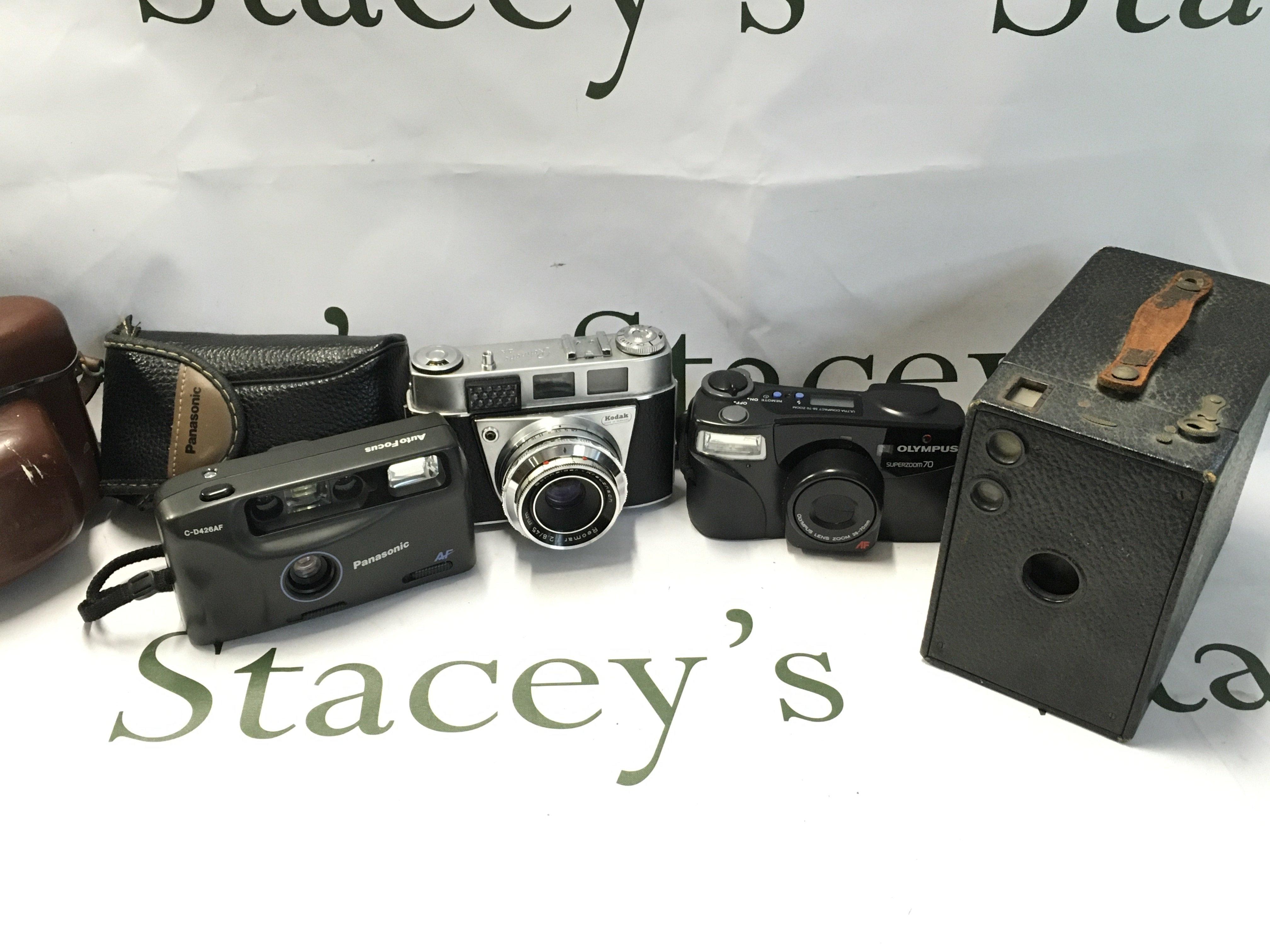 Vintage cameras including Panasonic C-D426AF, Brownie, Olympus super zoom 70, Kodak Retinette,
