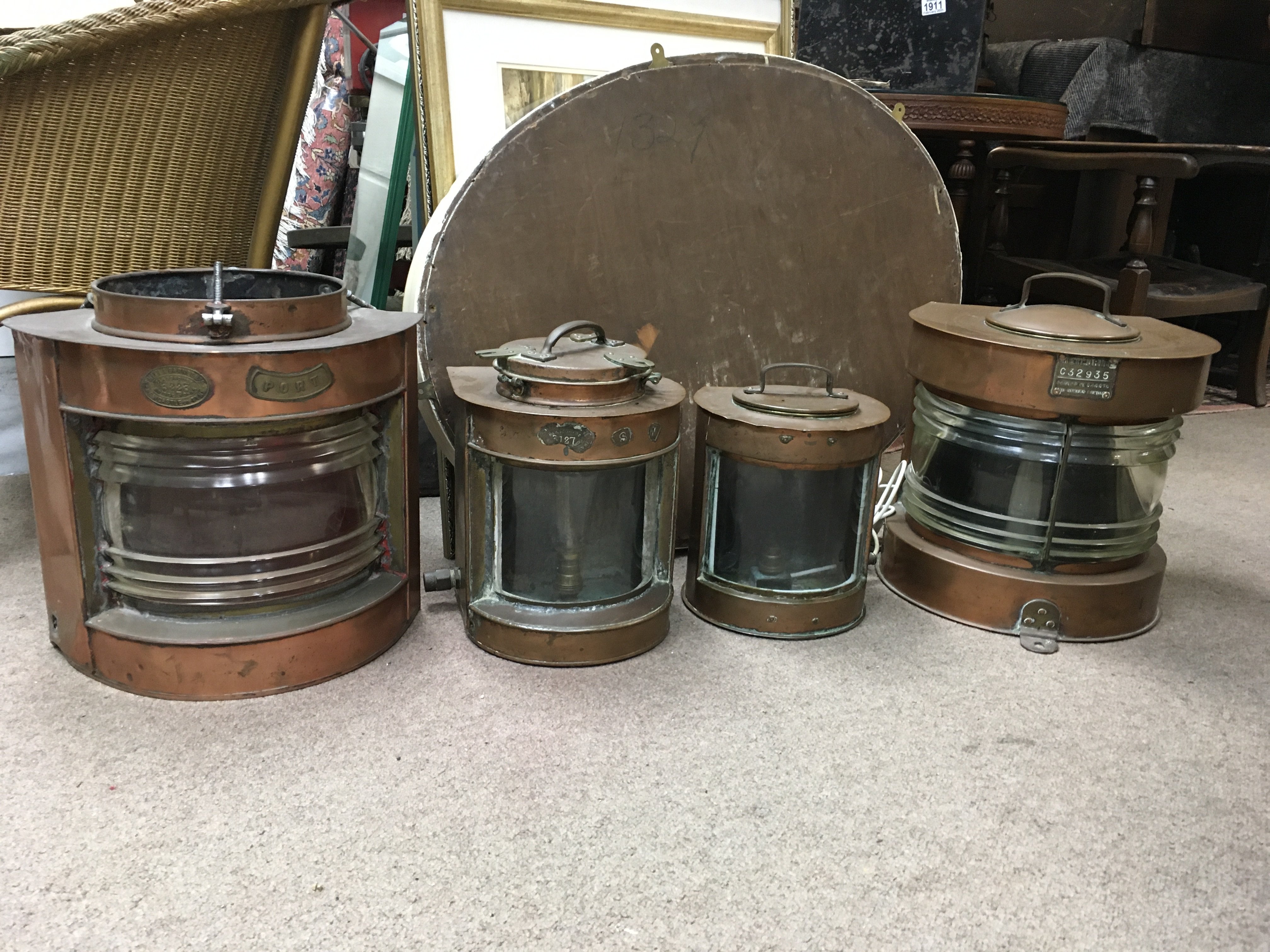A collection of brass lamps including Masthead Meteorite, smith & Barnes port etc