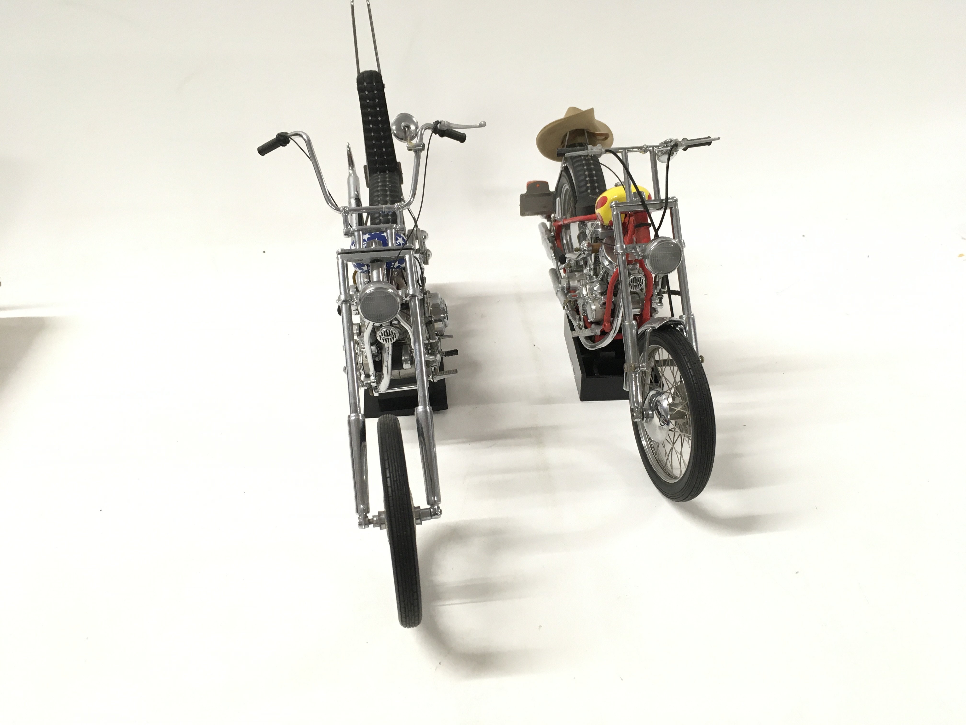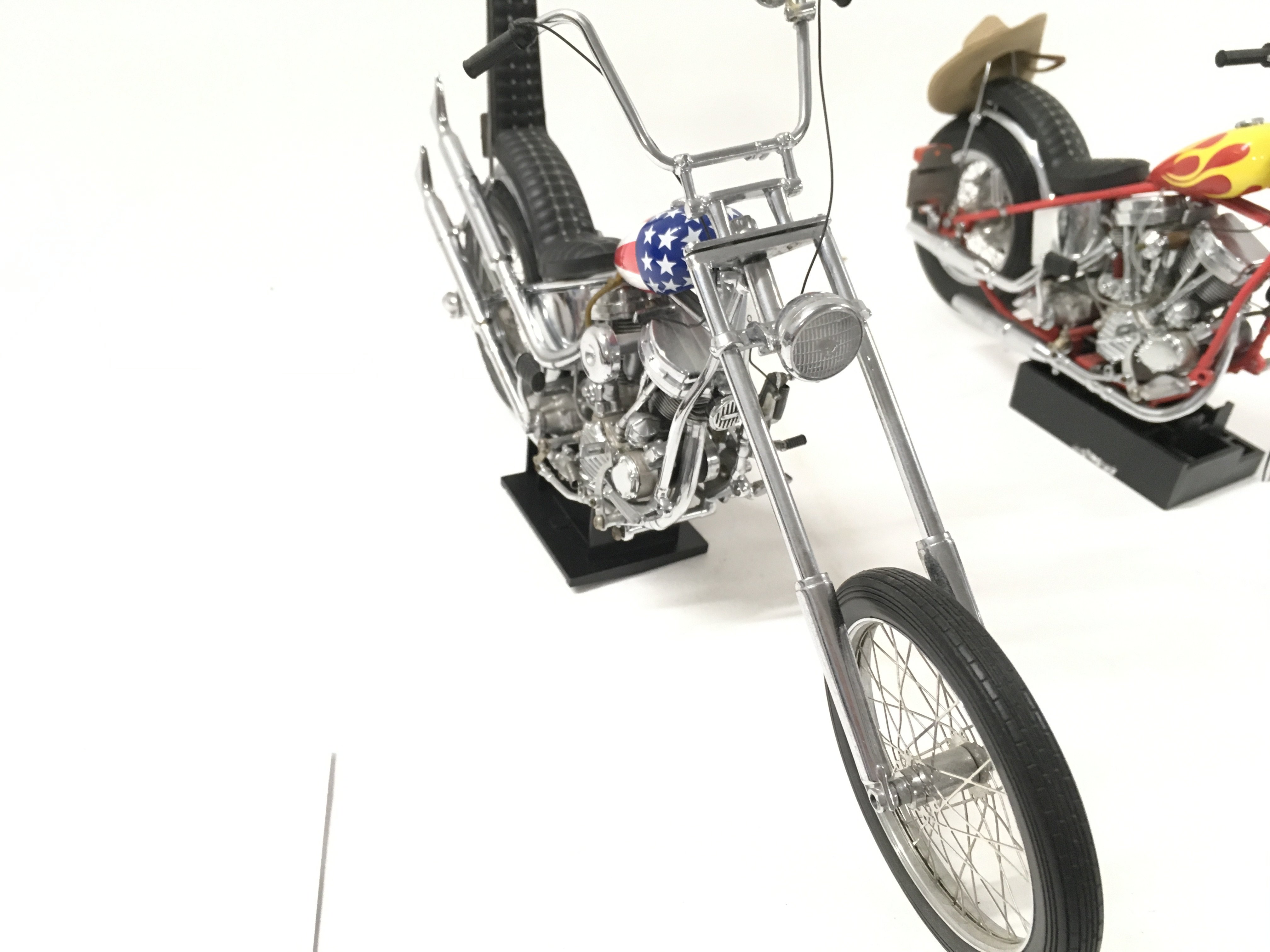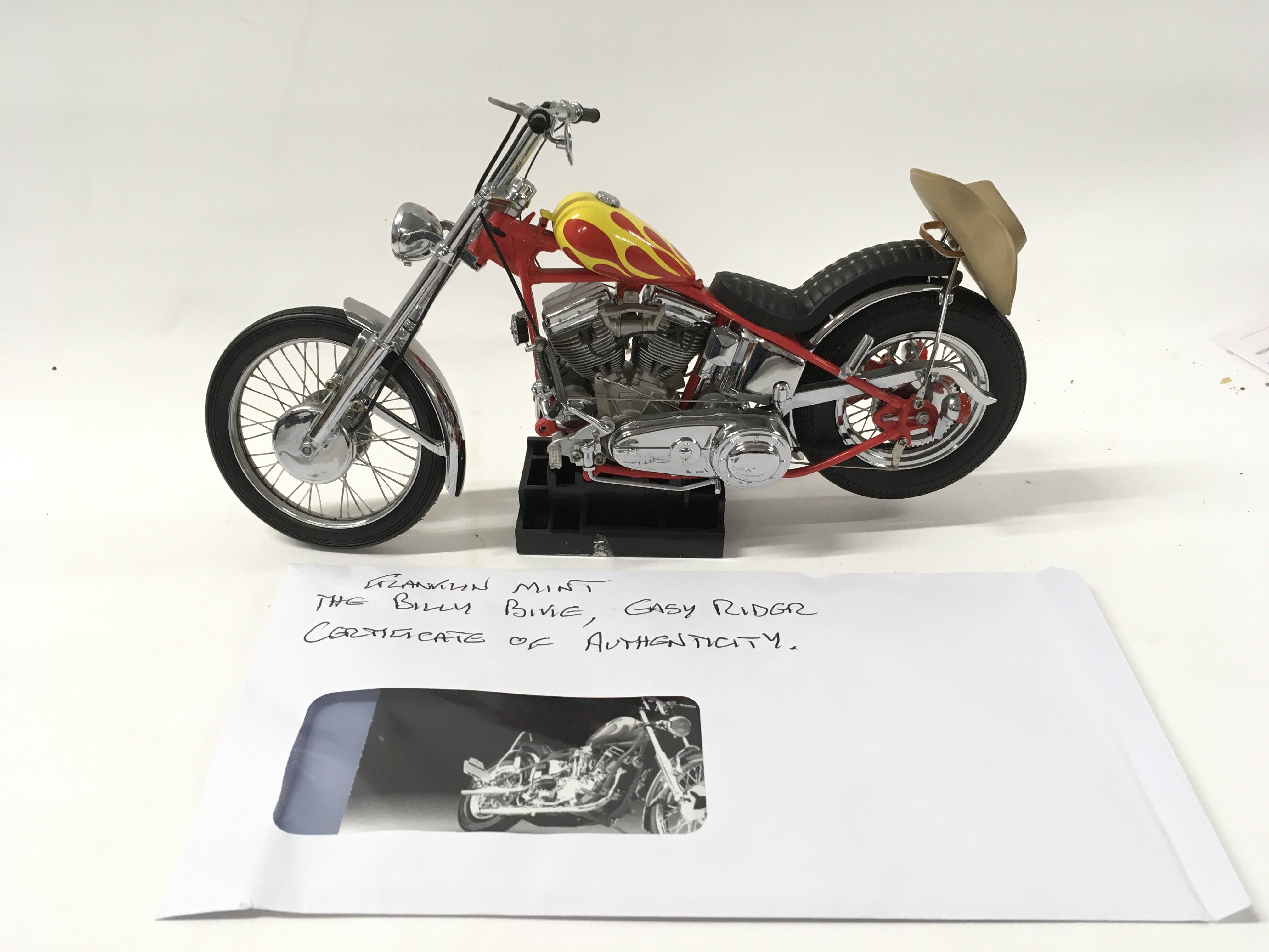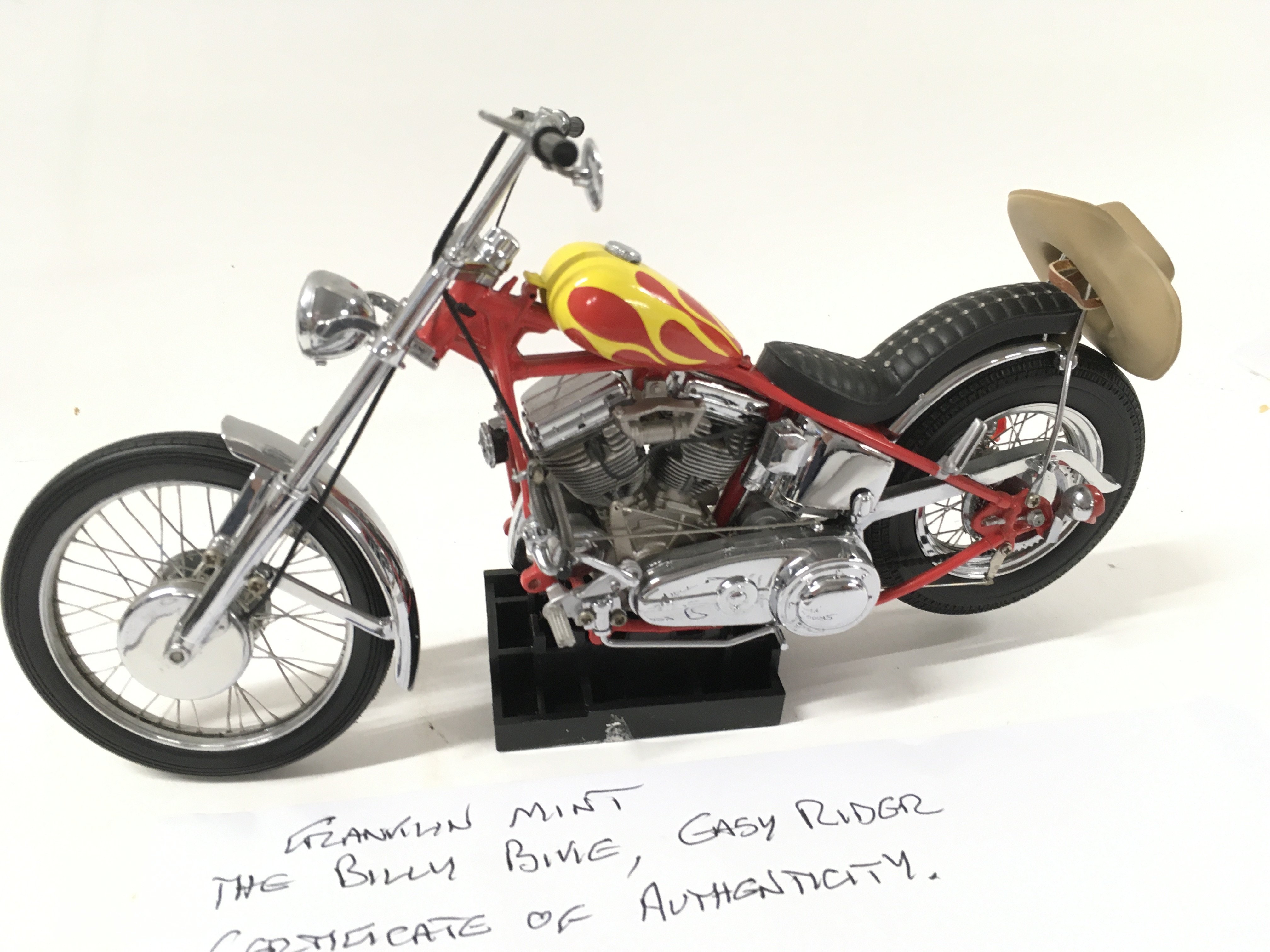 A pair of Franklin mint Easy Rider Chopper Motorcycles from the Film EASY RIDER. includes Billy Bike 1969 panhead chopper flames tank 1:10 plus the hat .. also 1:10 scale Captain America Harley Davidson Stars and Stripes tank. both COAs.