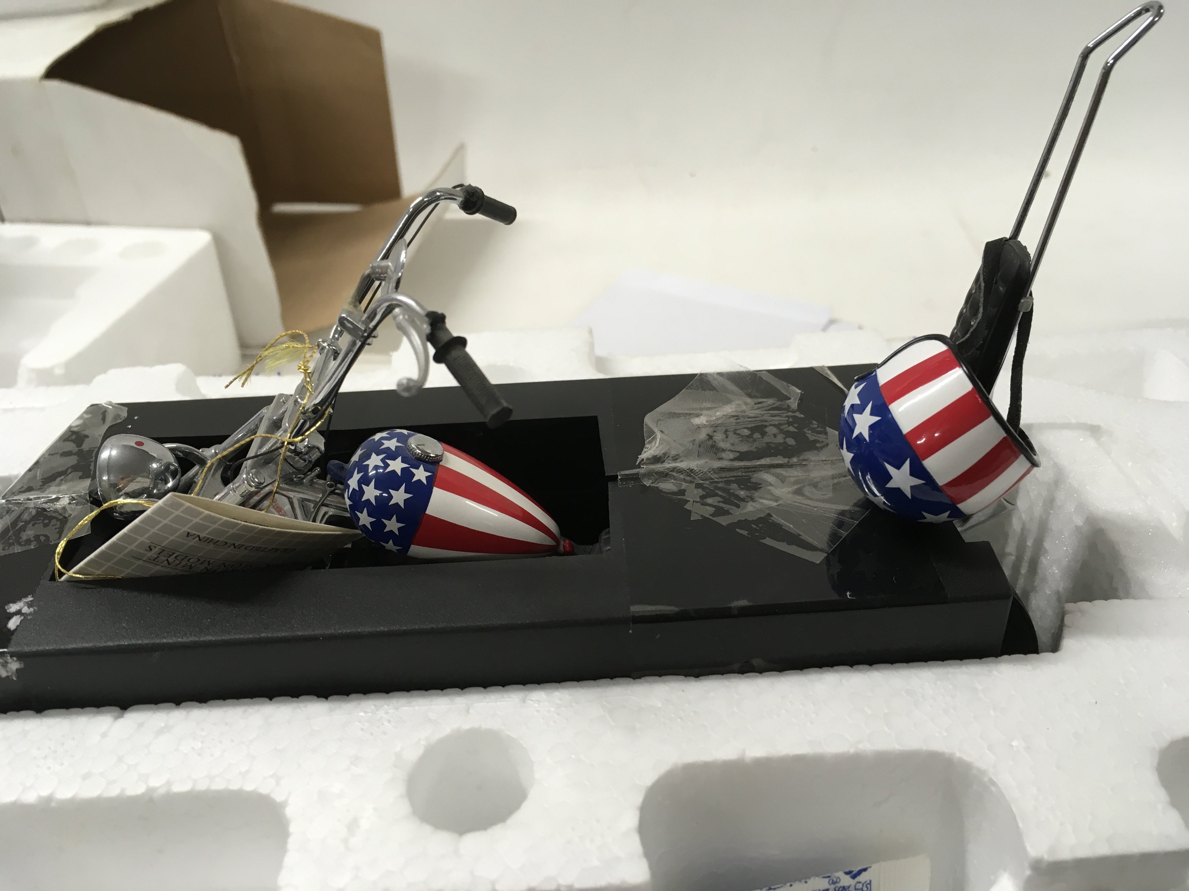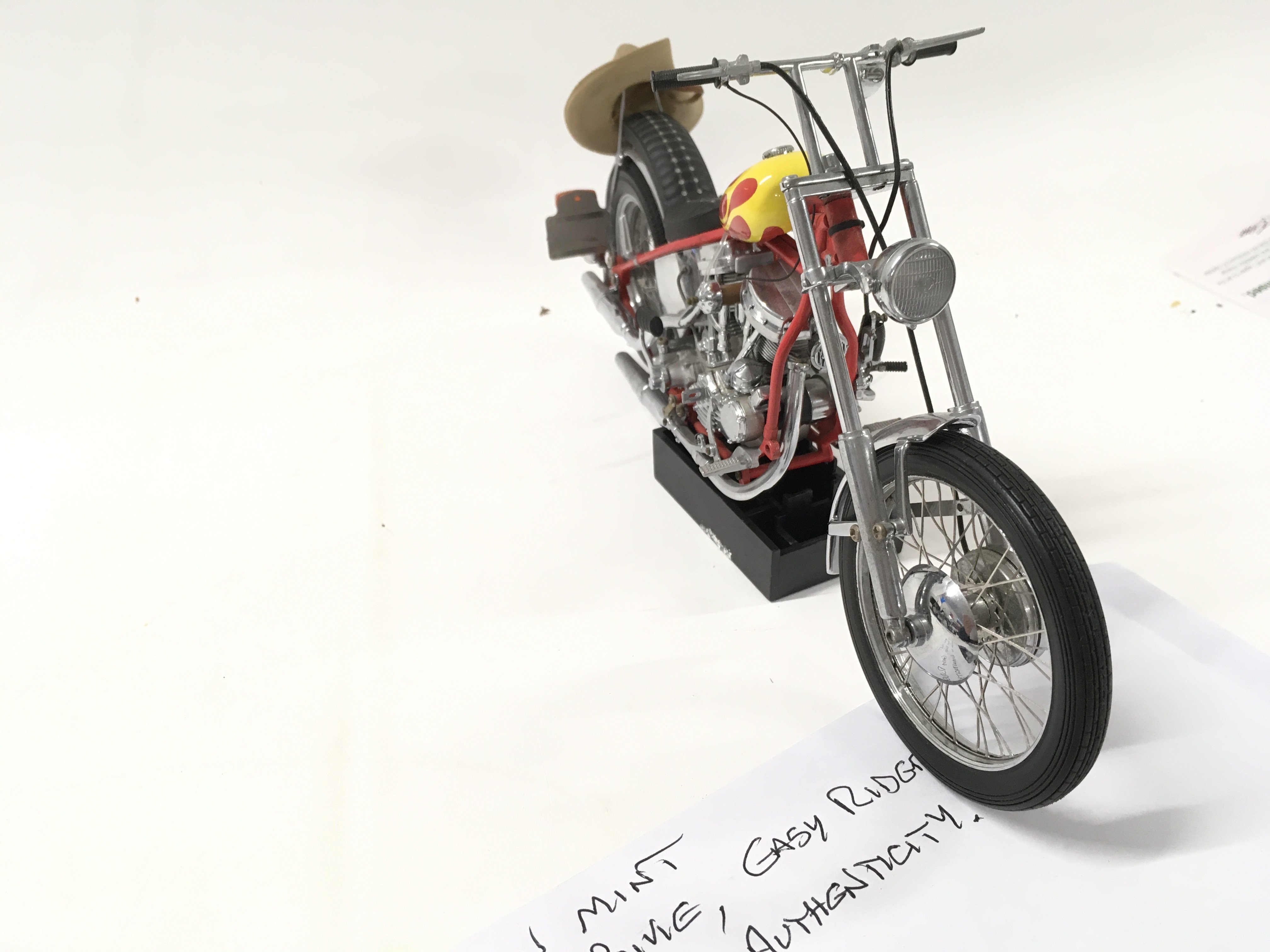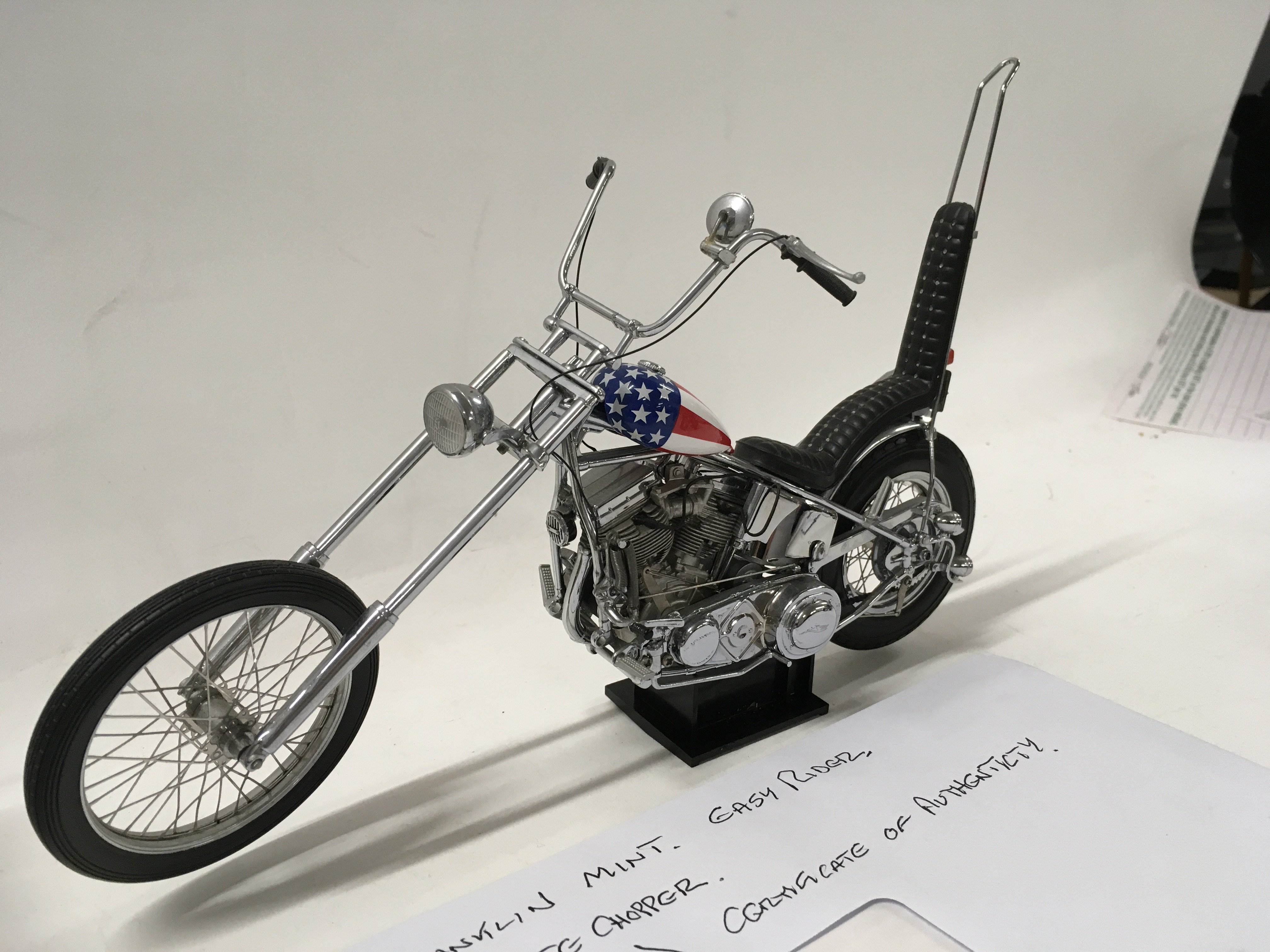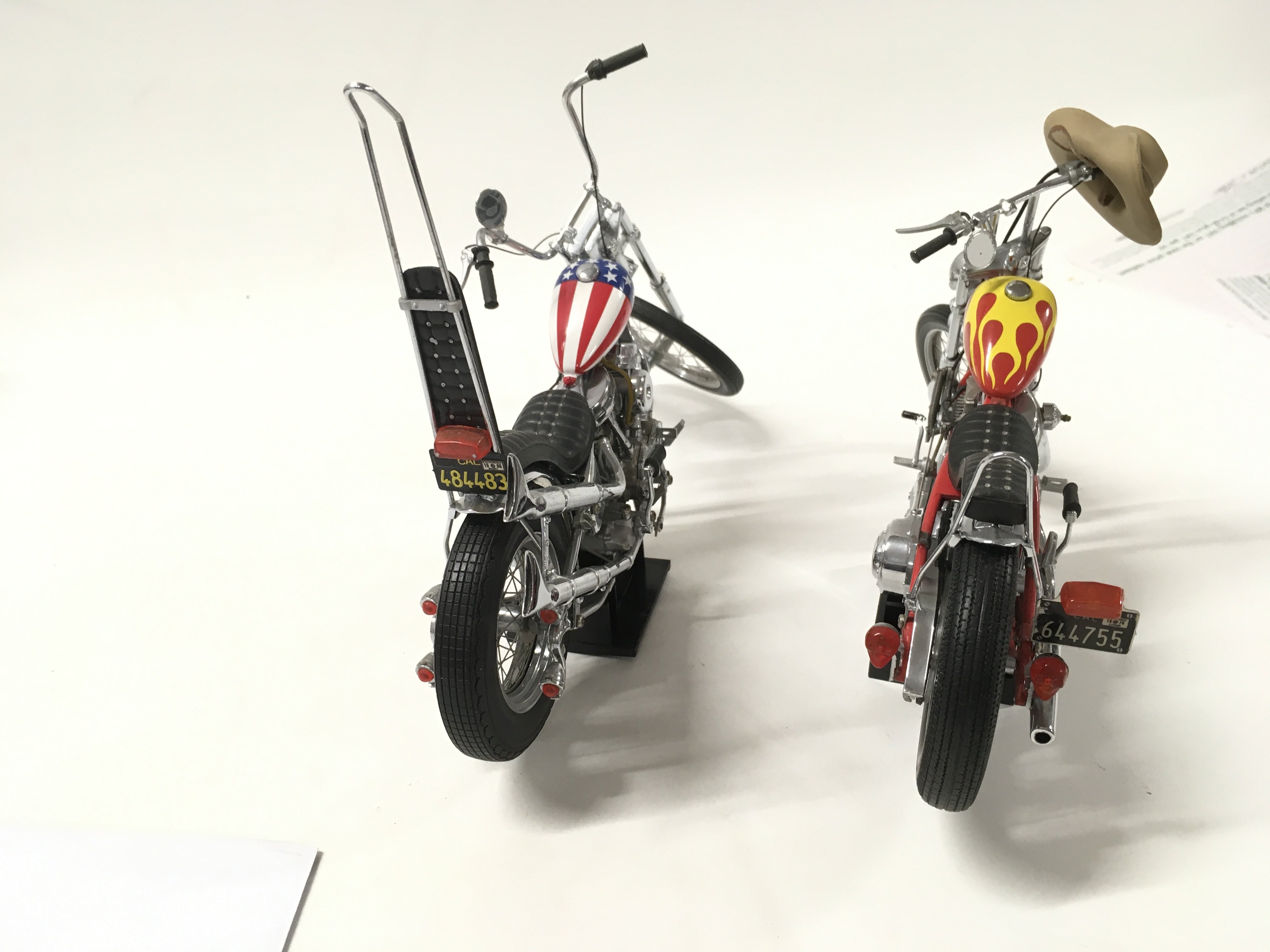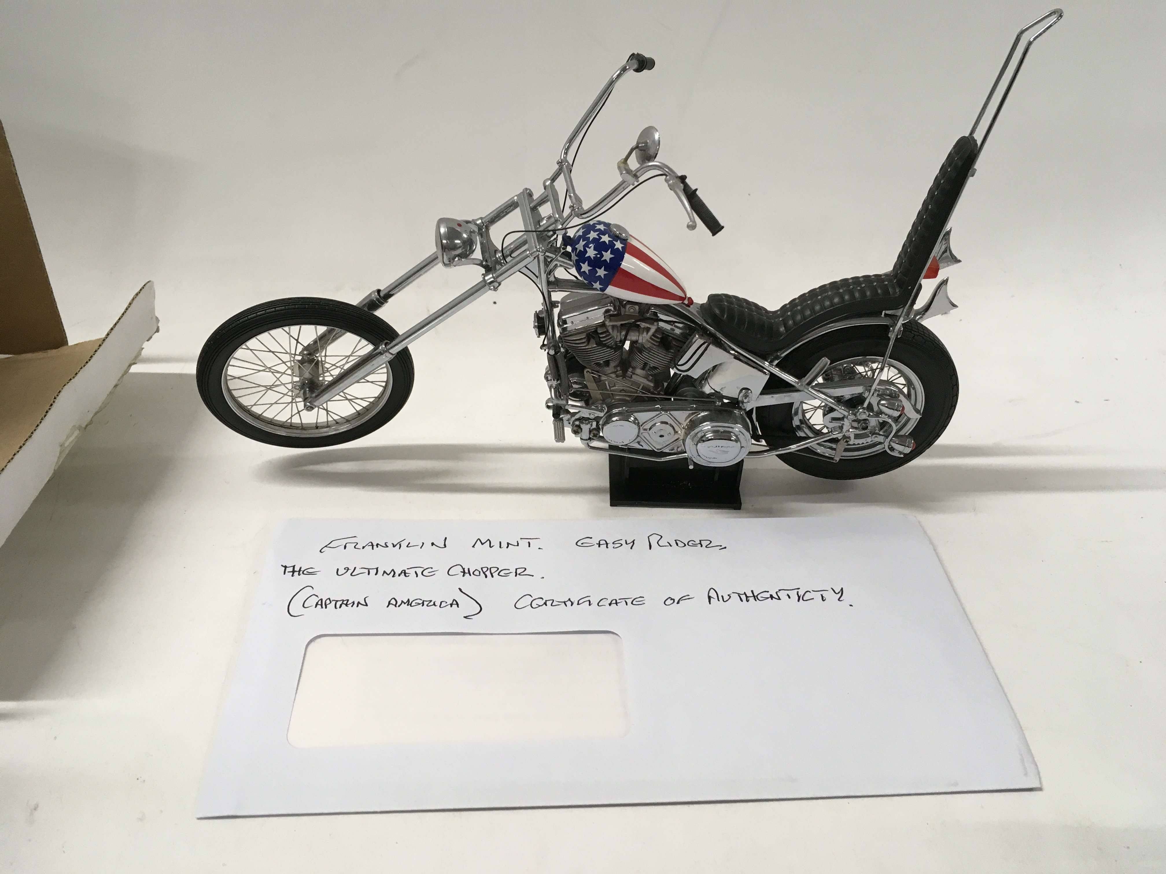 A pair of Franklin mint Easy Rider Chopper Motorcycles from the Film EASY RIDER. includes Billy Bike 1969 panhead chopper flames tank 1:10 plus the hat .. also 1:10 scale Captain America Harley Davidson Stars and Stripes tank. both COAs.
