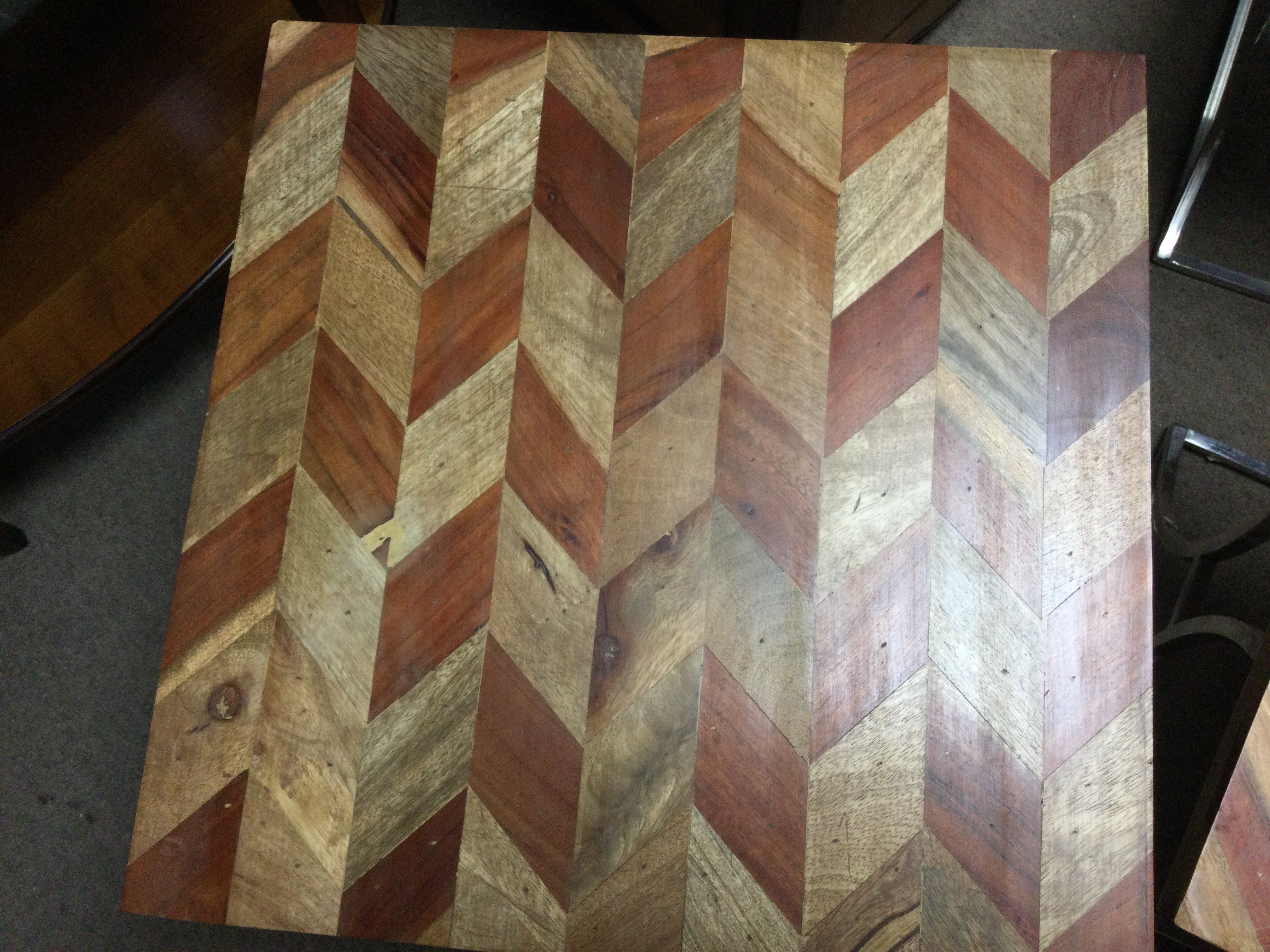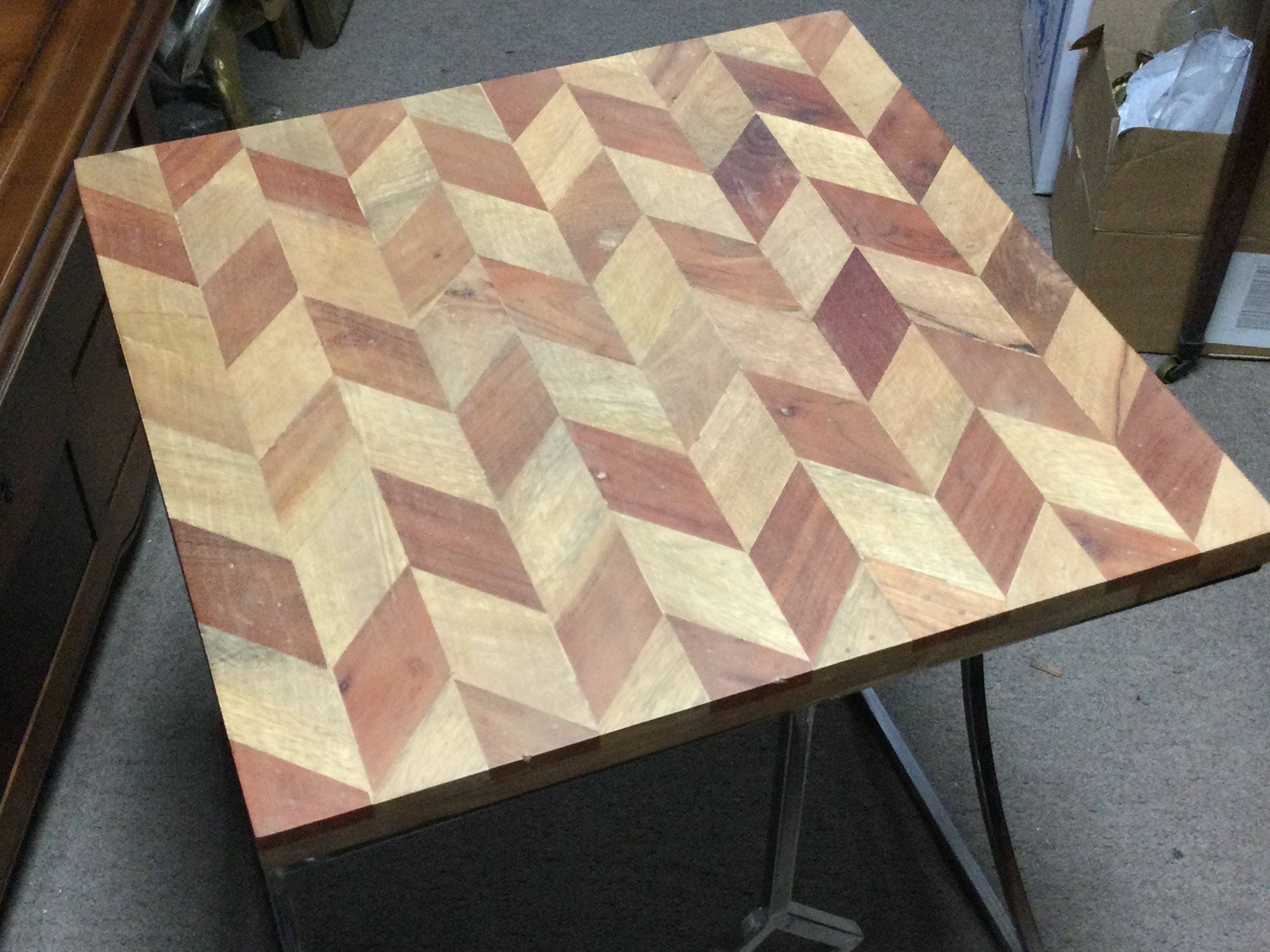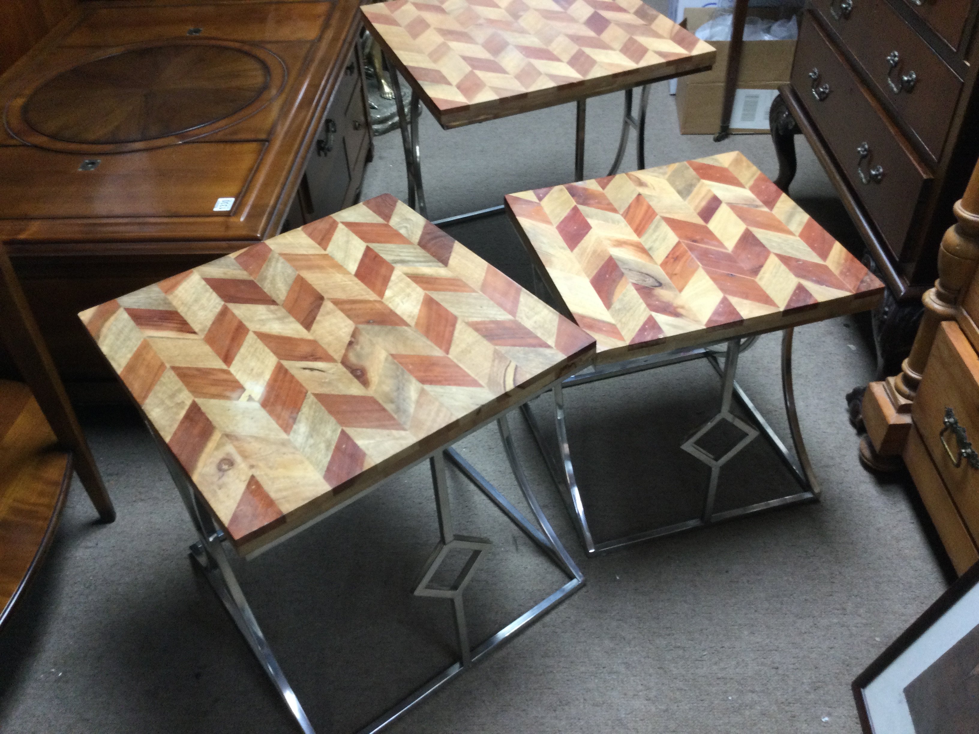 A nest of Art Deco style chrome tables with patterned design top. Biggest table 51x51x54cm
