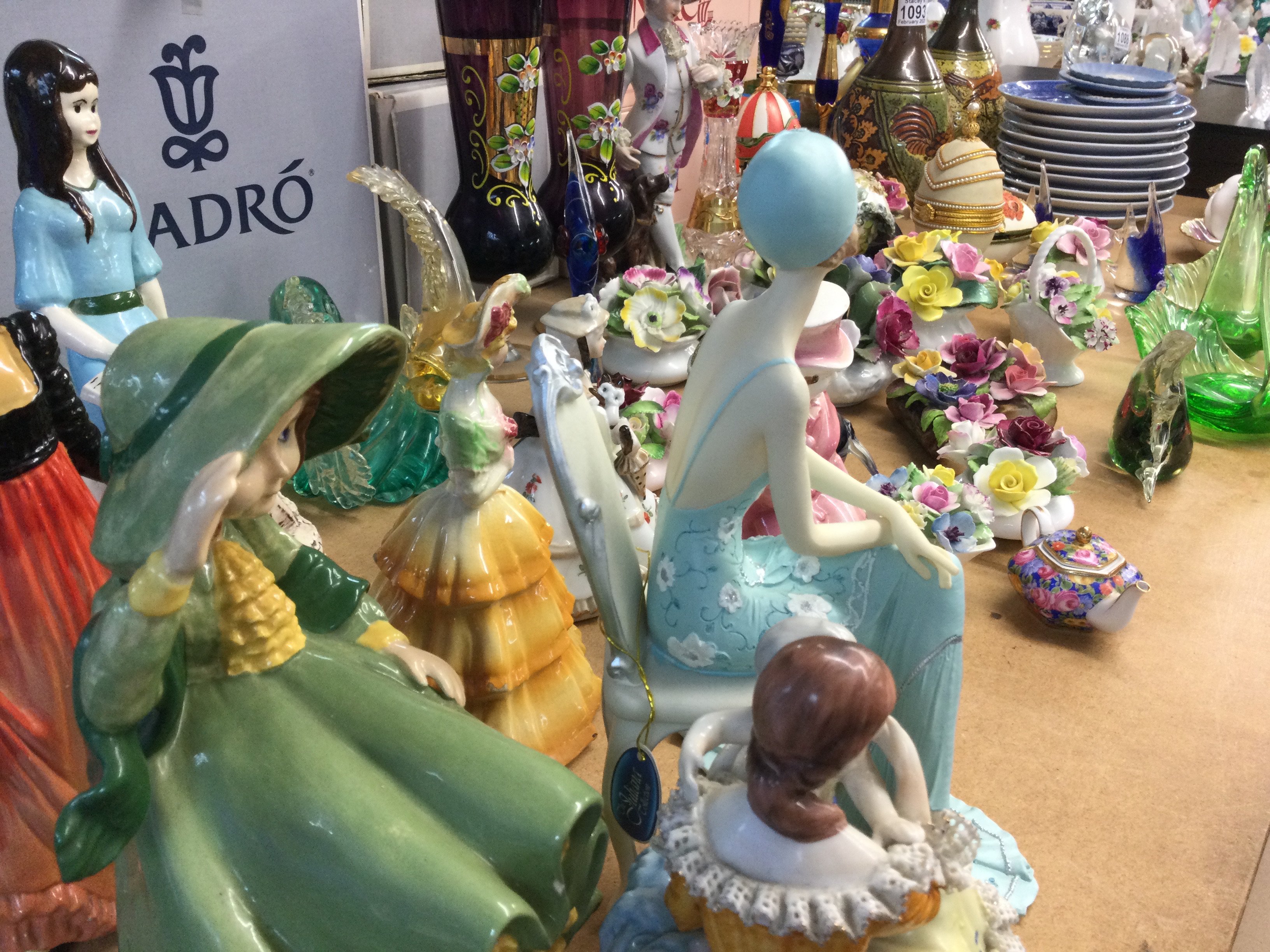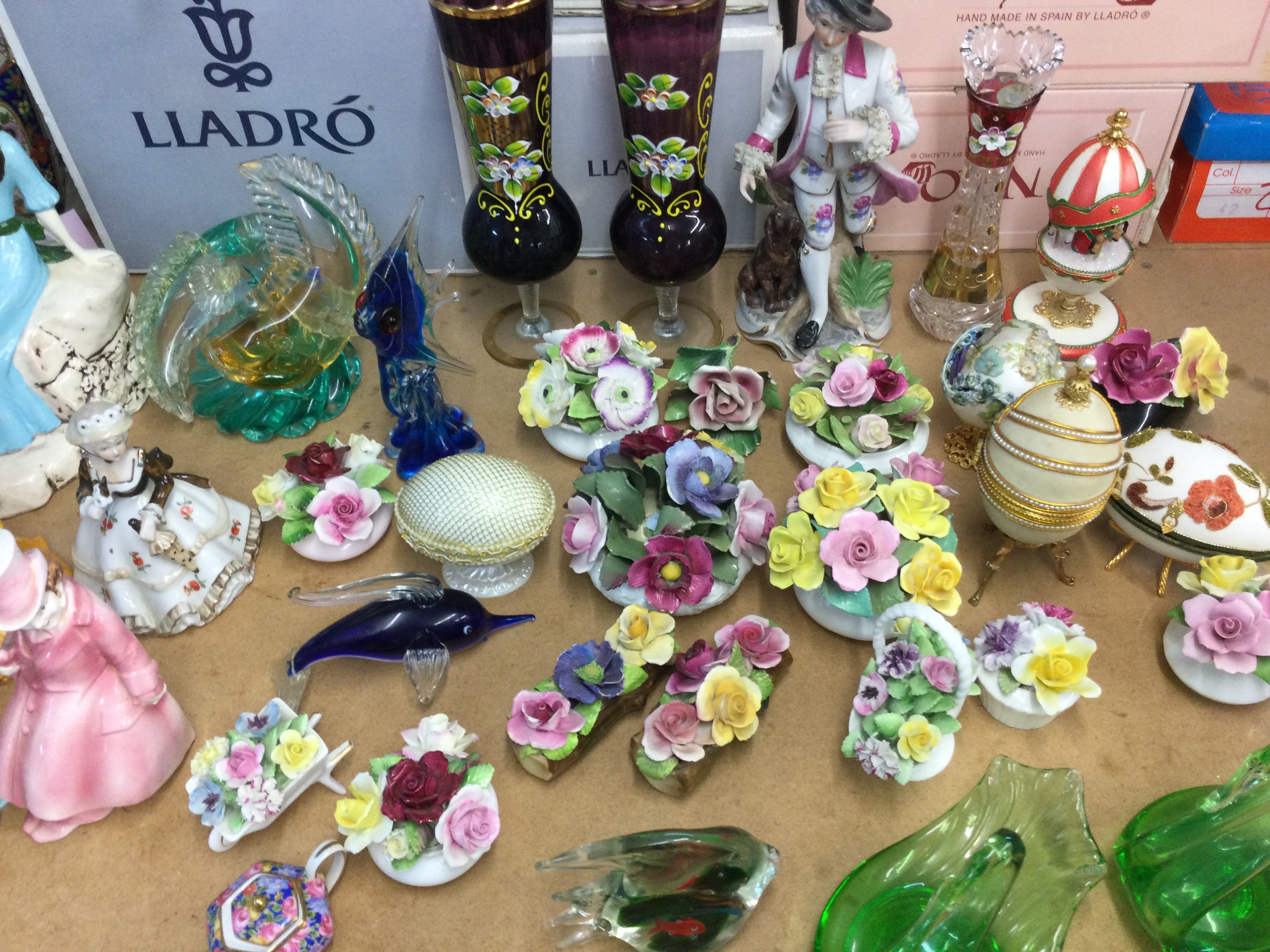 A Collection of ceramics including eggs, porcelain figures, Royal Doulton, Adderly, Lheathcote flower vases , coloured art glass figures etc. this lot cannot be posted
