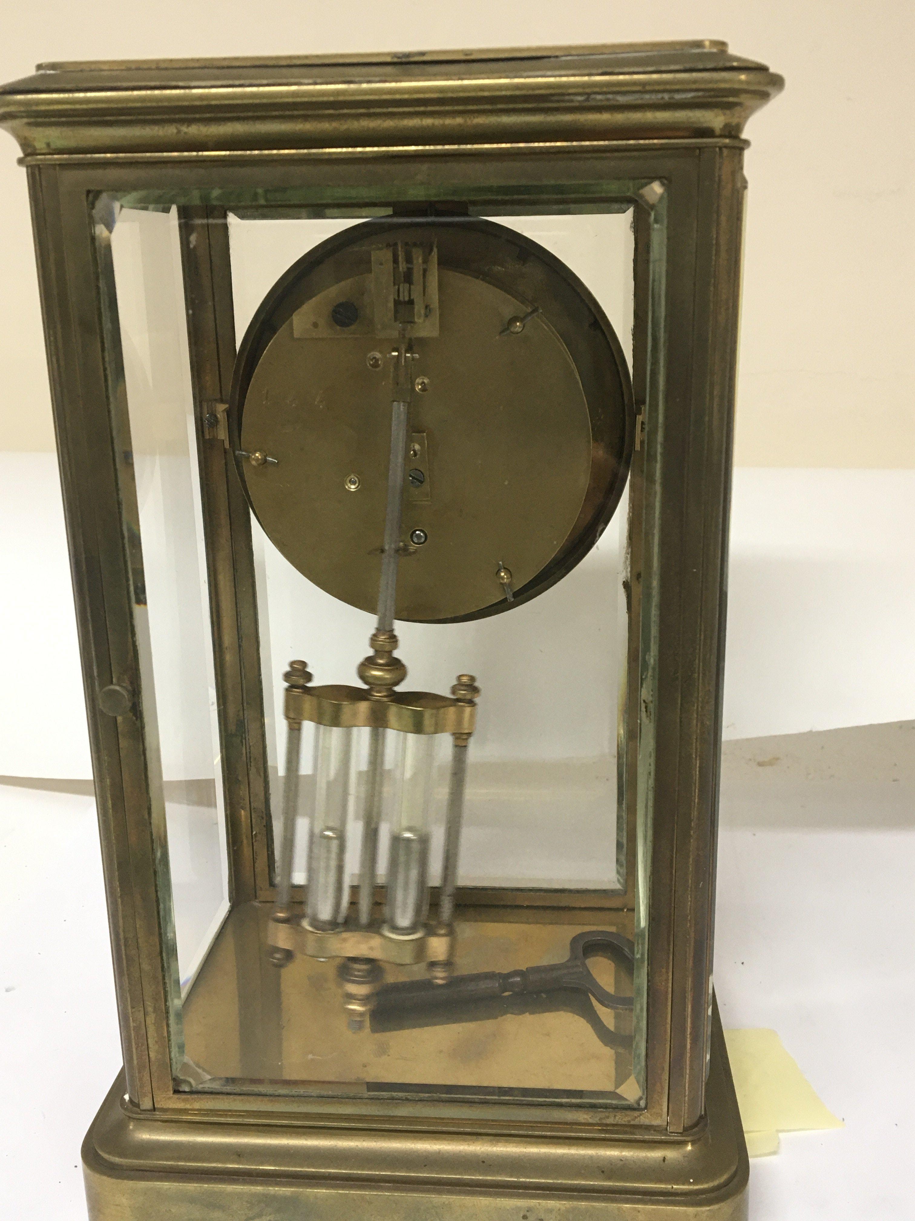 A brass four glass mantel clock with a mercury pendulum and white enamel dial. With key.