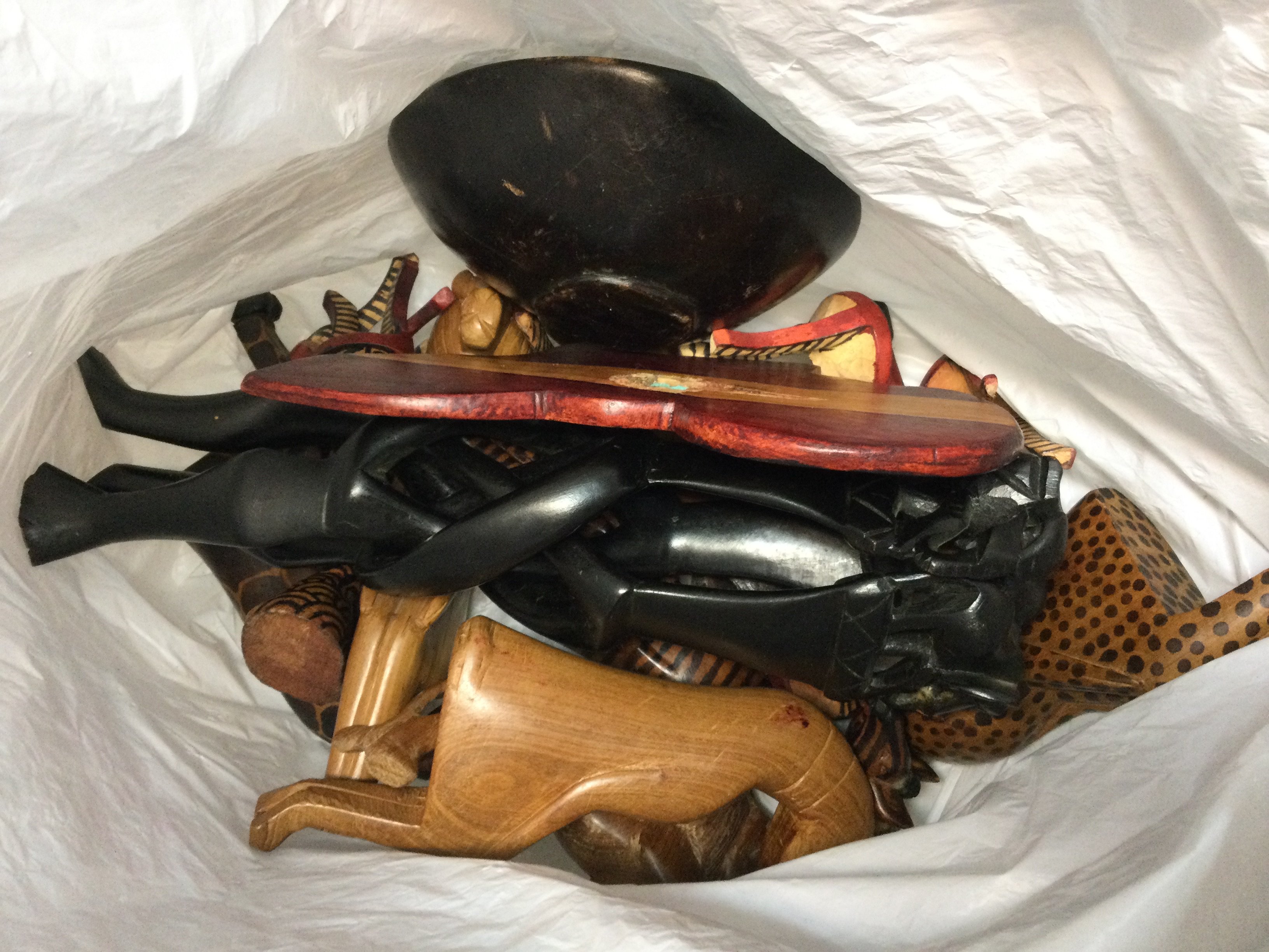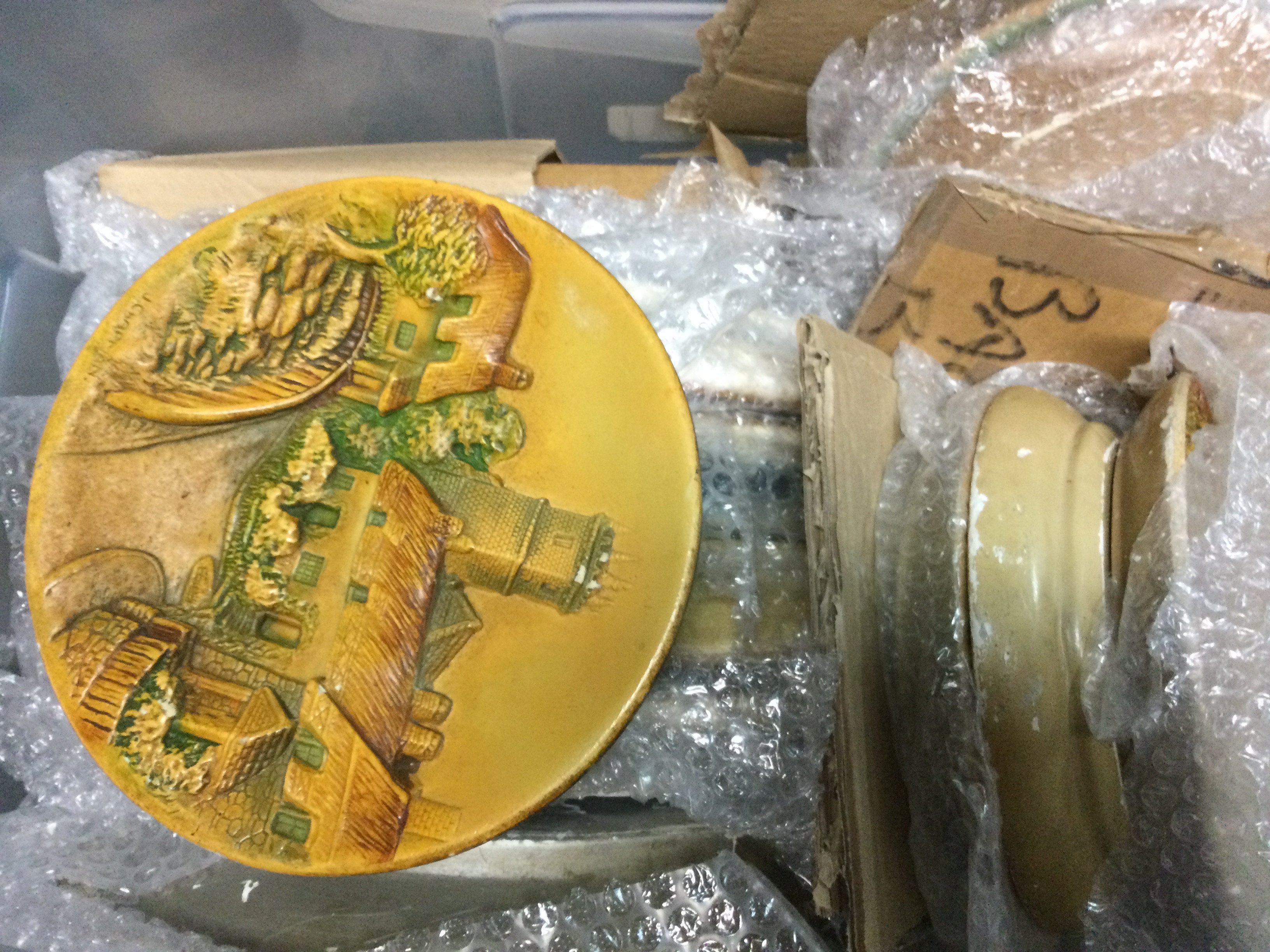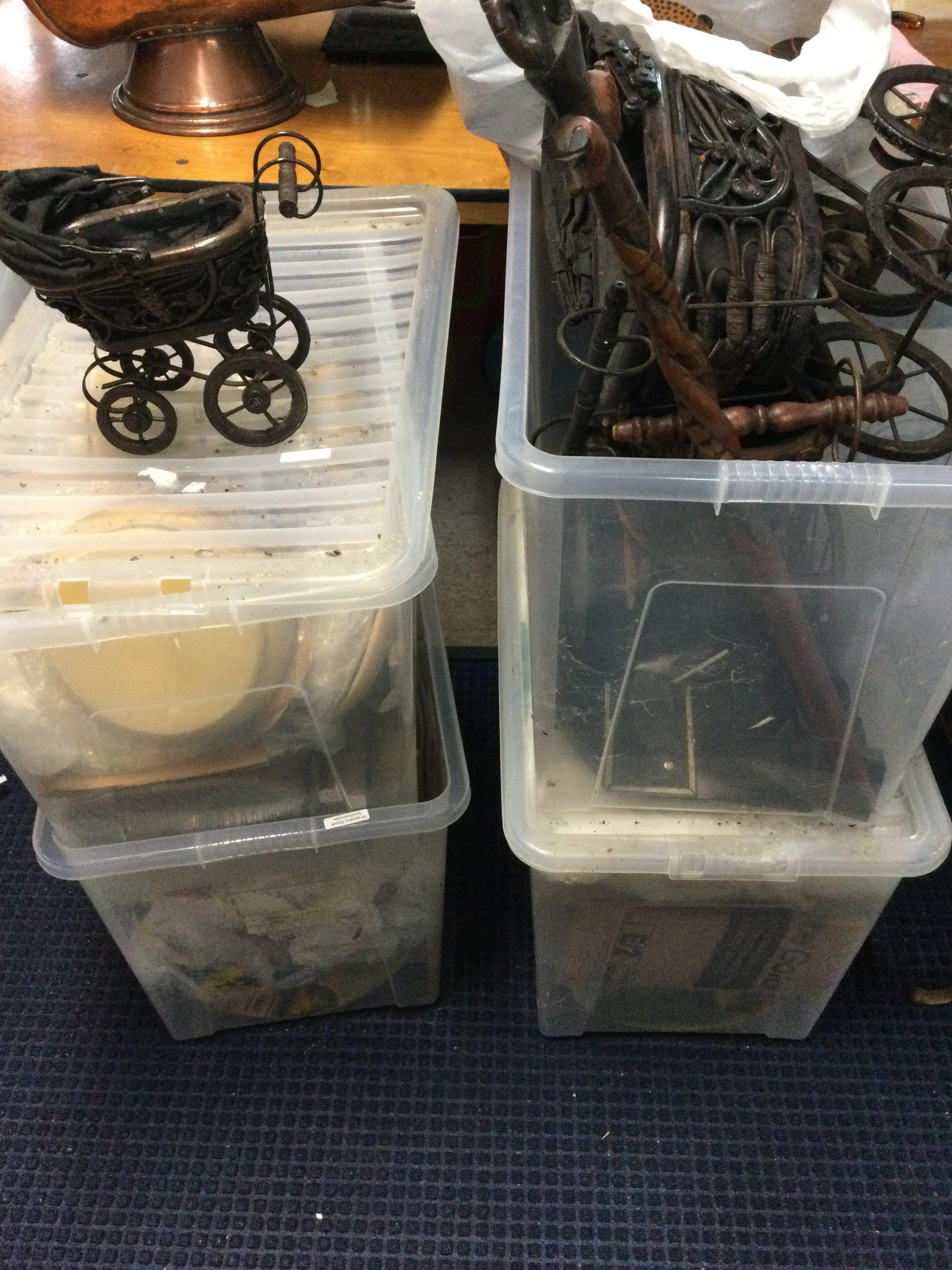 Fives boxes including ceramic cottage plates , miniature prams, wooden tribal art