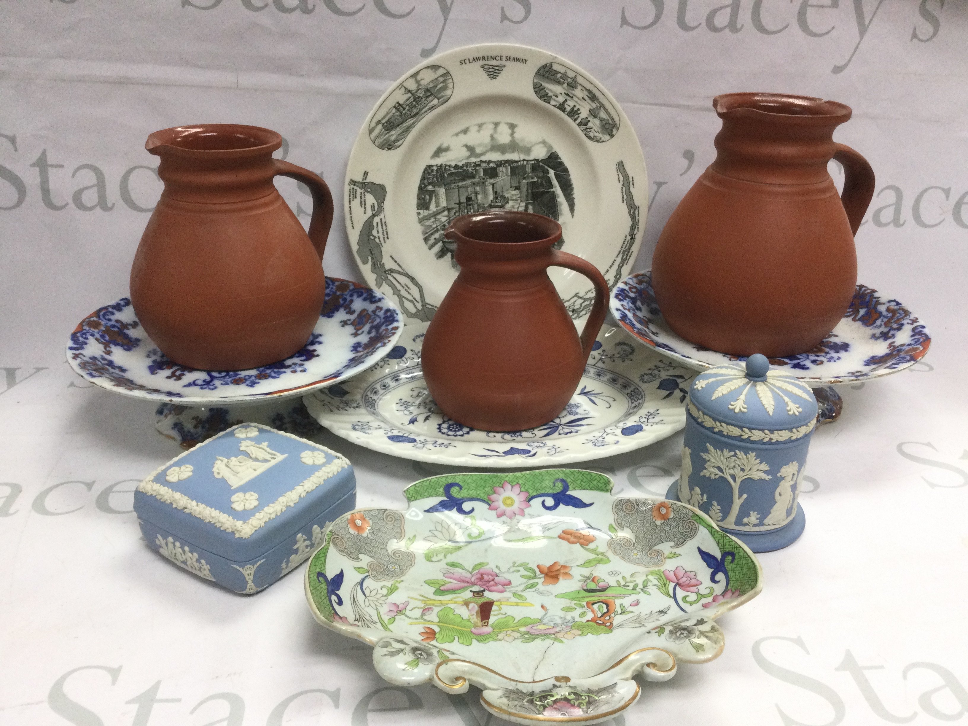 A collection of ceramics including three Wedgwood terracotta jugs, jasperware, plates etc.