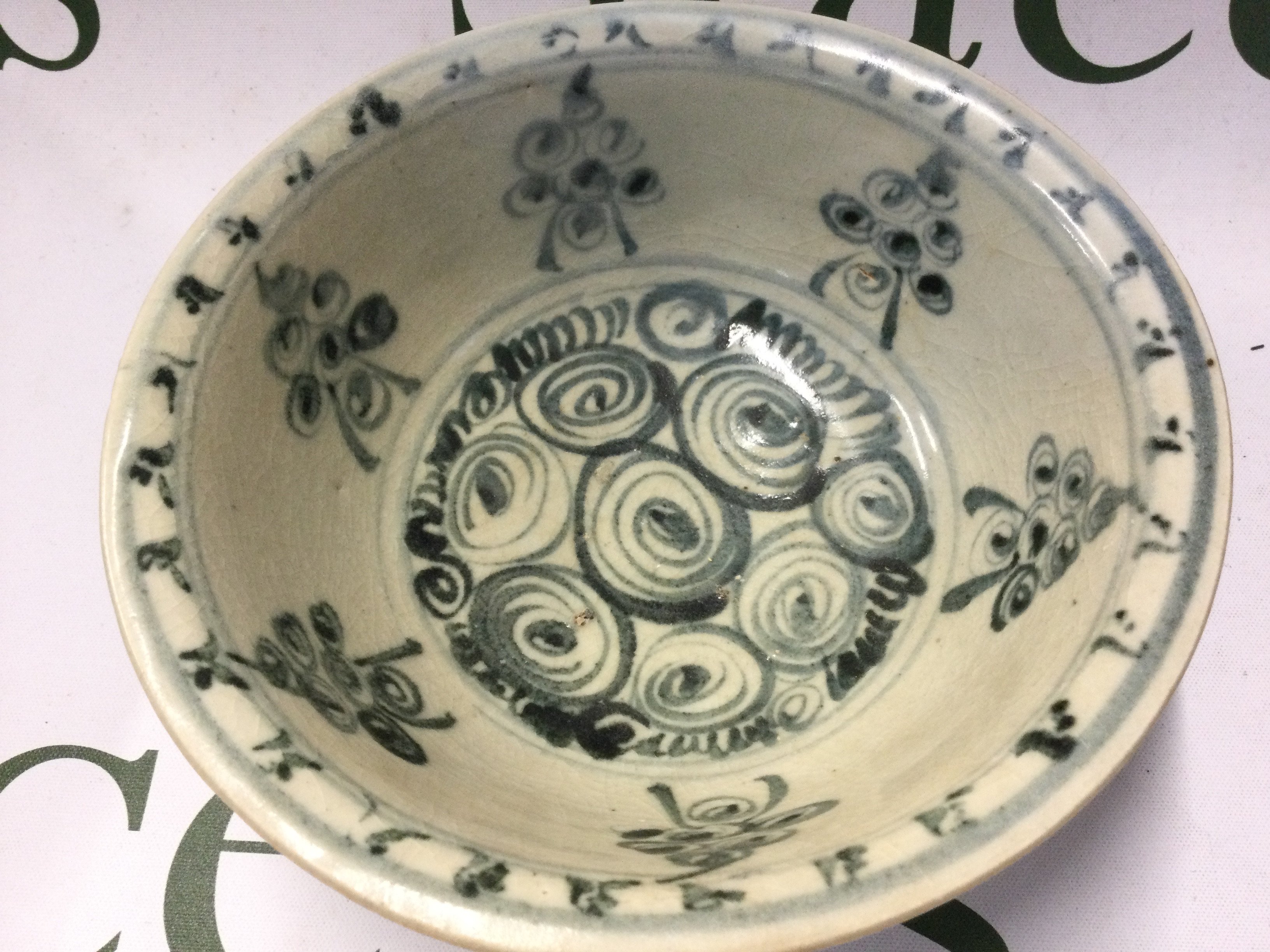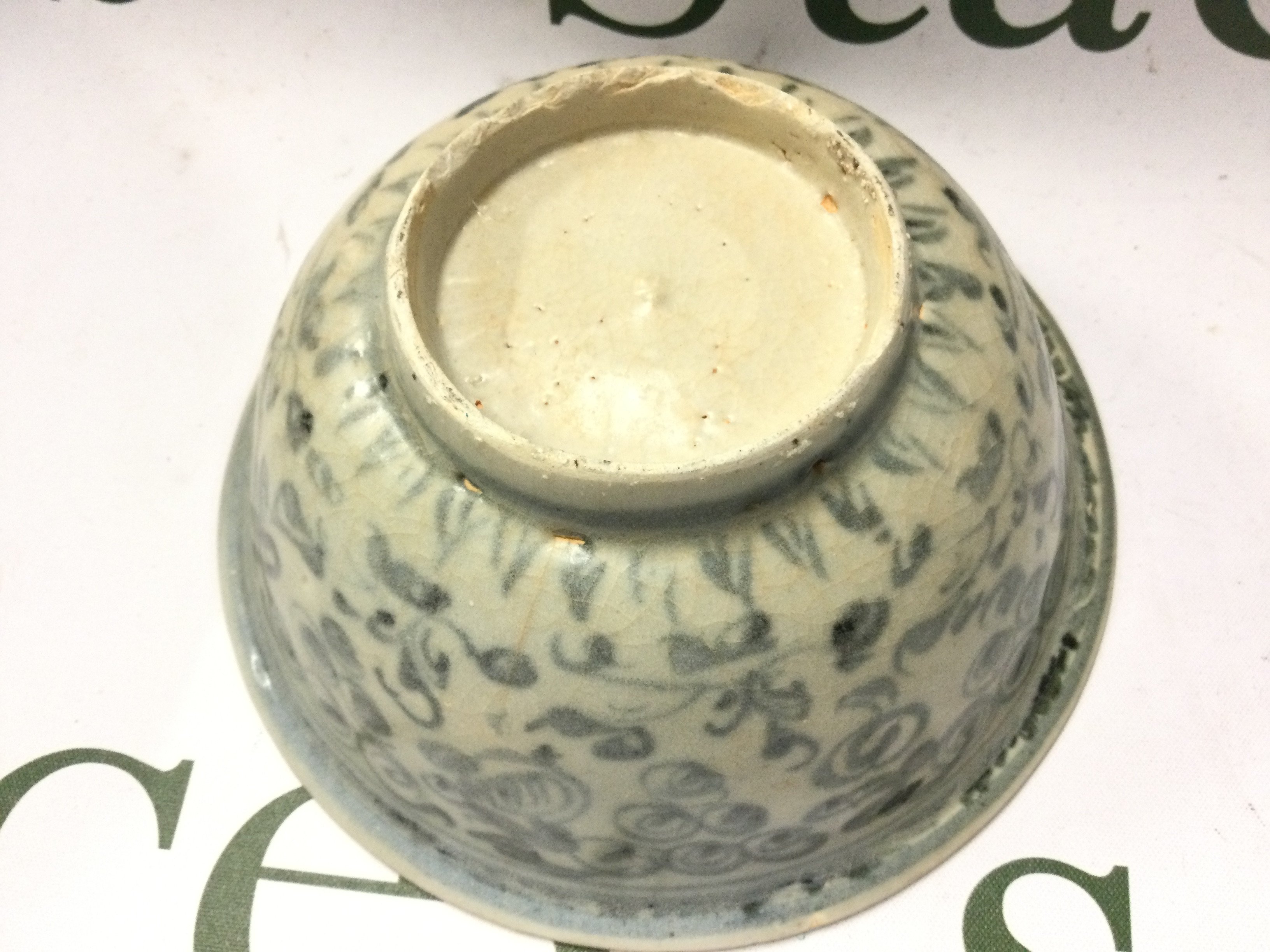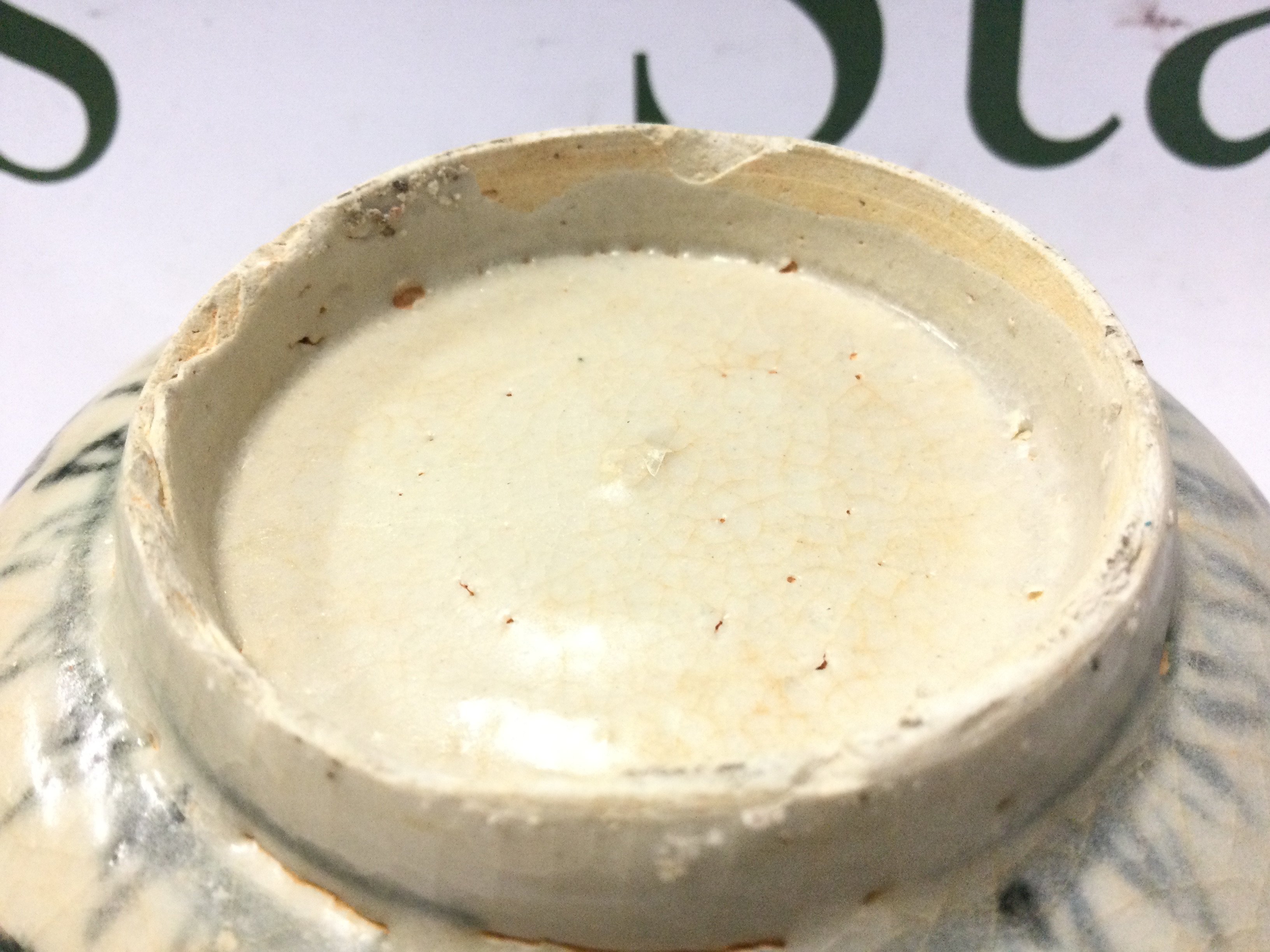 A Chinese Ming period blue and white porcelain bowl , some chips at the base and signs of age. This lot cannot be posted in house.