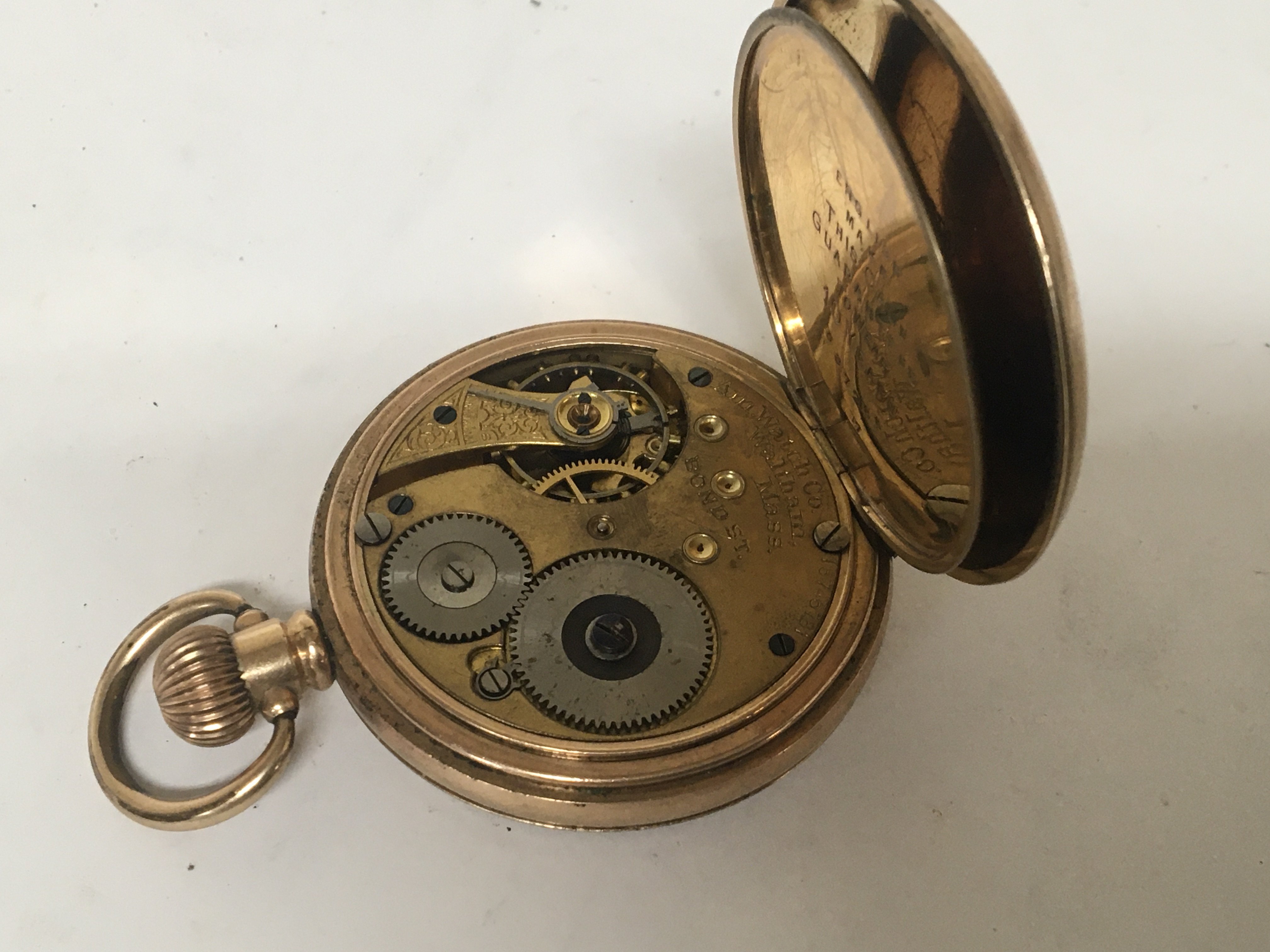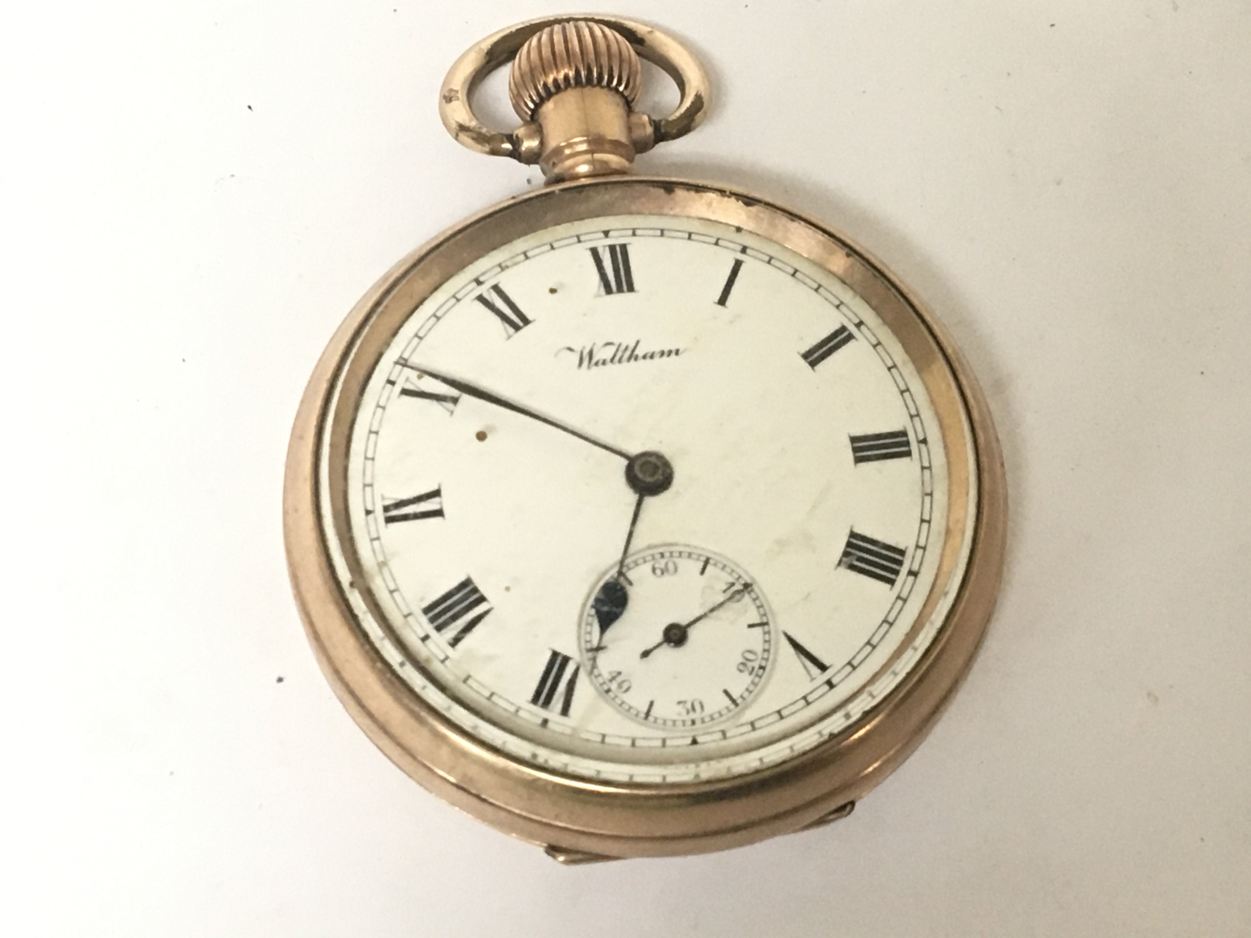 A gold plated Waltham button wind pocket watch.seen working no personal inscriptions.