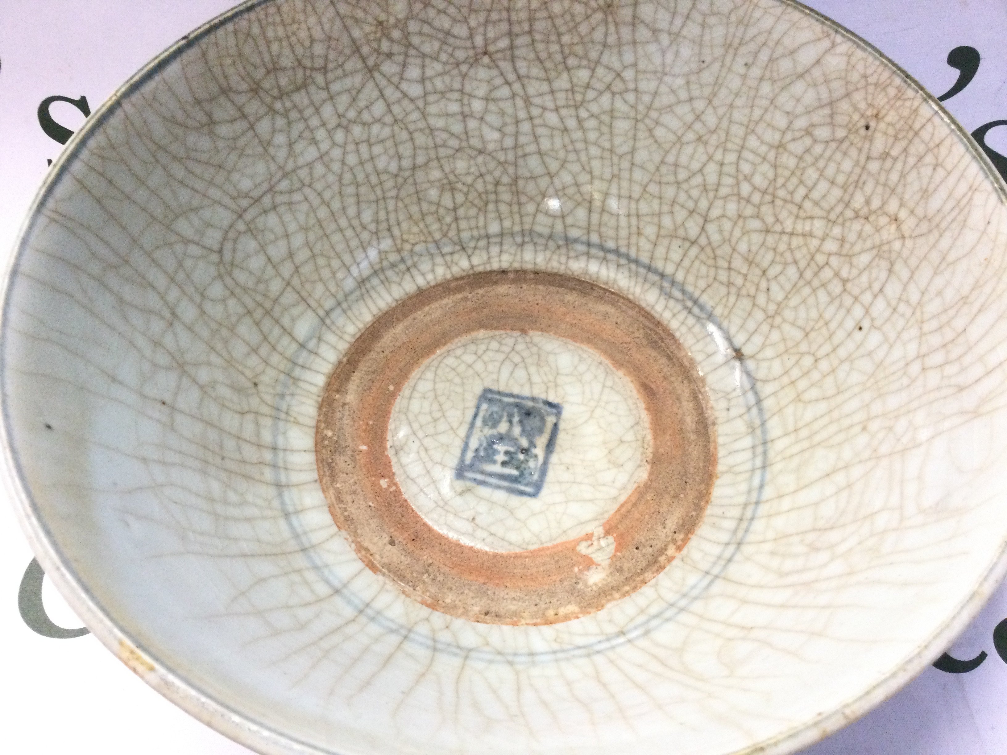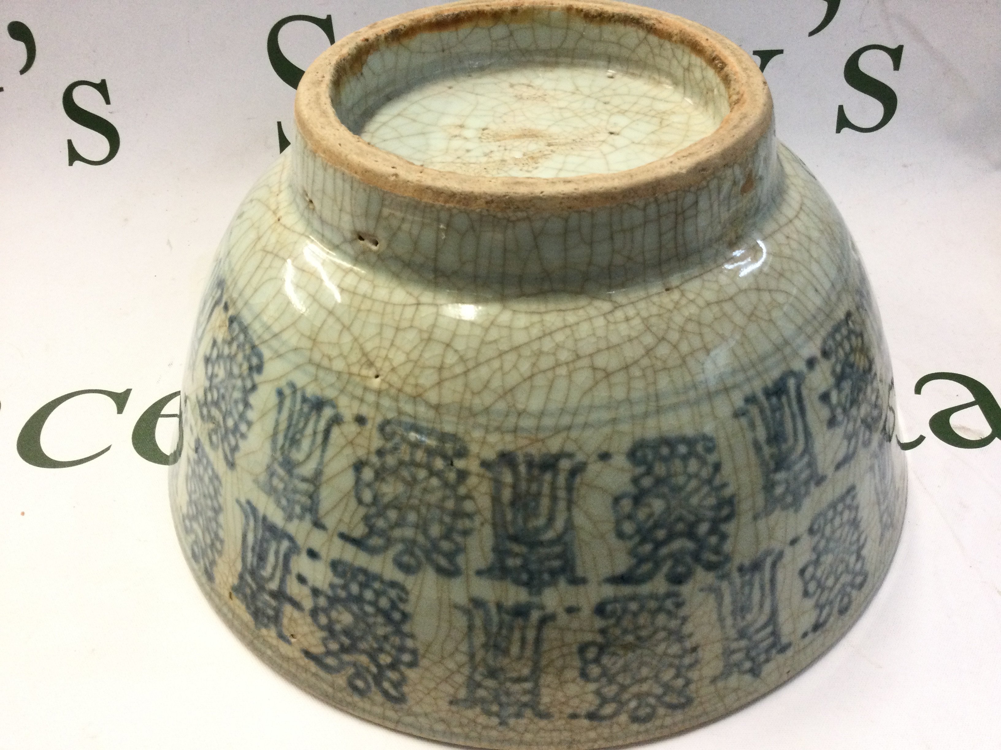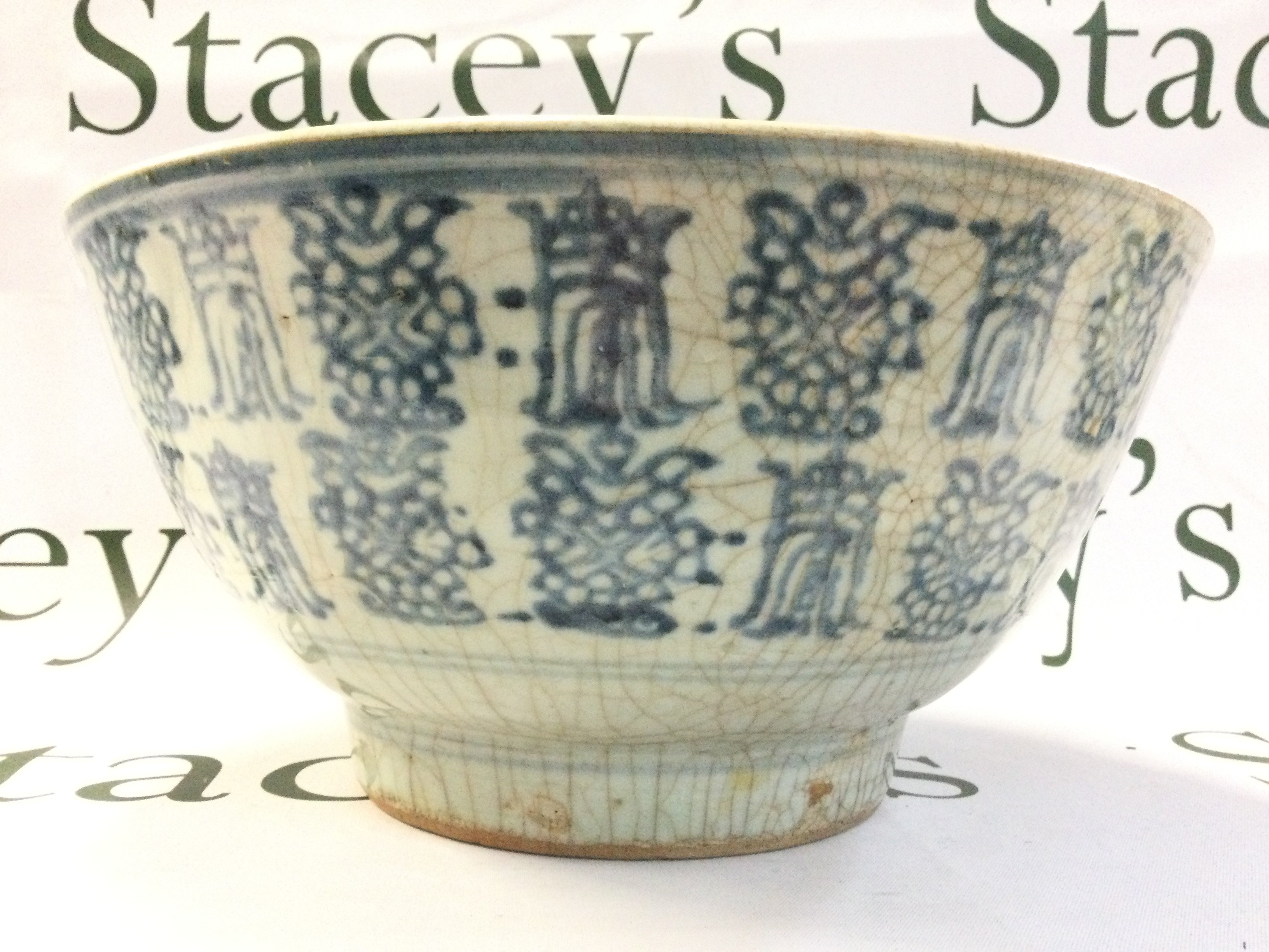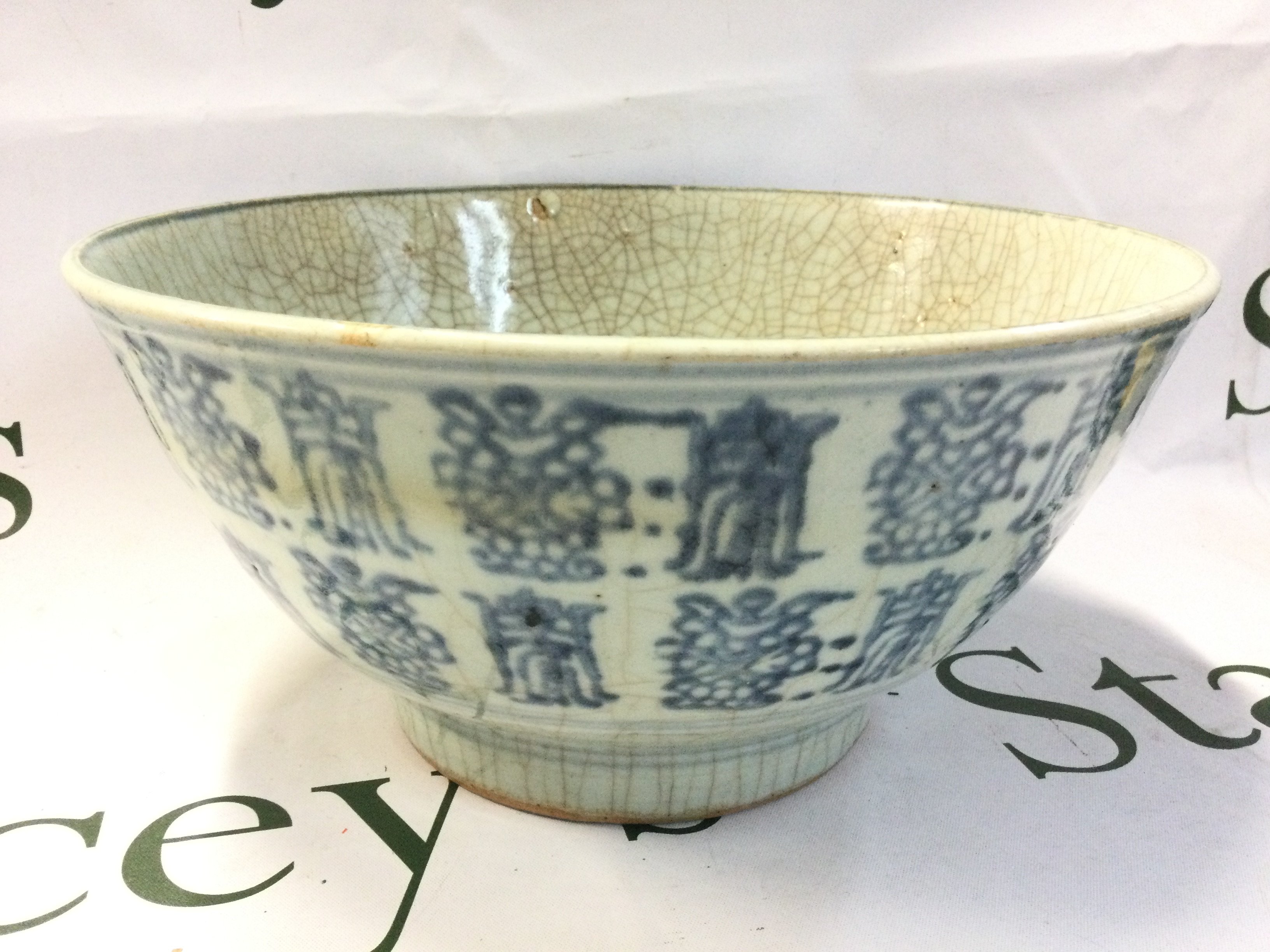 A Chinese Ming Dynasty blue and white porcelain bowl, some damage. 26cm wide 12cm tall. This lot cannot be posted in house