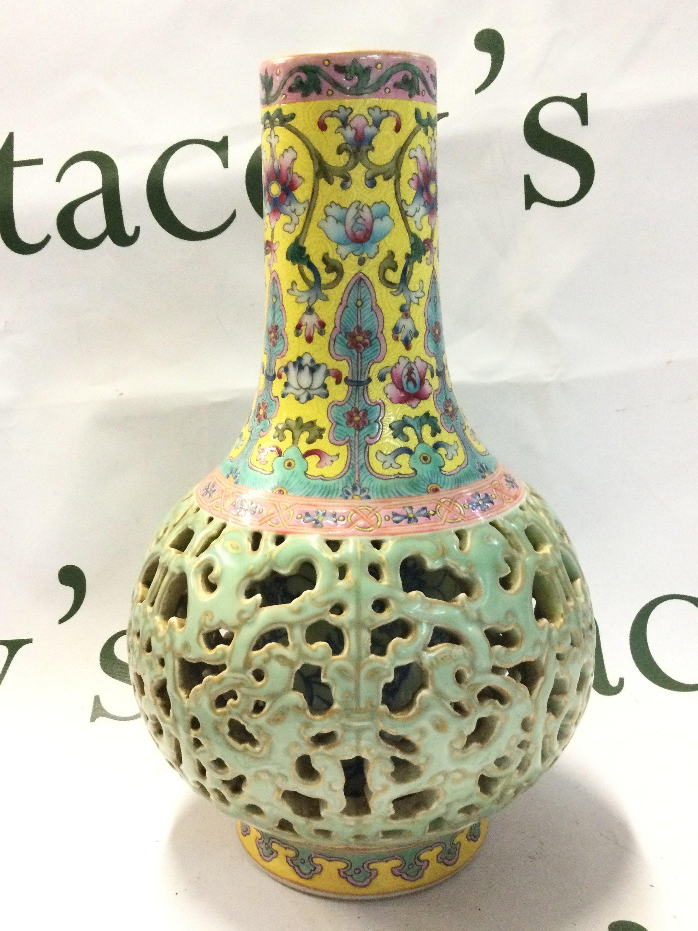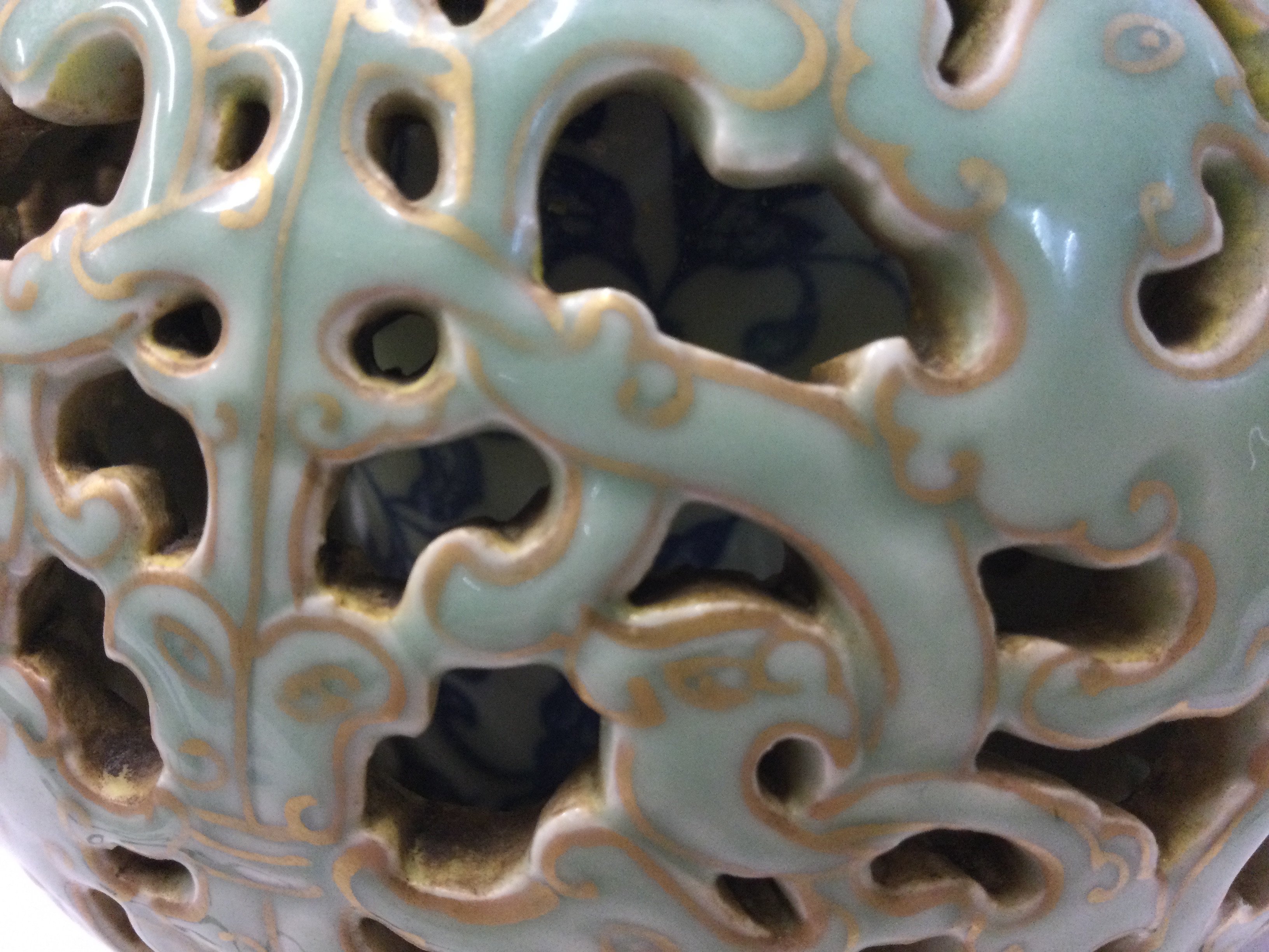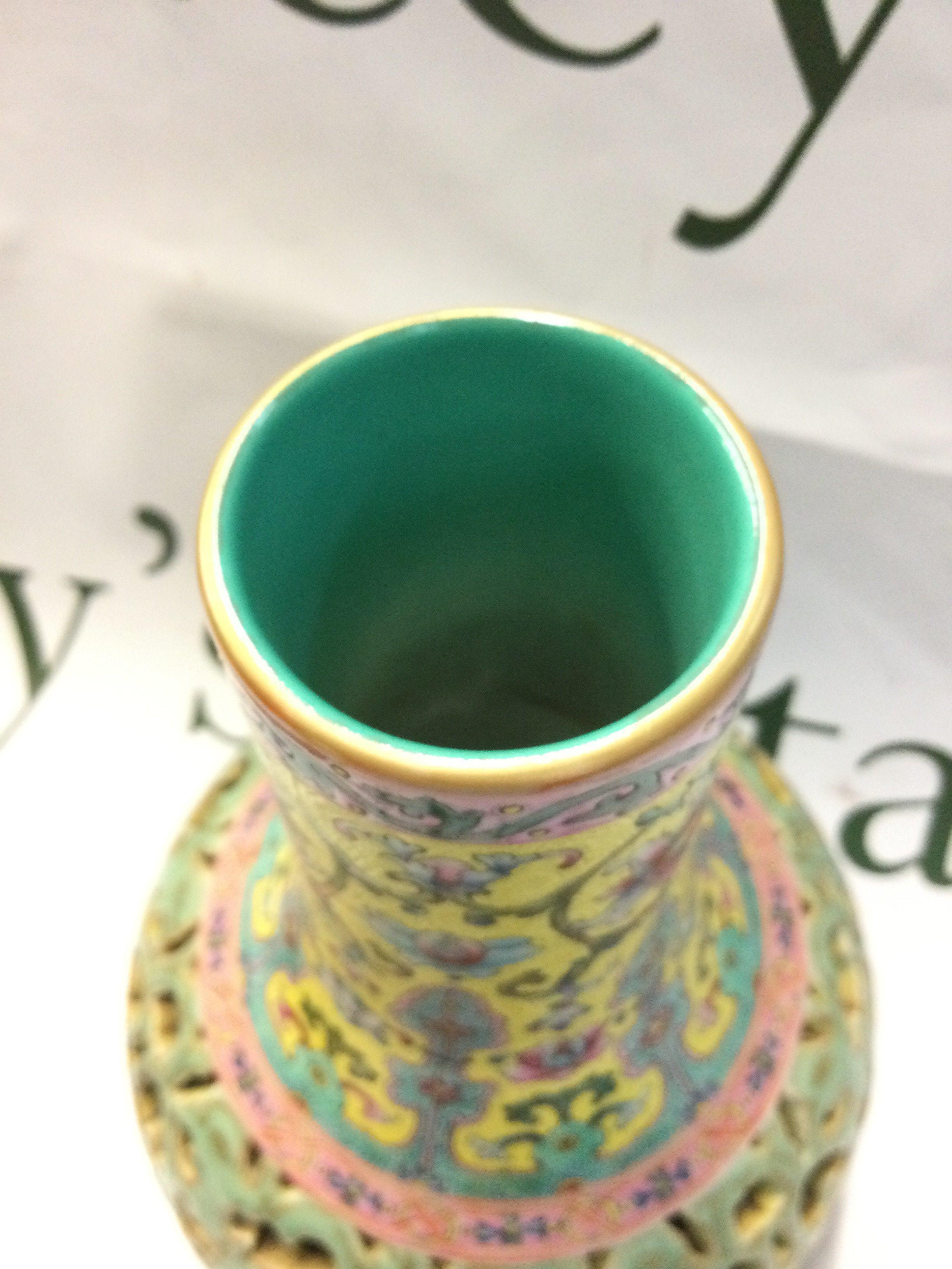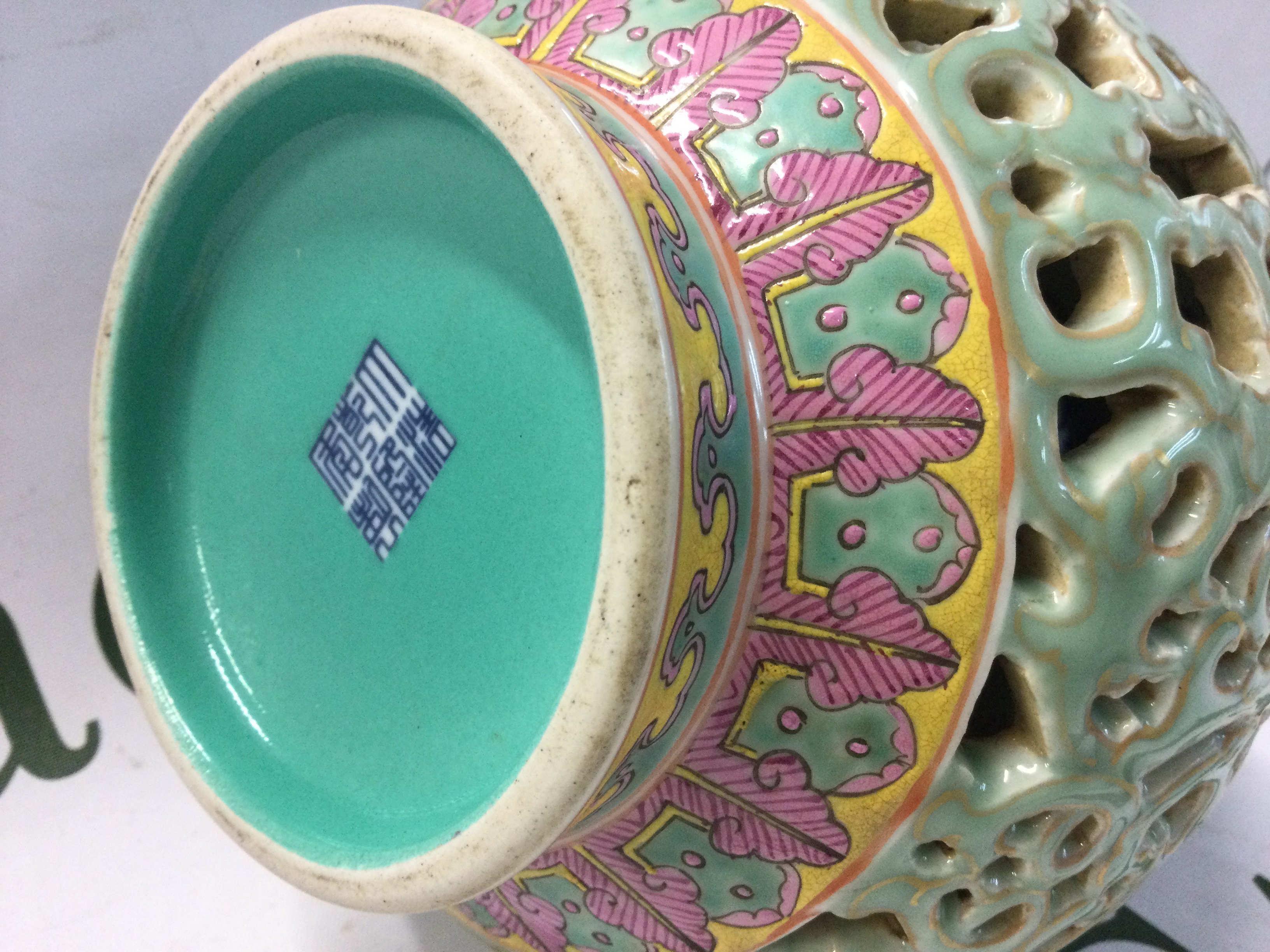 A Chinese perforated vase signed , with implanted another vase inside perforation. No obvious damage or restoration. This lot cannot be posted in house