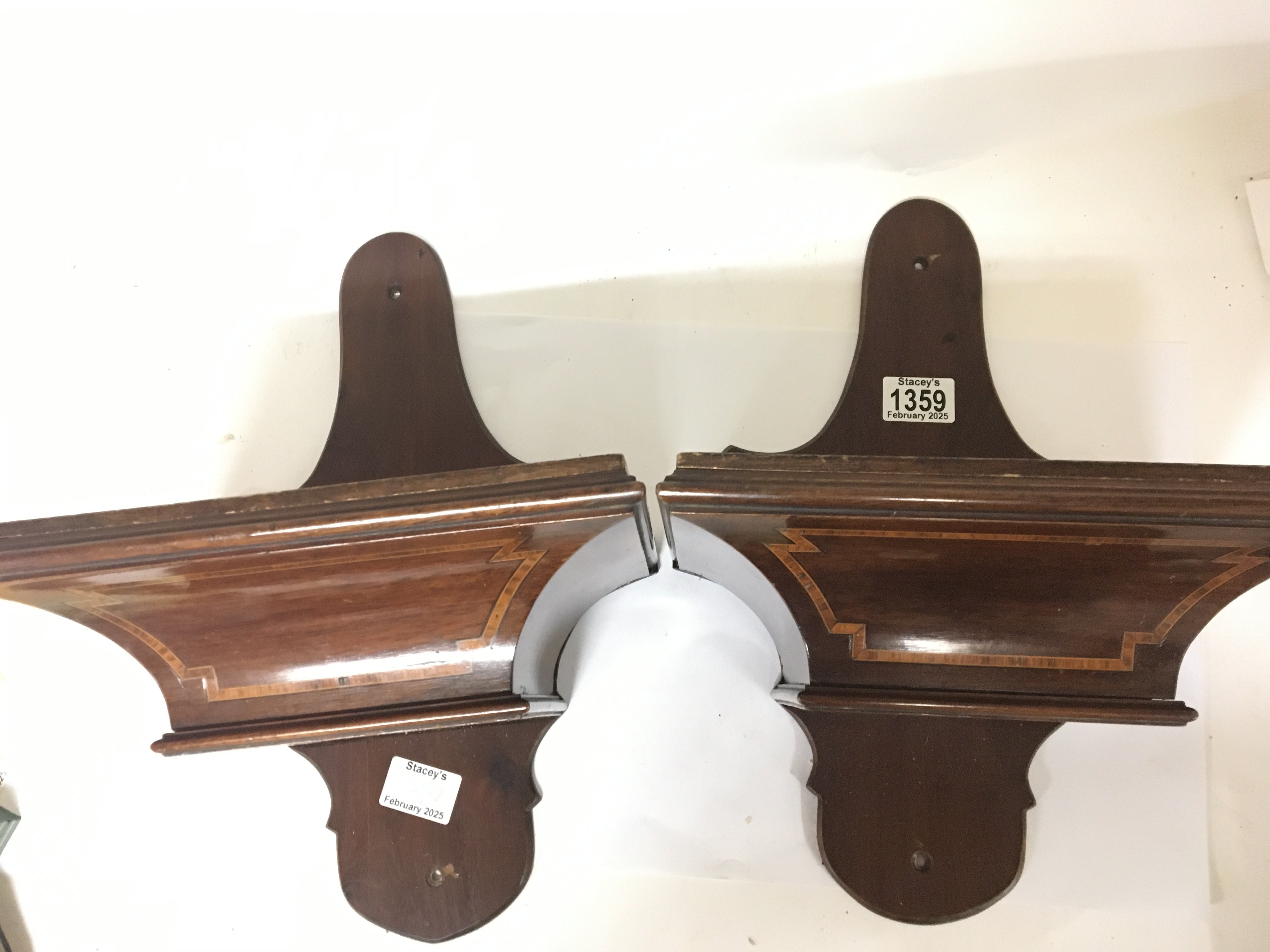 A pair of Edwardian inlaid Mahogany hanging brackets.