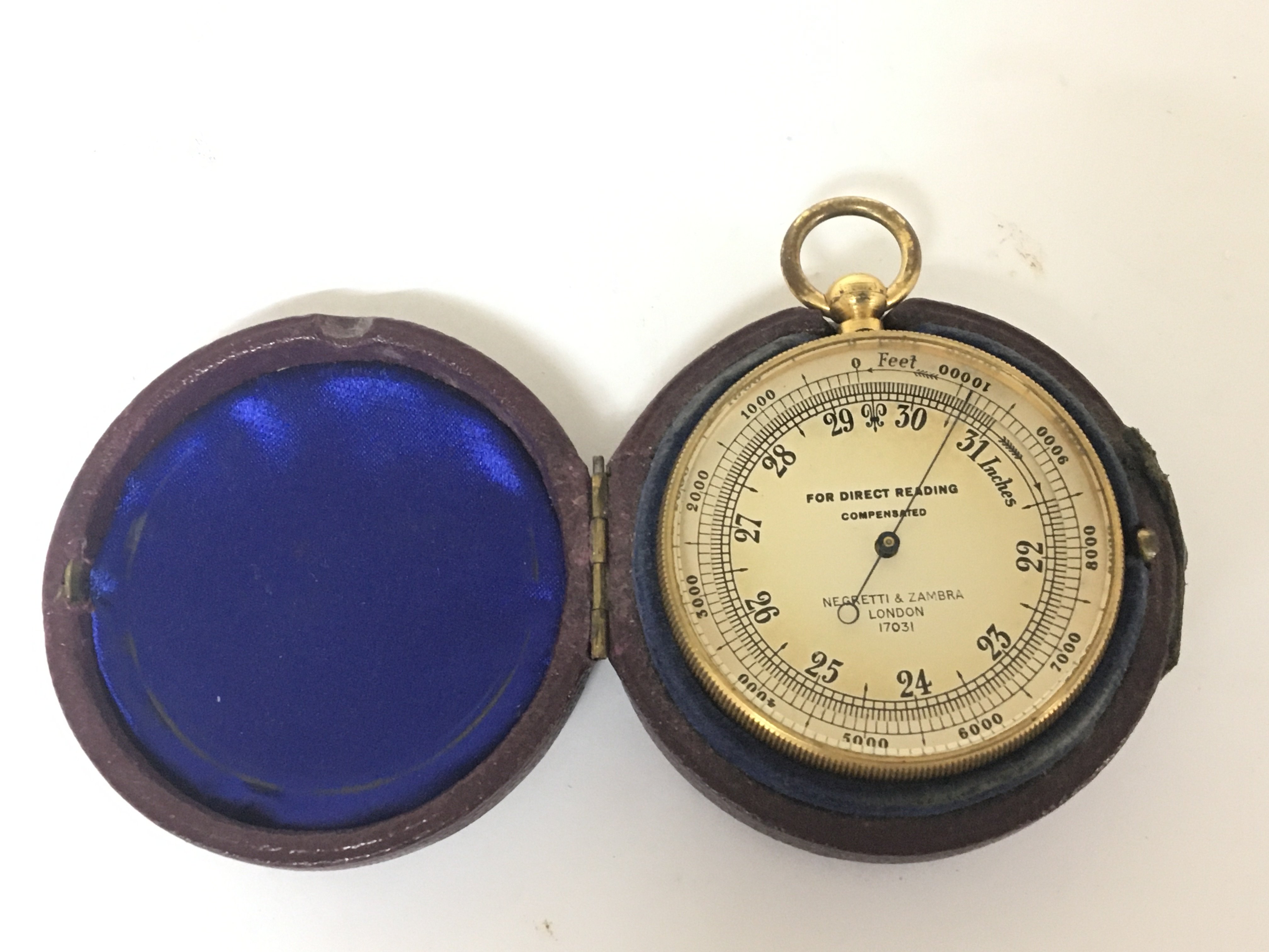 A late 19th century pocket barometer om a fitted case maker Negretti & Zambra.