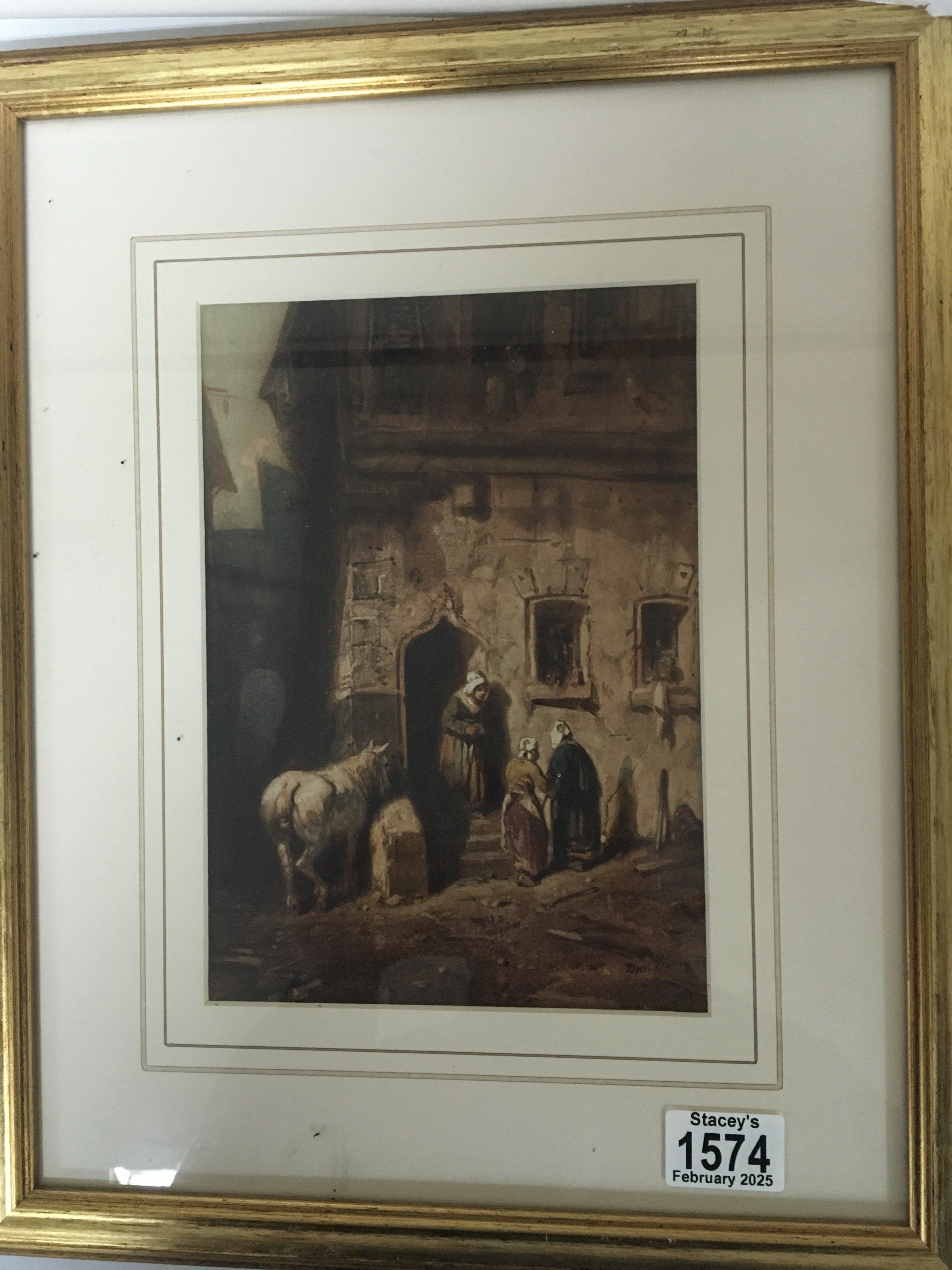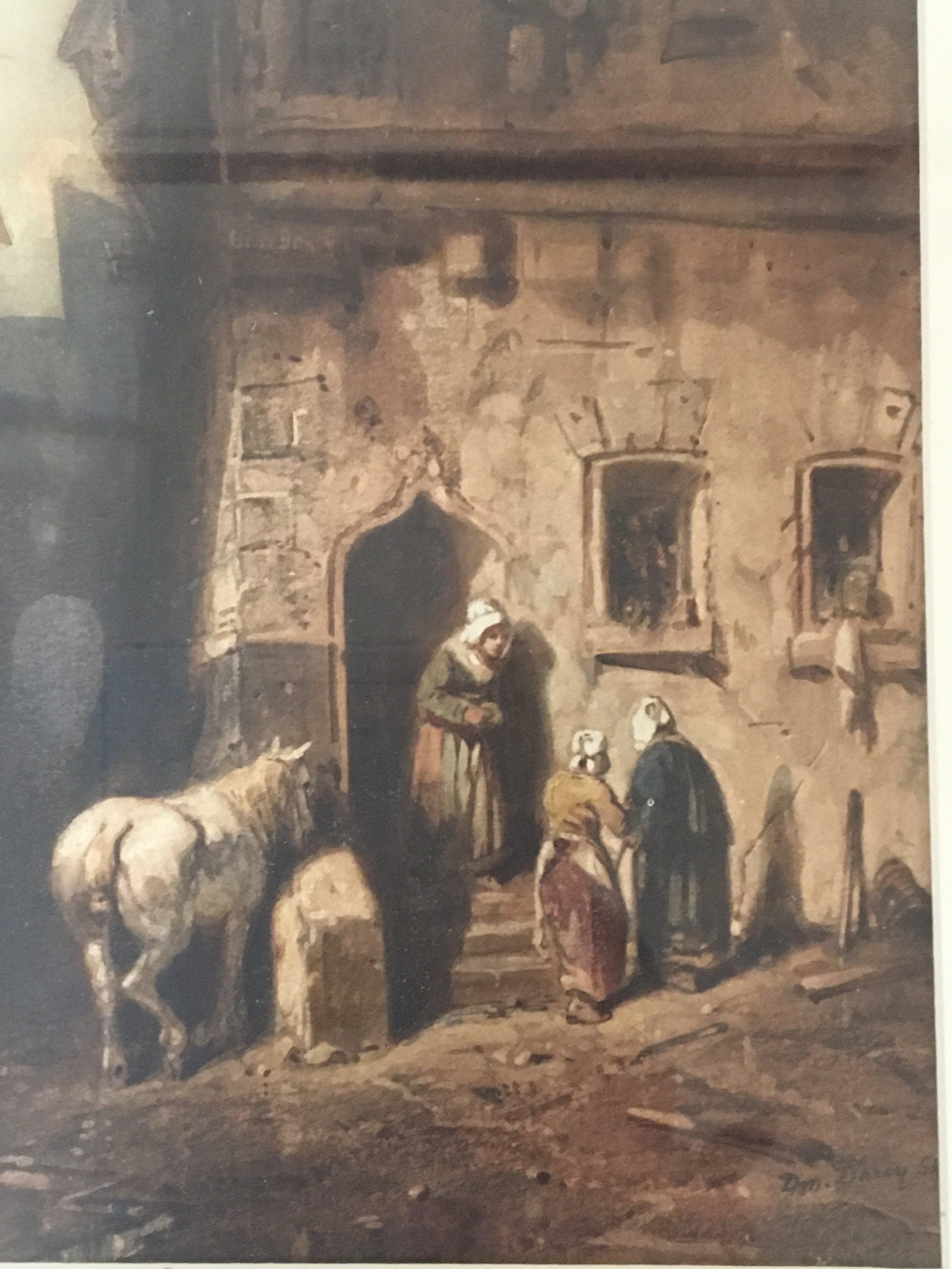 A 19th century later framed watercolour depicting figures by a doorway With a horse. Signed lower right.