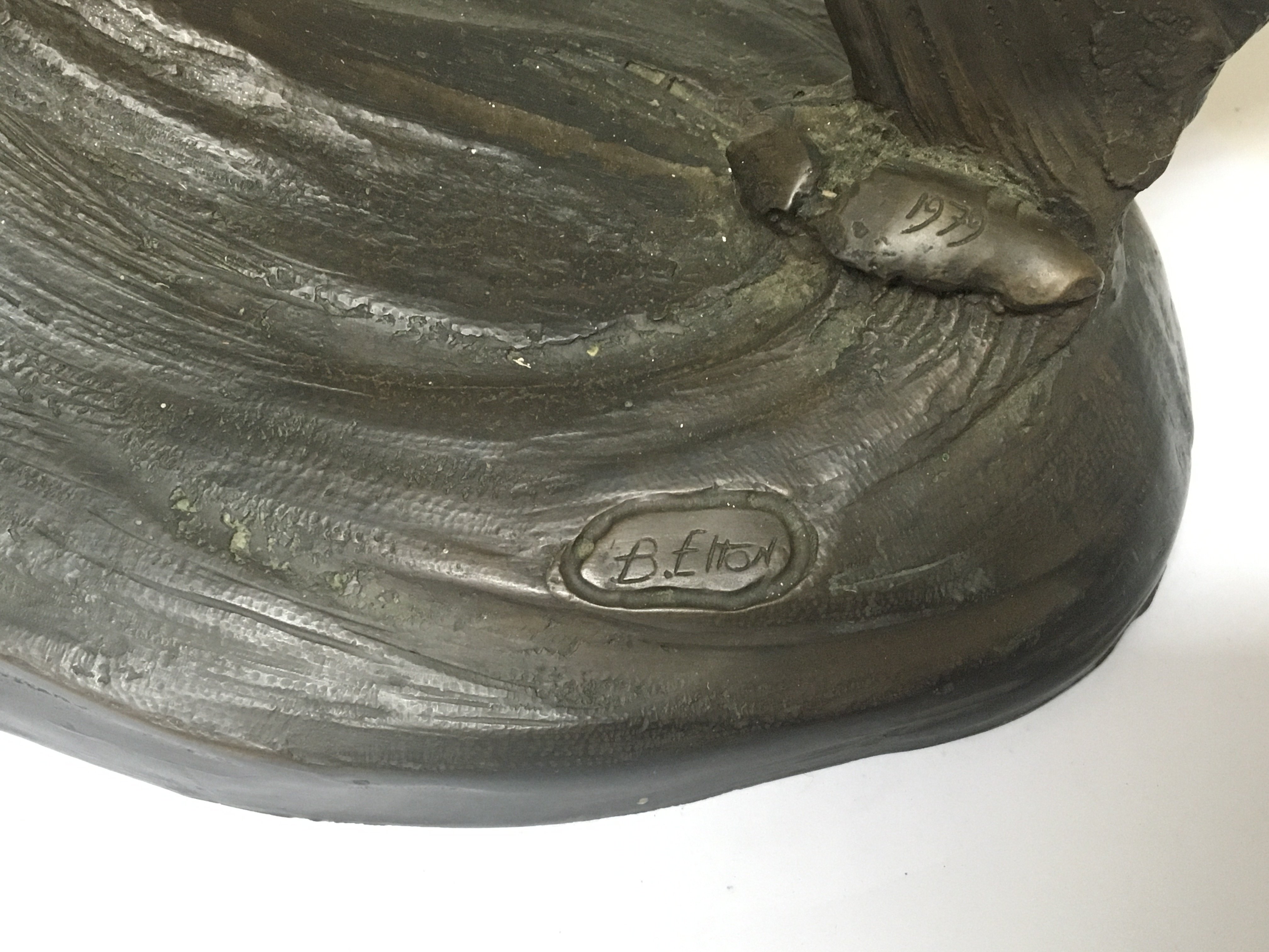 A large cold cast bronze of a leaping wild Salmon on a scrolling wave. Signed by B Elton length 64cm.