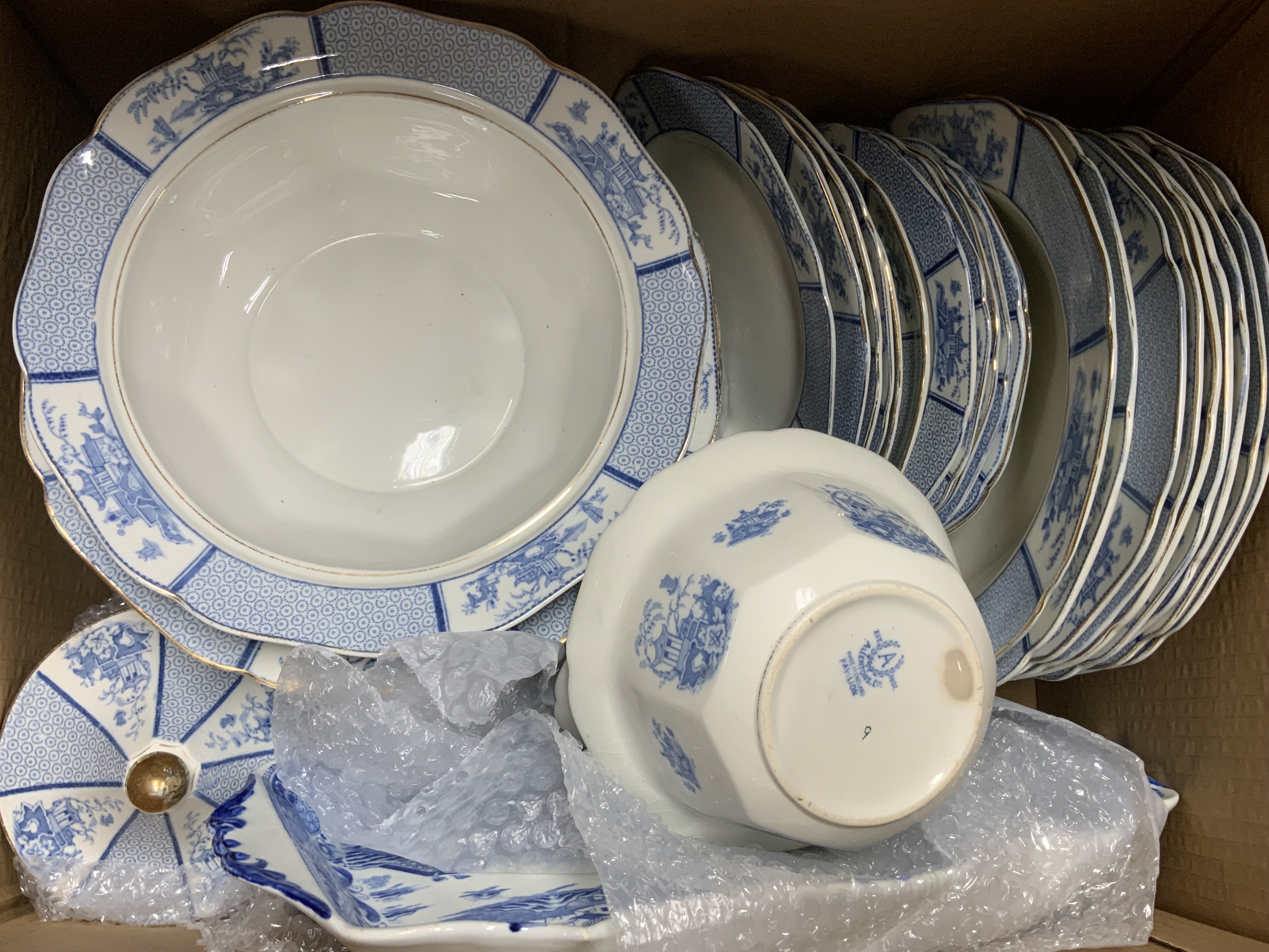 Allertons blue and white Pavilion pattern dinnerware together with a Royal Doulton Norfolk platter, 2 Japanese porcelain teasets. (2 boxes)