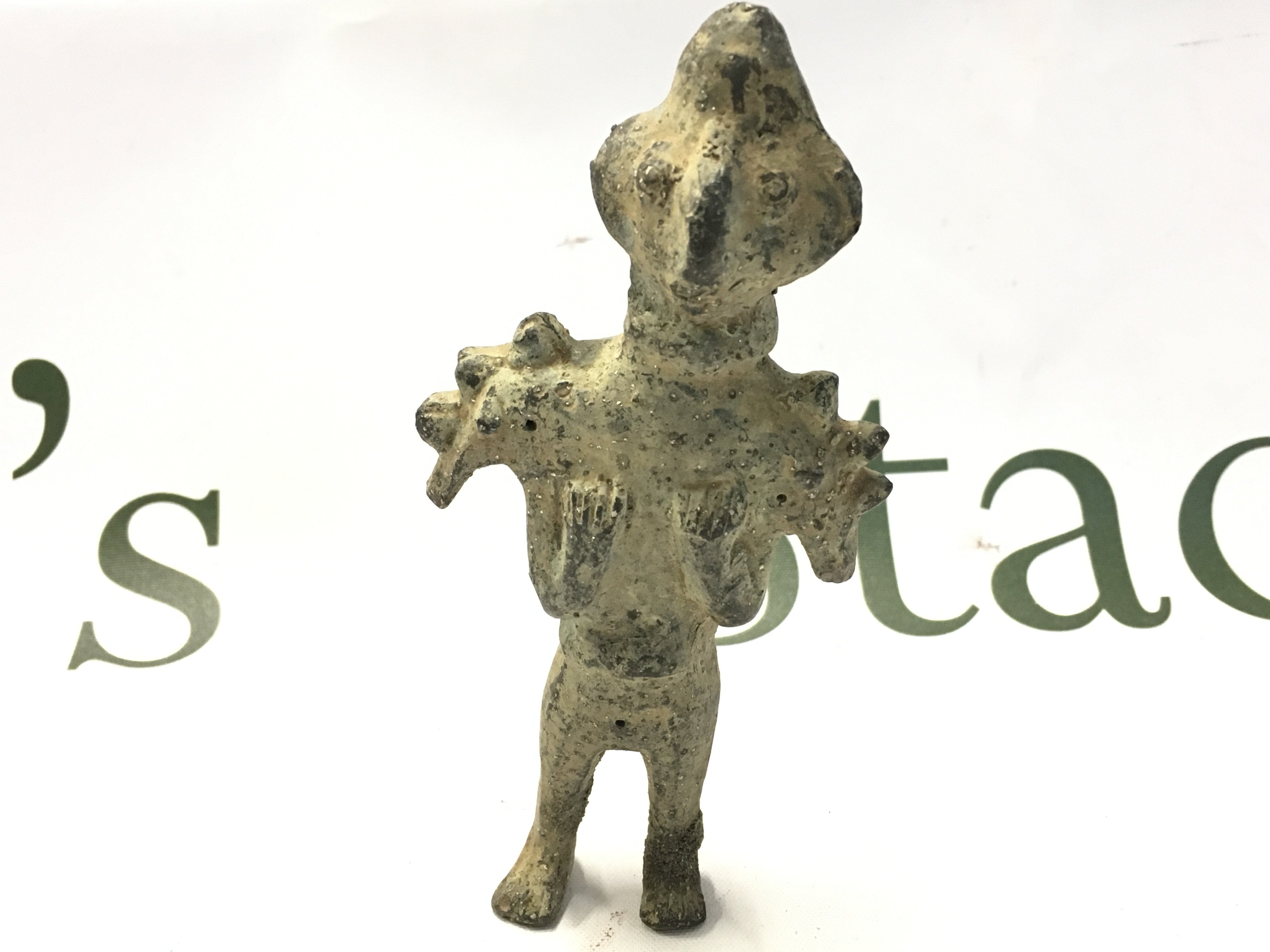 A Roman circa 100AD Syro-Hittite lost wax bronze figure of a man holding a fish , 13cm tall. Postage cat B