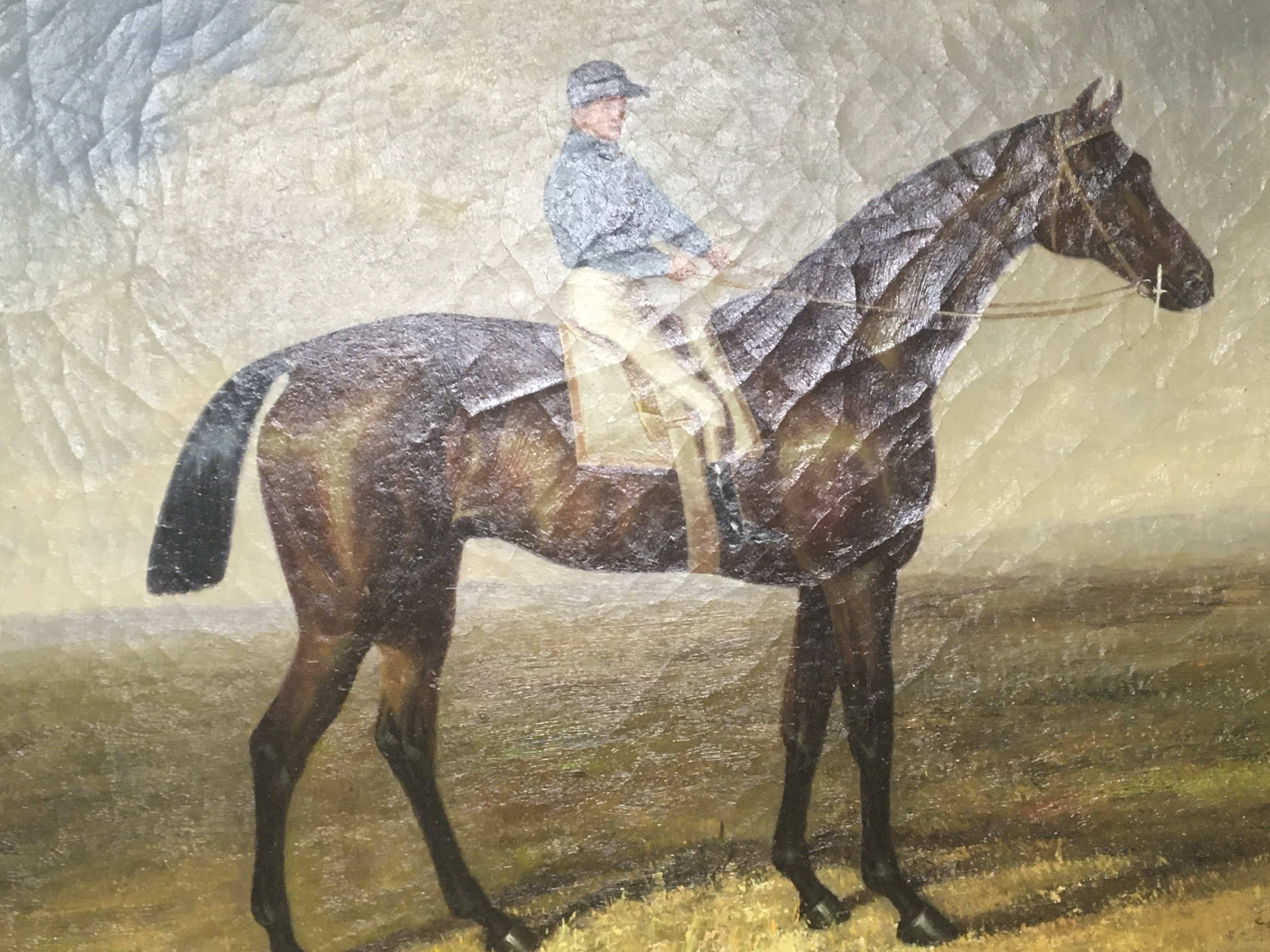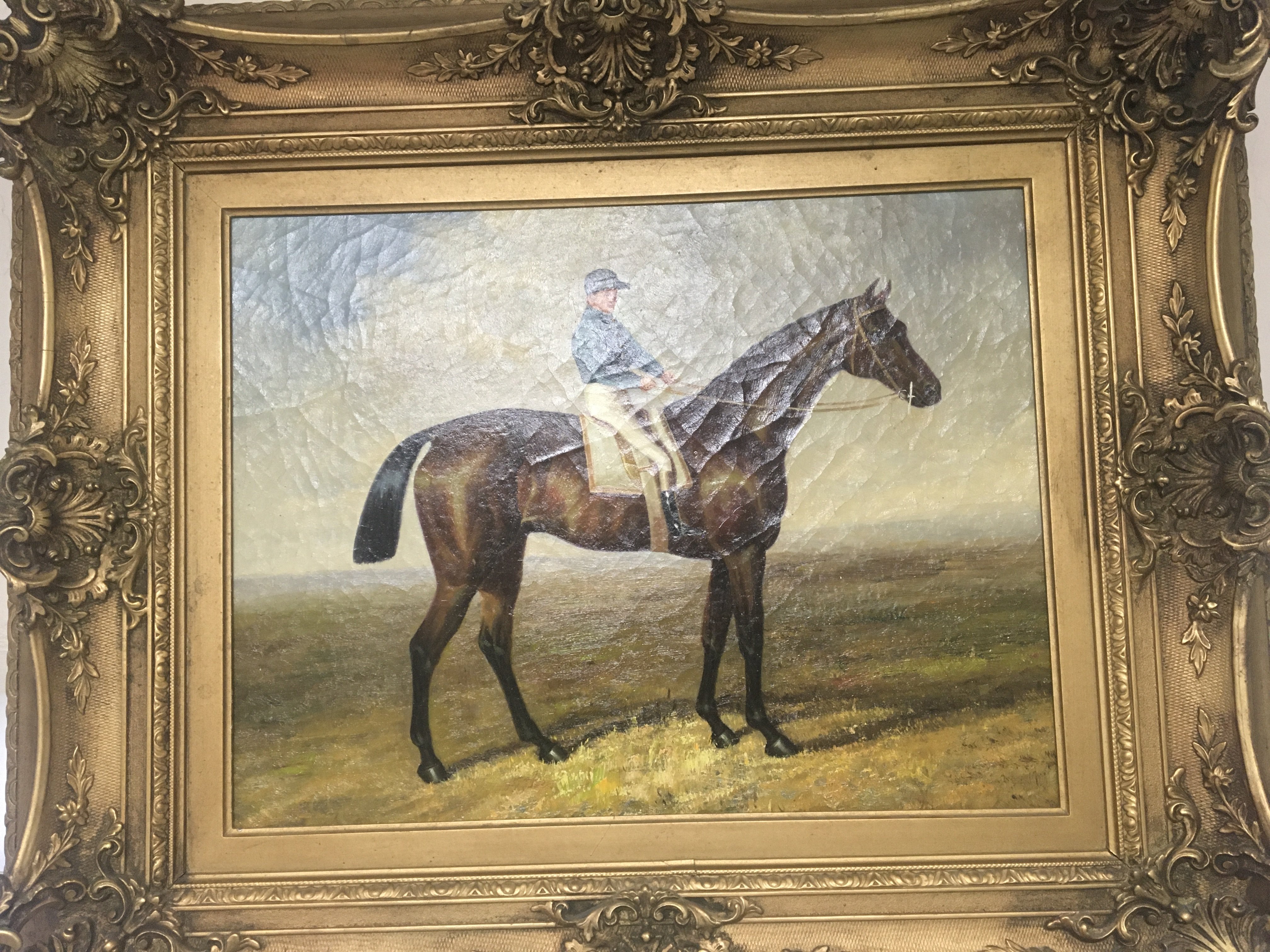 A framed oil painting on board study of a race horse with jockey. Unsigned and unattributed. 73x62cm