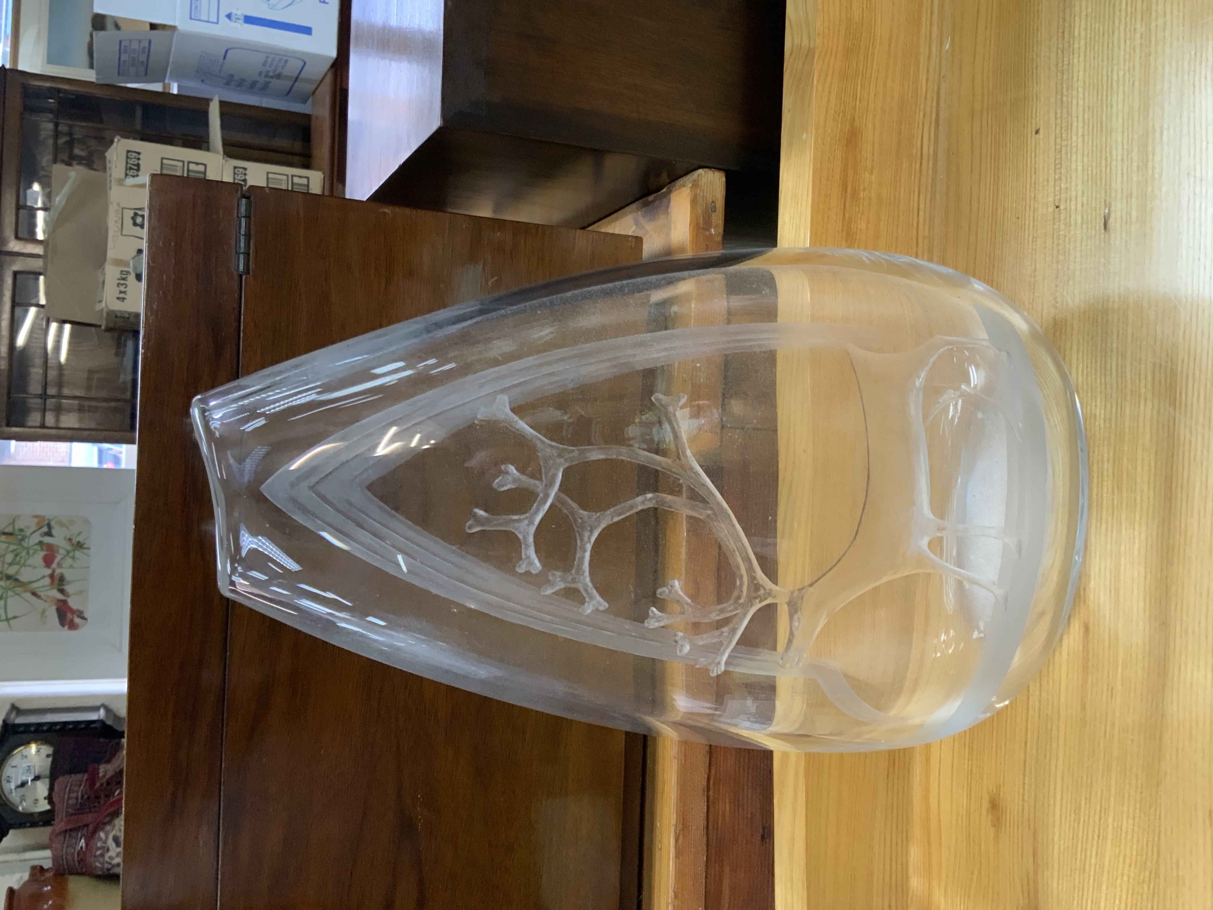 A large Orrefors crystal glass vase with an etched view of a Reindeer.