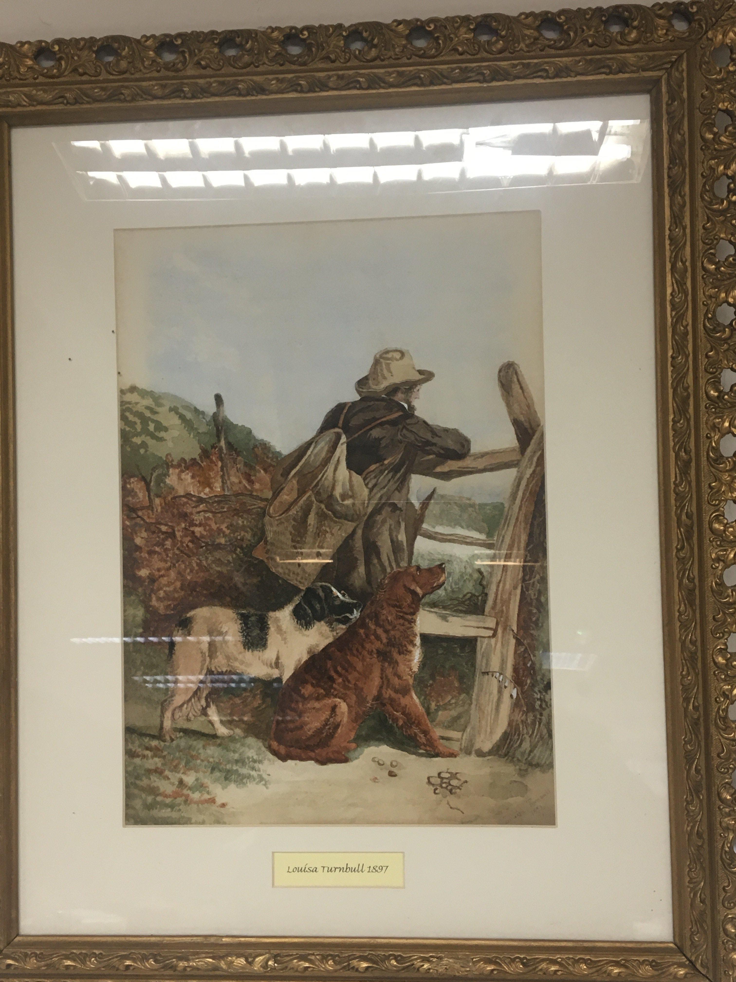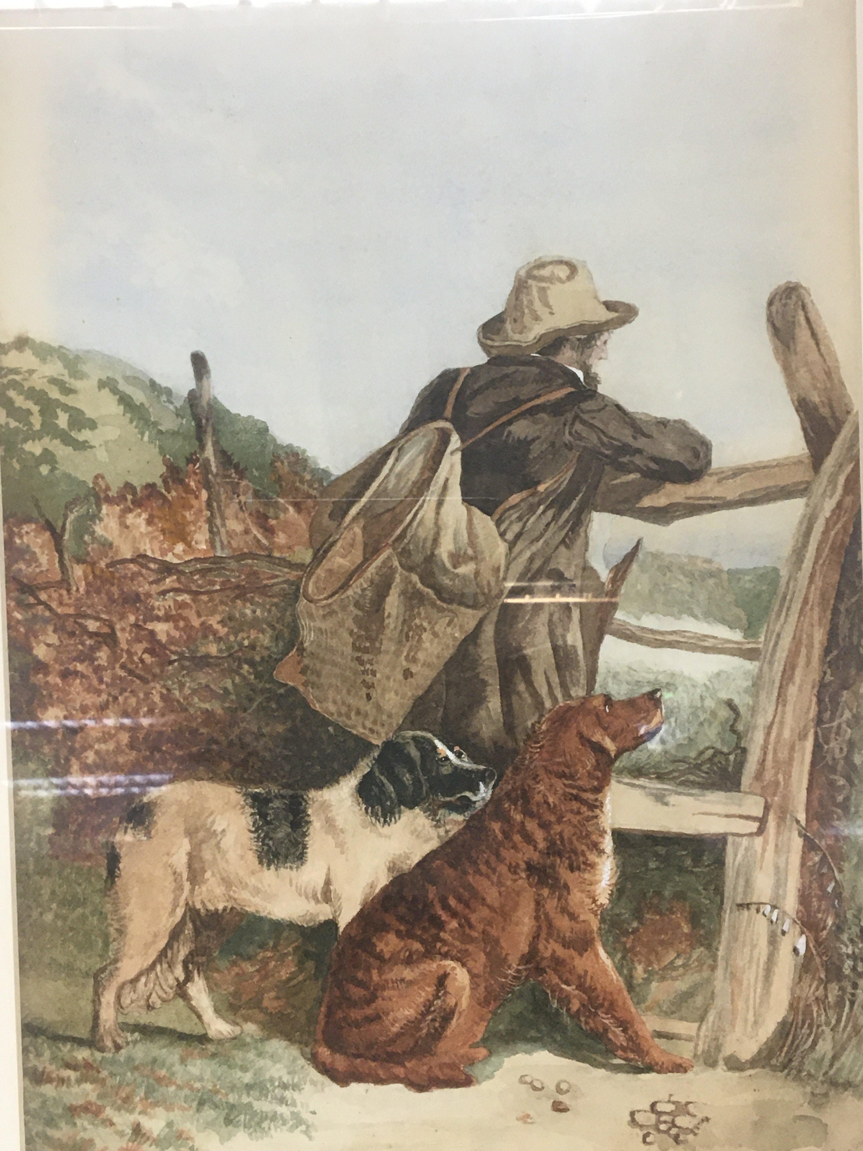 A framed watercolour late 19th century of game keeper with his dogs at a rustic gate signed and dated Louisa Turnbull 1897. 49x60cm
