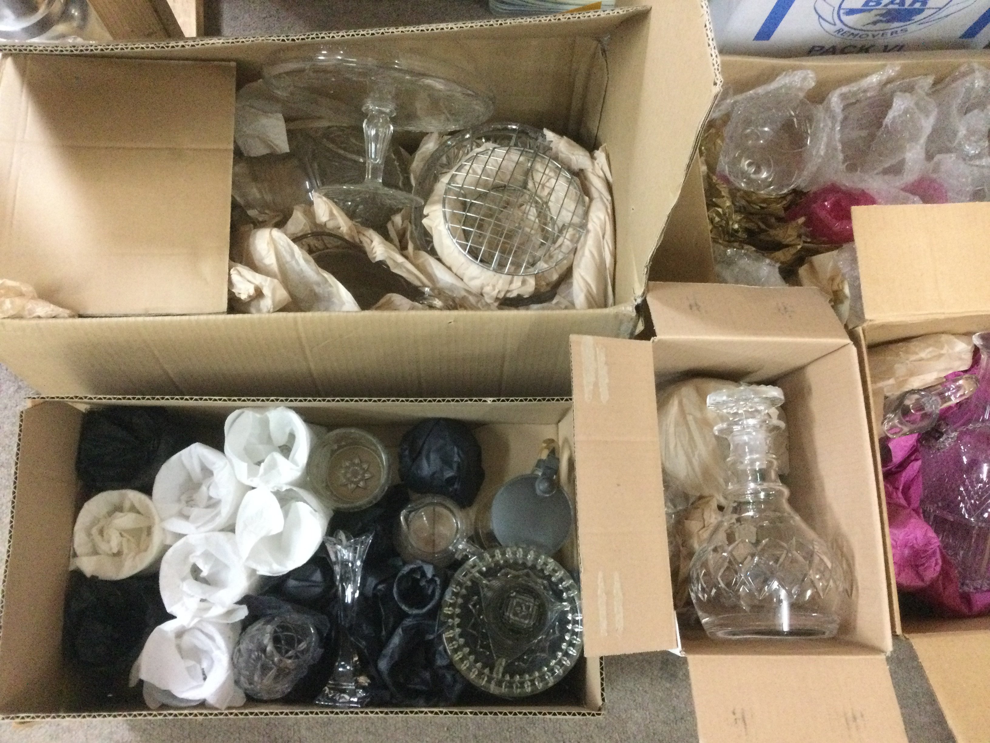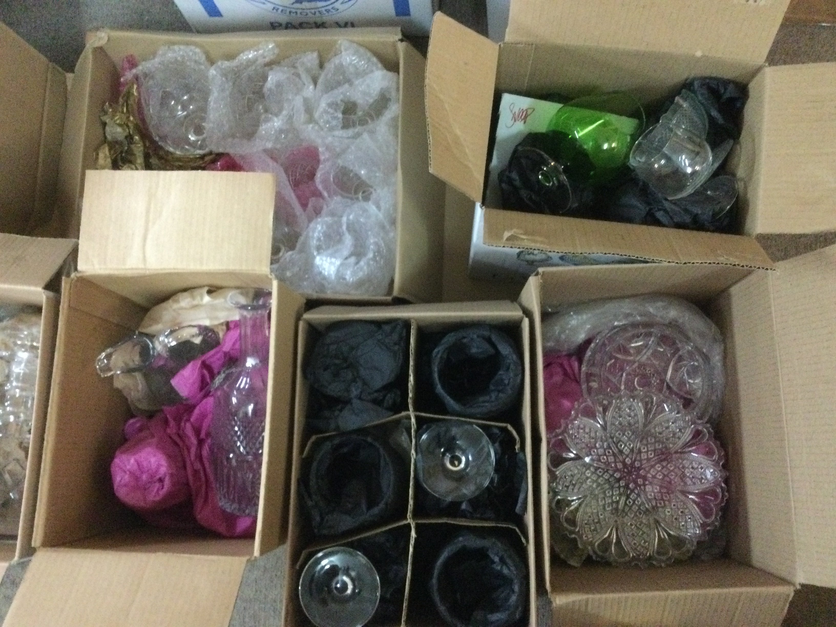 Eight boxes of glassware comprising various decanters, drinking glasses etc. Shipping category D.