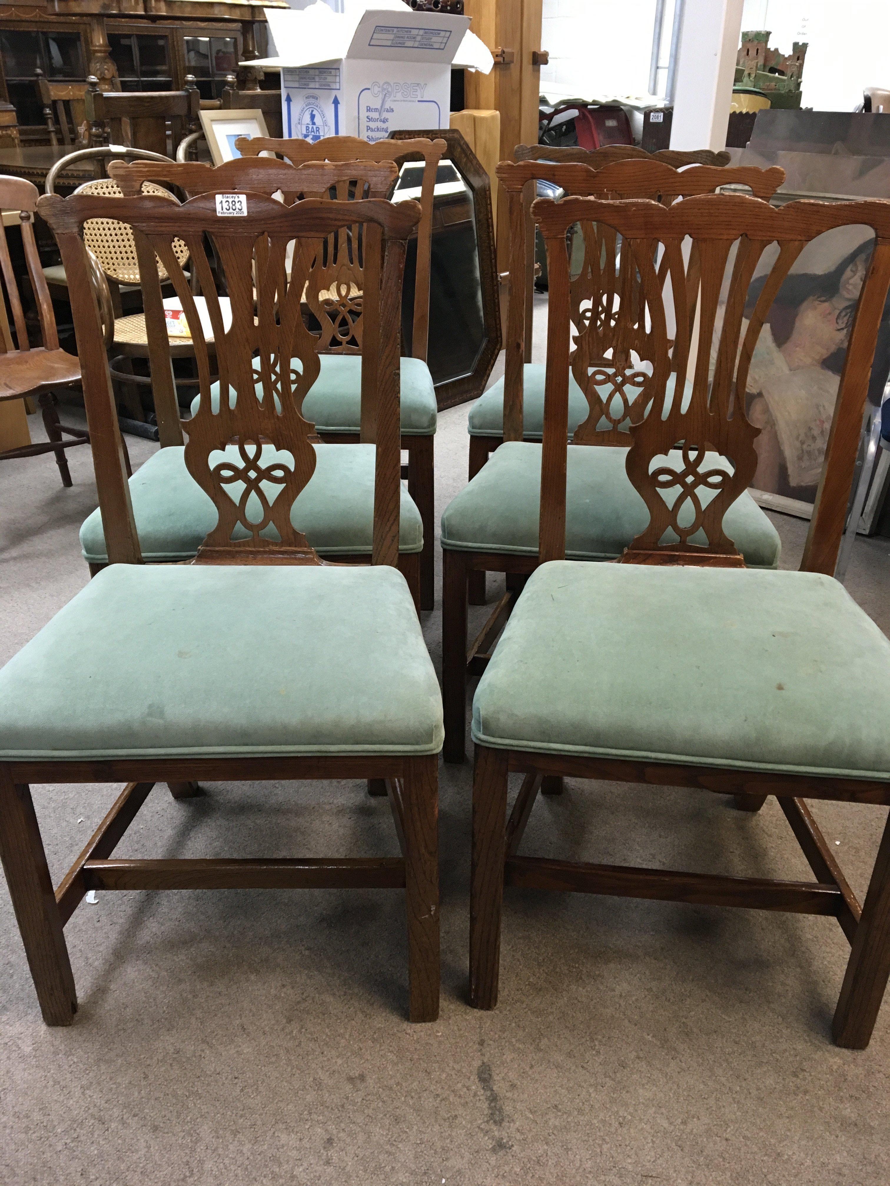 A set of Six late George III Provincial Elm dining chairs with shaped priced backs and upholstery seats on square legs. (6)