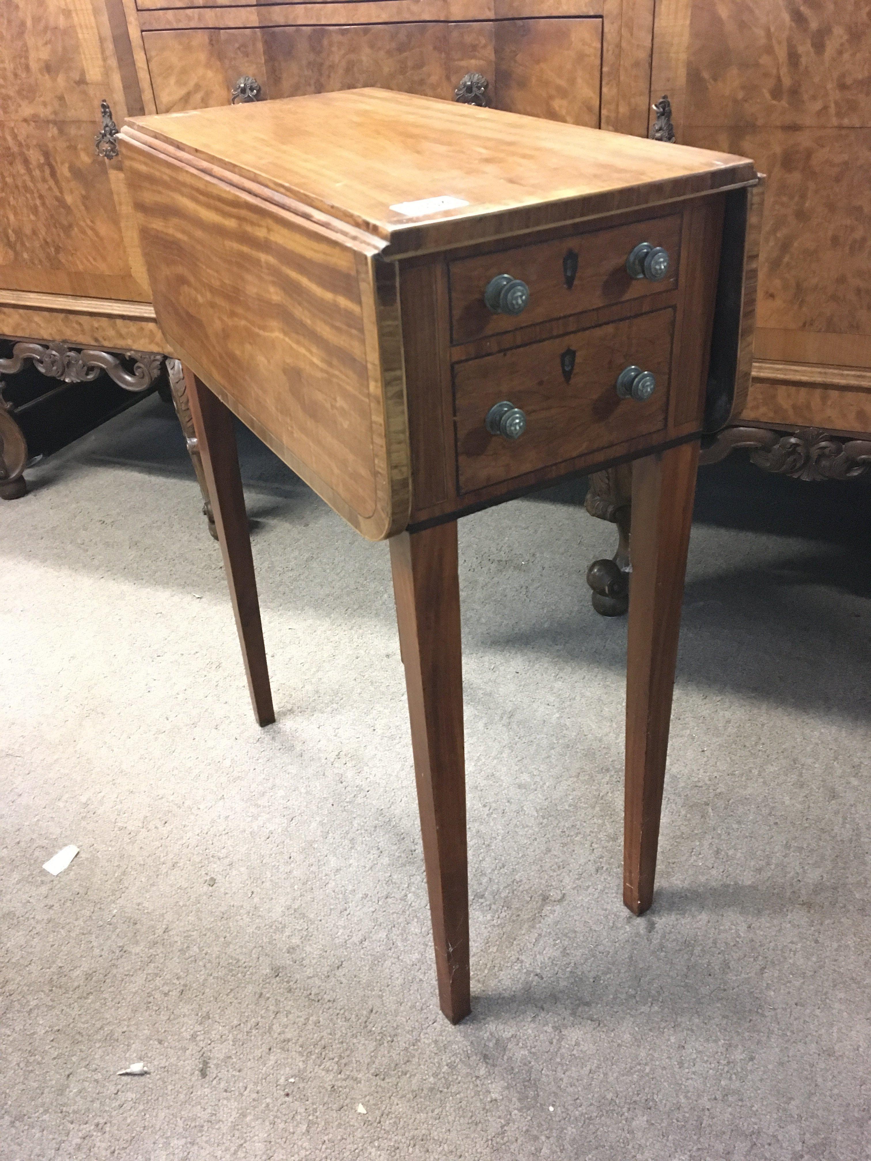 A Quality satinwood late George III table with a cross banded edge twin flap top above drawers on square tapering legs.