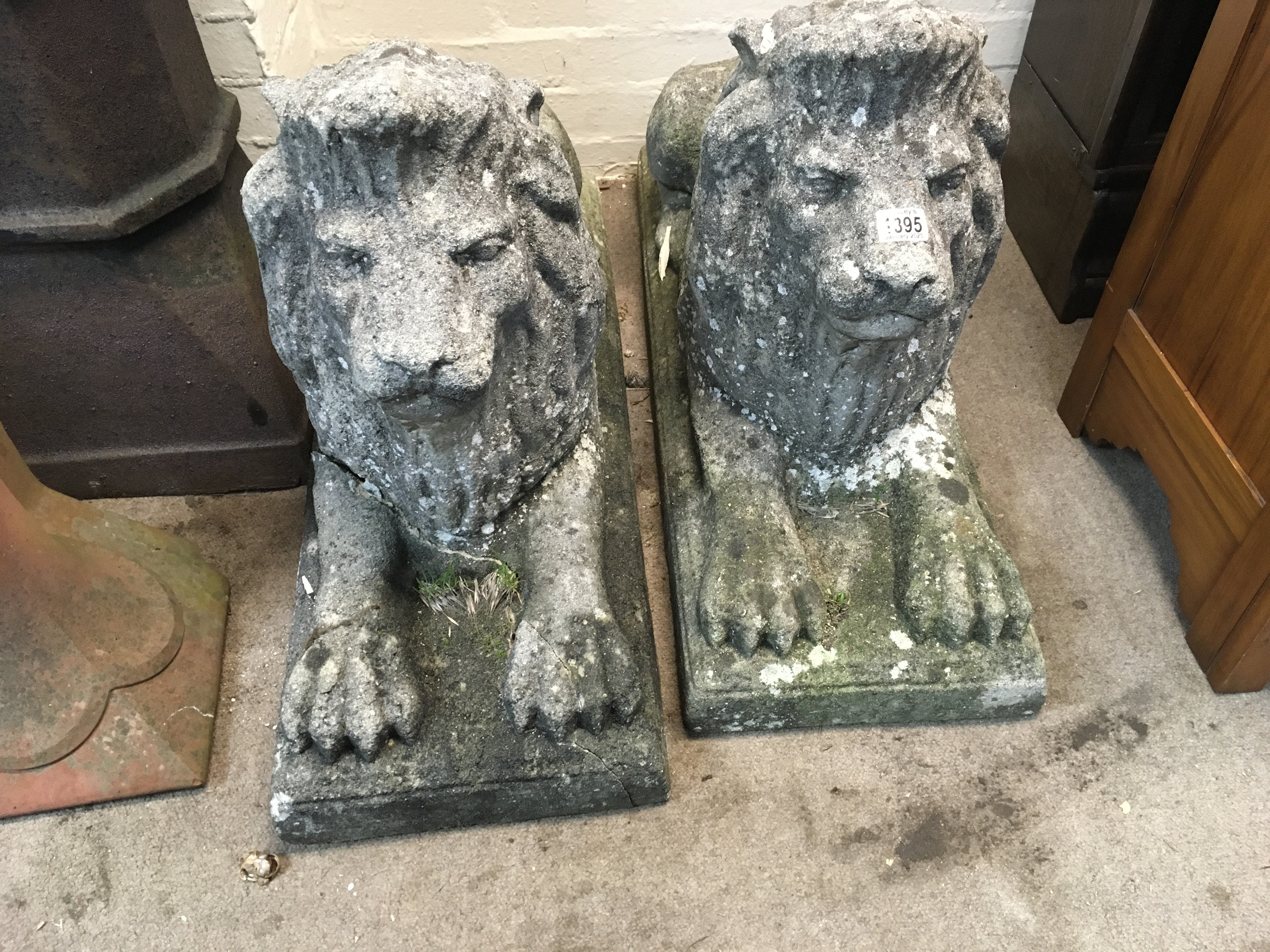 A pair of composition lions 97cm x 28cm (significant damage).
