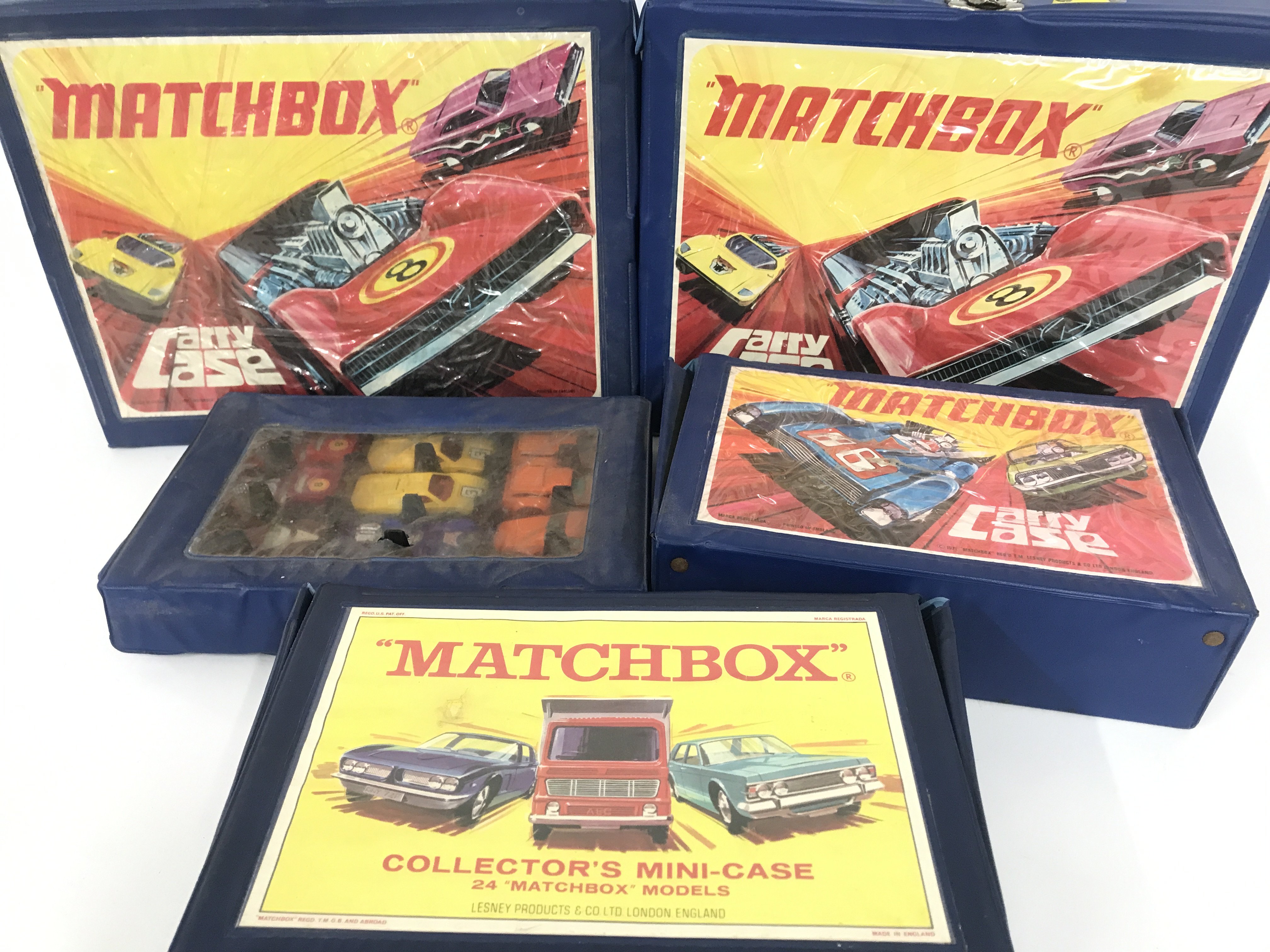 2 Boxes Containing 5 Full Matchbox Carry Cases. And a Collection of Boxed Matchbox Cars, in Various States.(2).