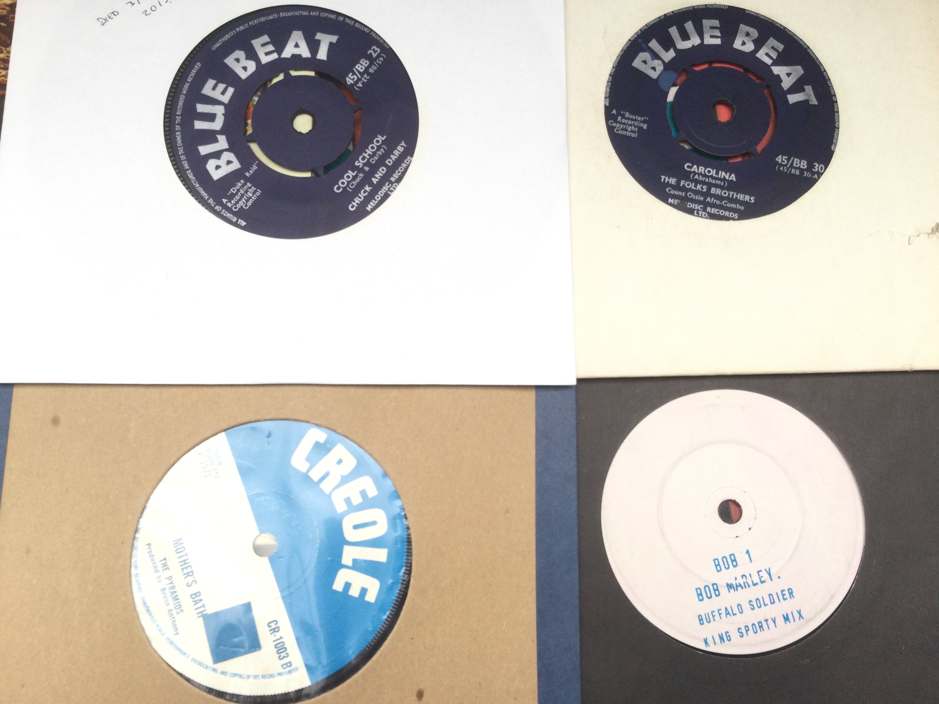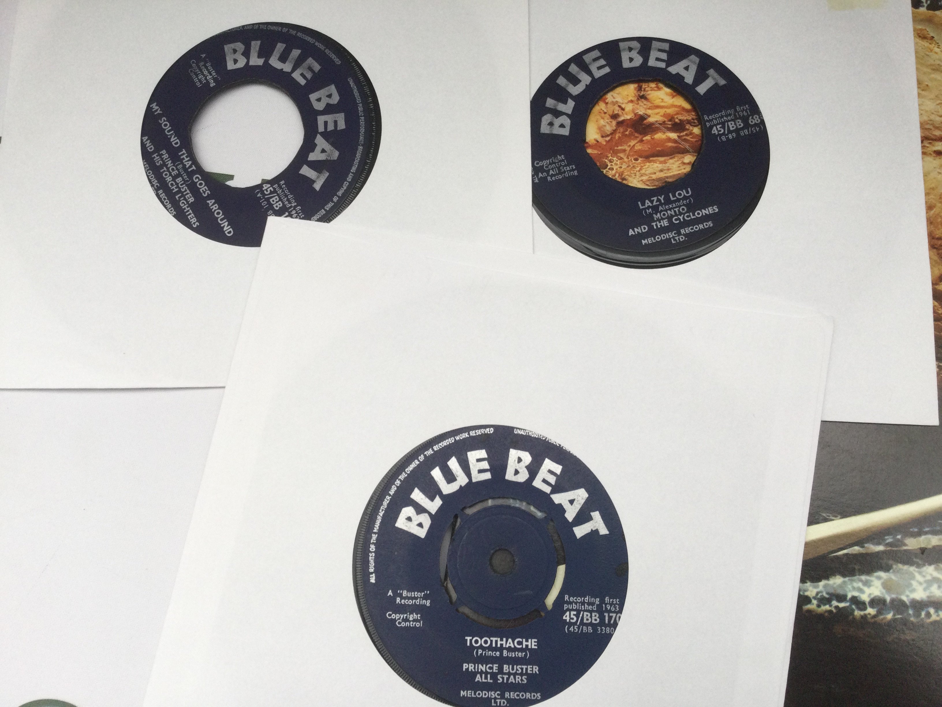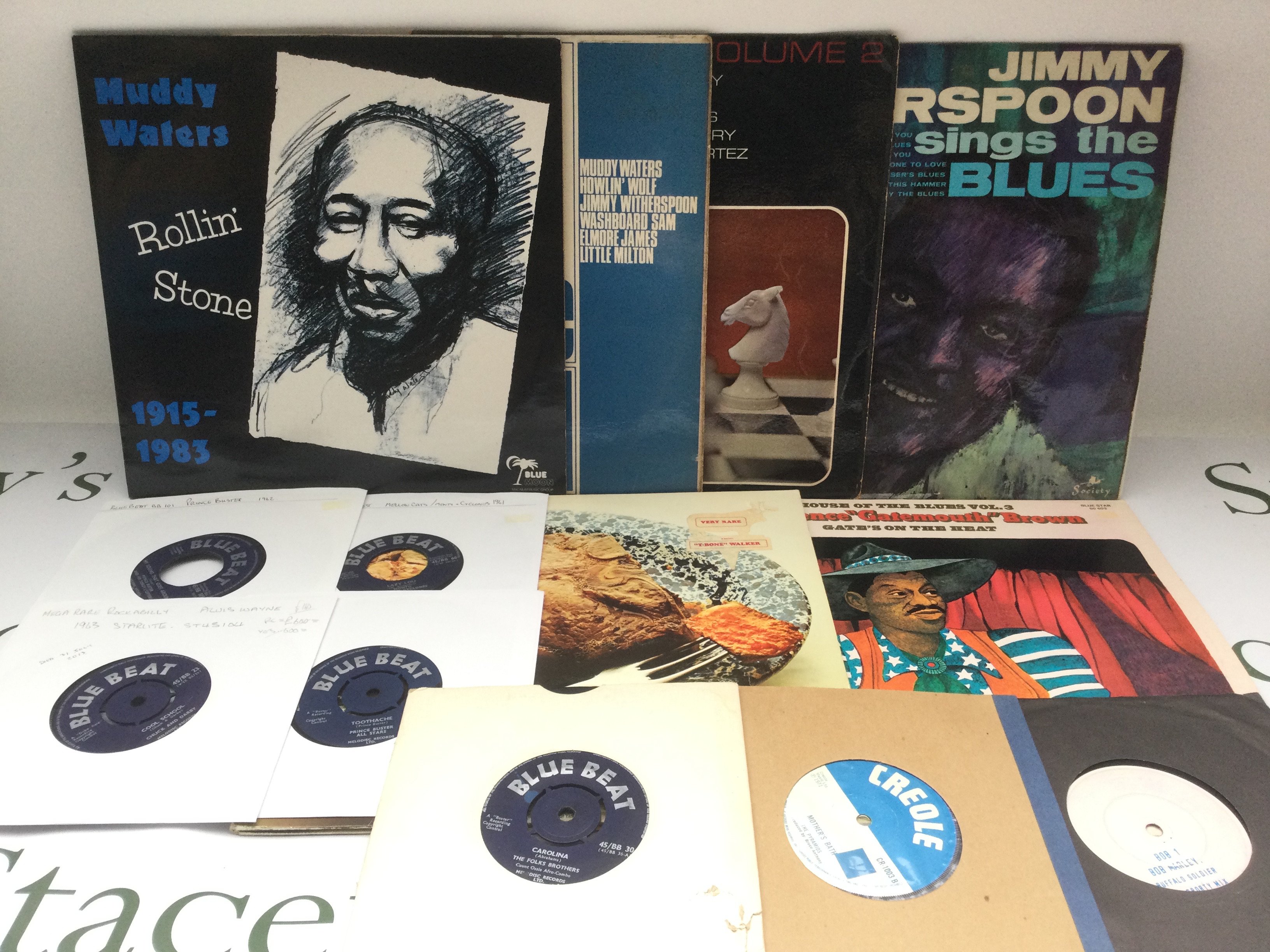 Six blues LPs by various artists including T Bone Walker, Muddy Waters and others plus some Blue Beat reggae 7" singles and others.