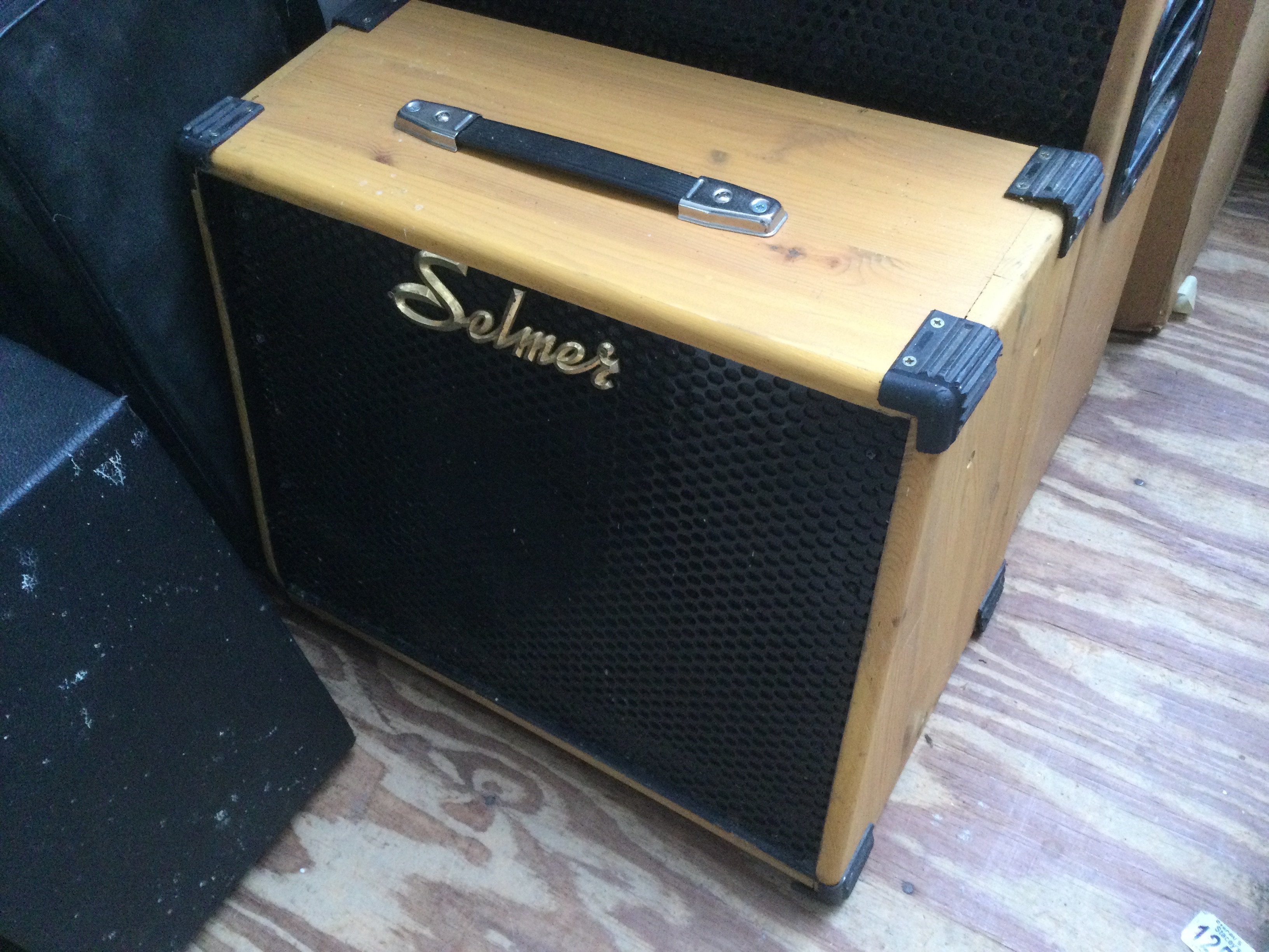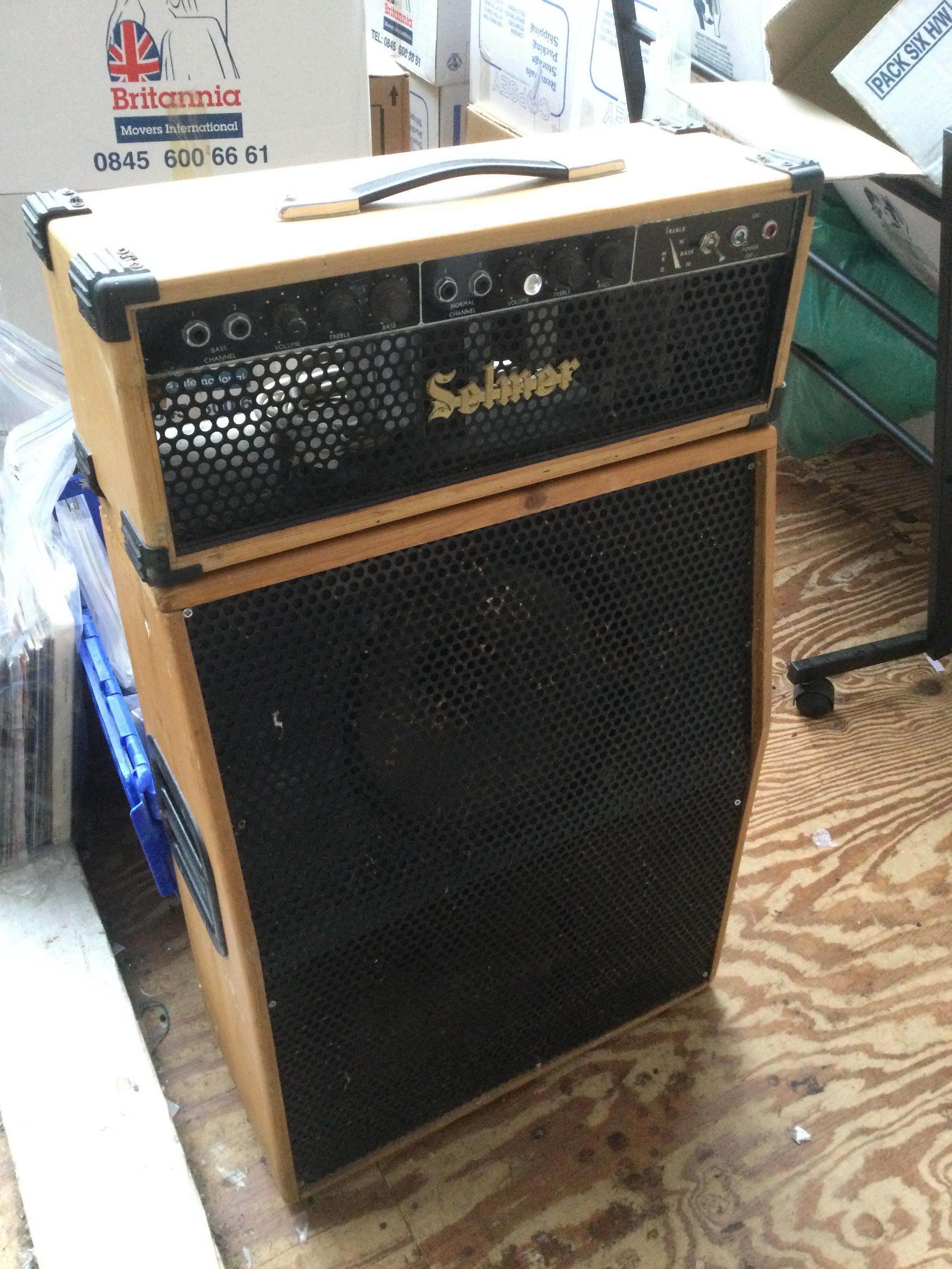 A vintage Selmer treble n bass MKii amplifier head and two cabinets in a natural wood finish (3)..