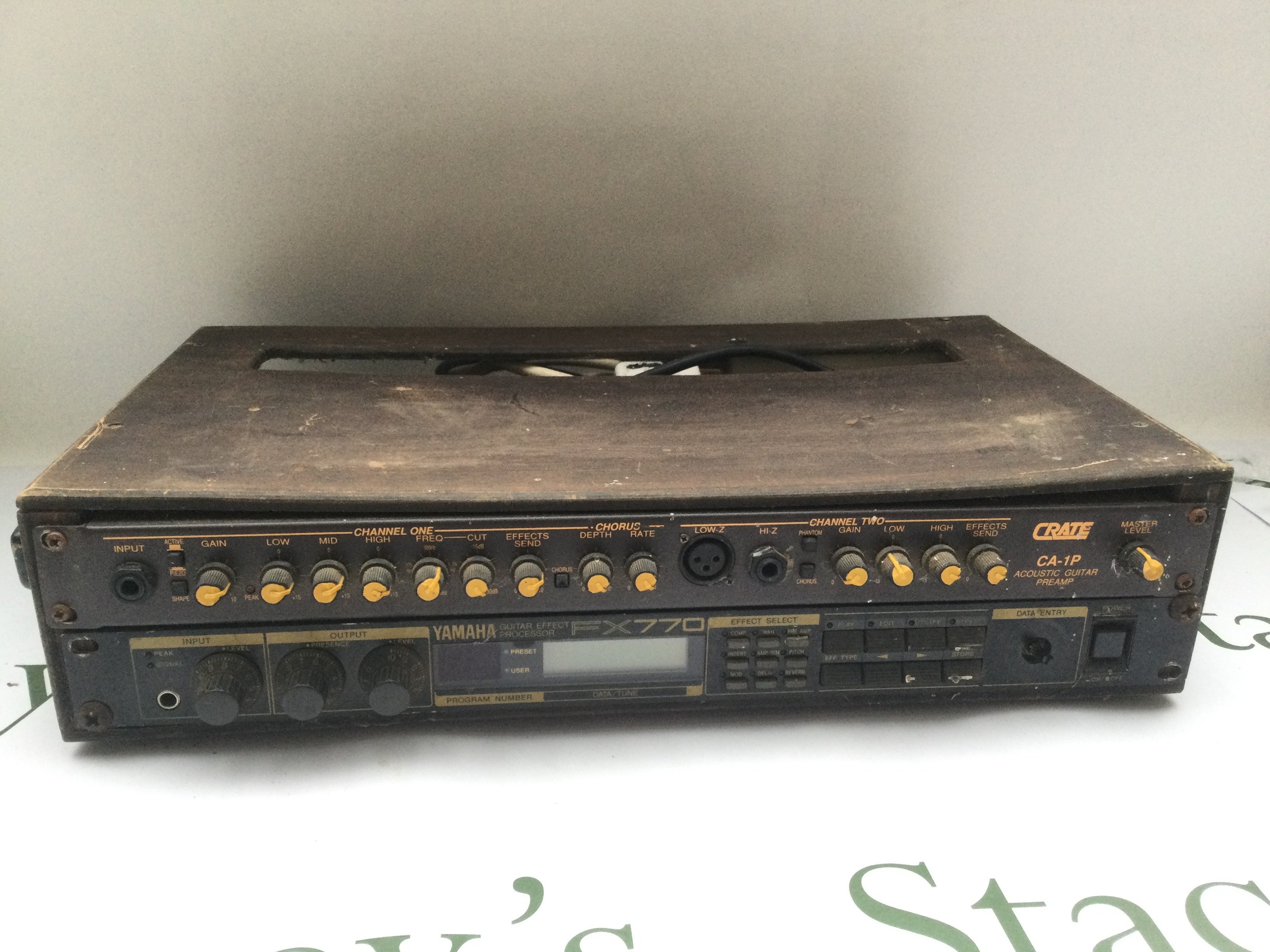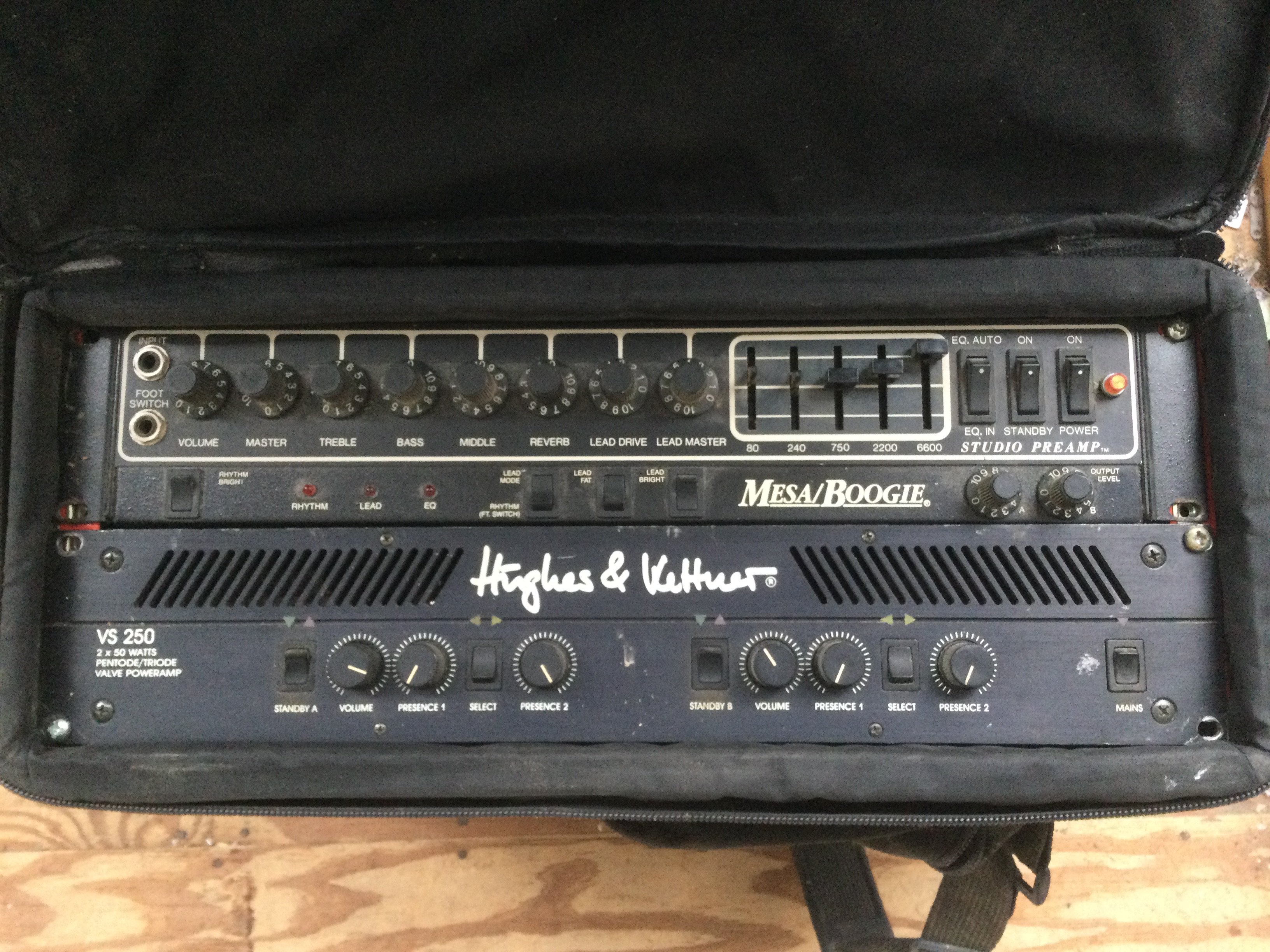 A Hughes & Kettner VS250 power amp, a Mesa Boogie studio preamp, a Yamaha FX770 effects processor and a Crate CA-1P acoustic guitar preamp.