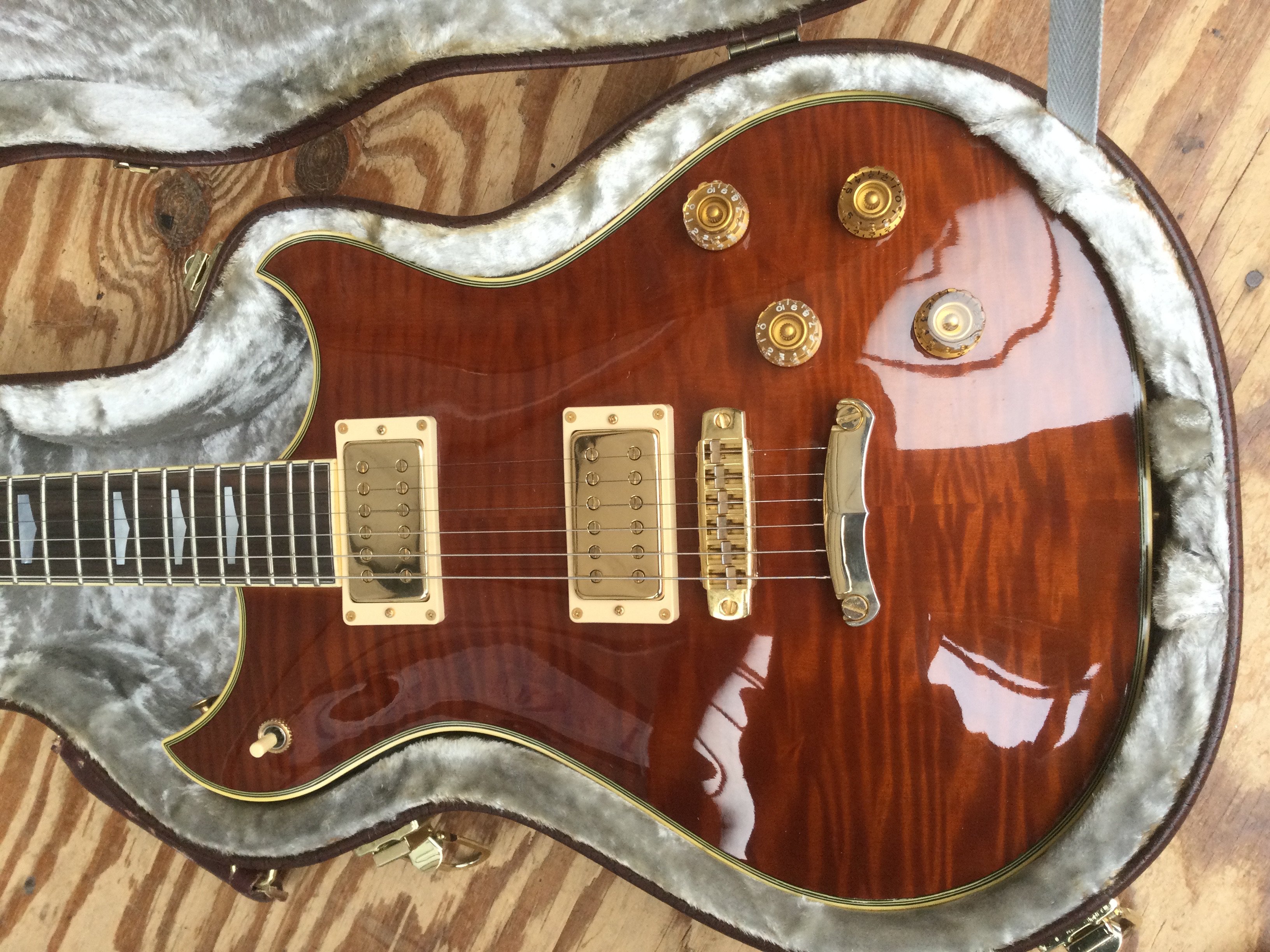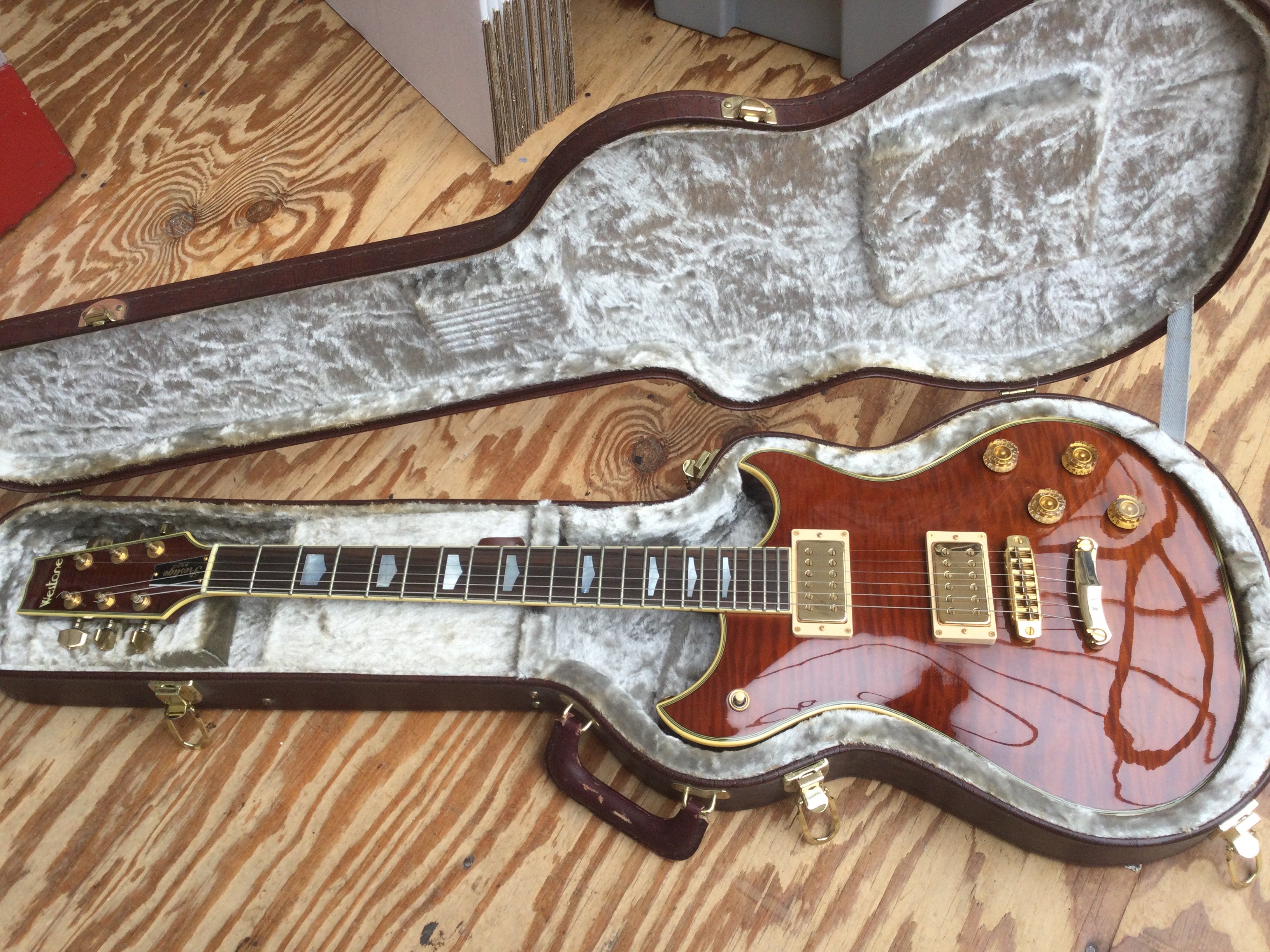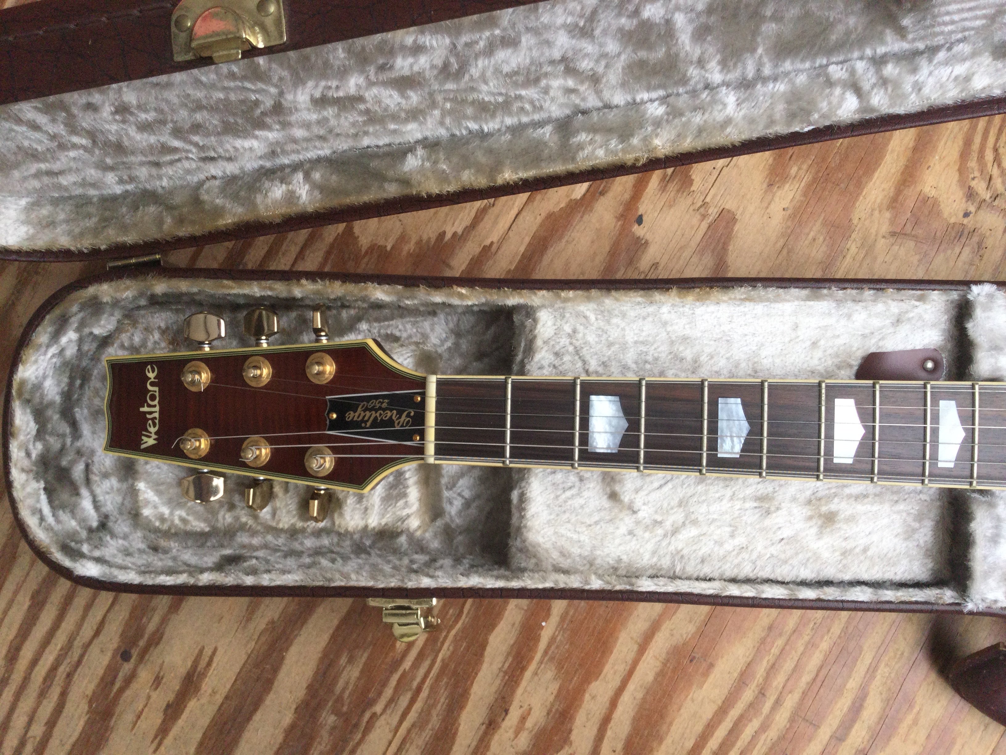 A Westone Prestige 250 electric guitar with hard carry case.