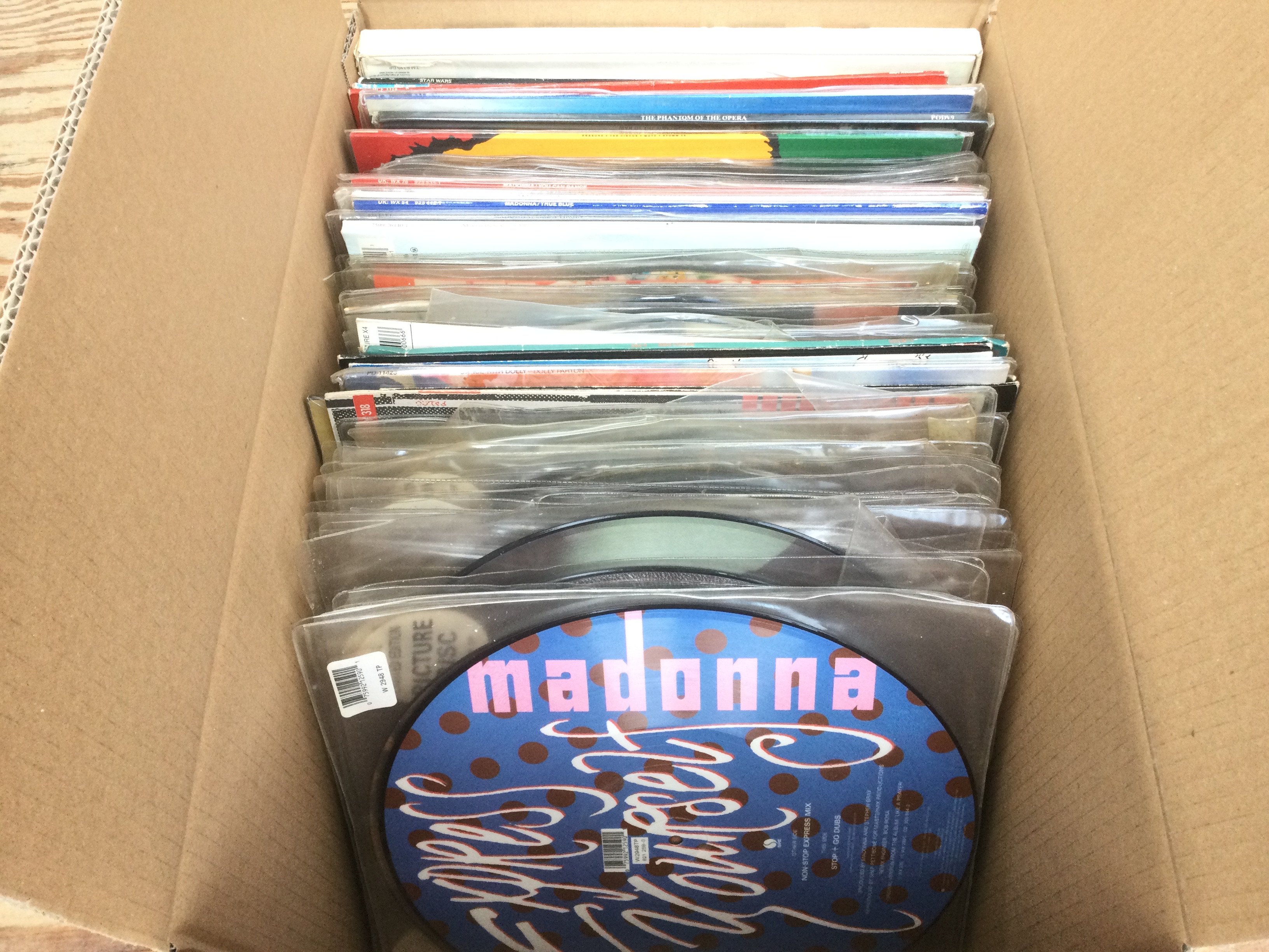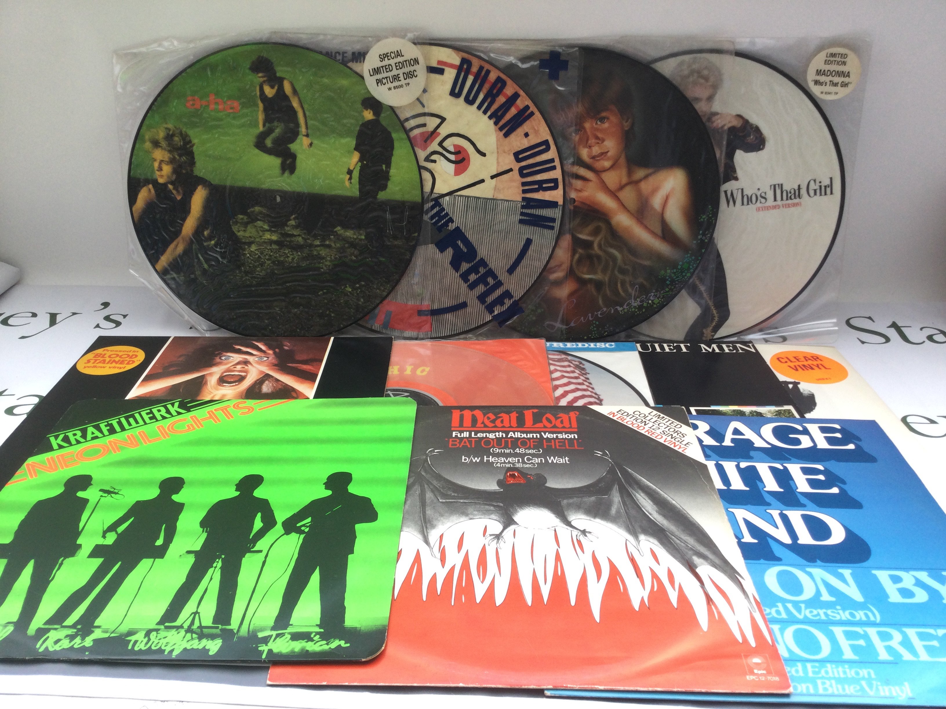 A box of LPs and 12" singles by various artists comprising many picture discs and coloured vinyl including Madonna, Duran Duran, Kraftwerk, Ultravox and many more.