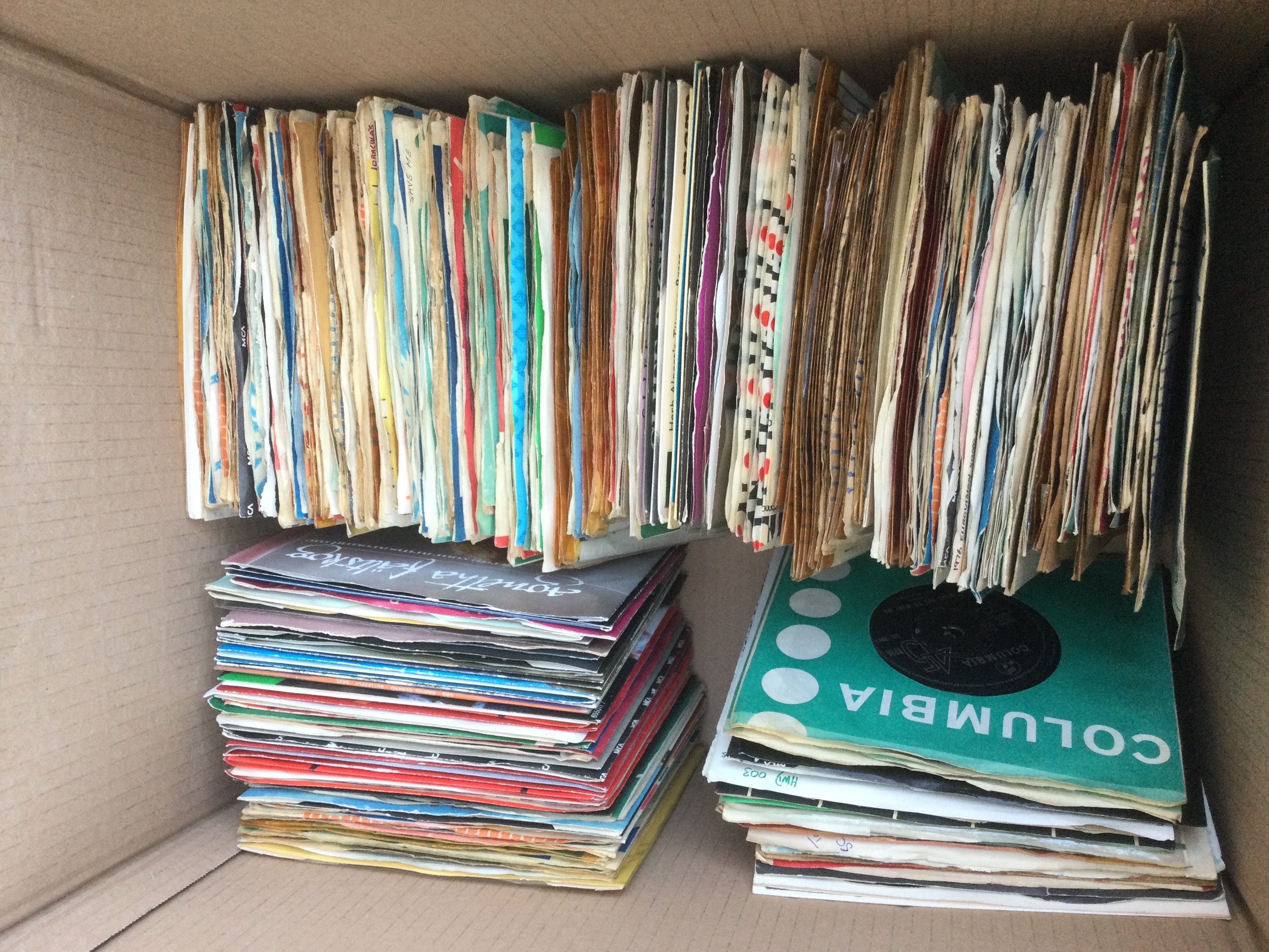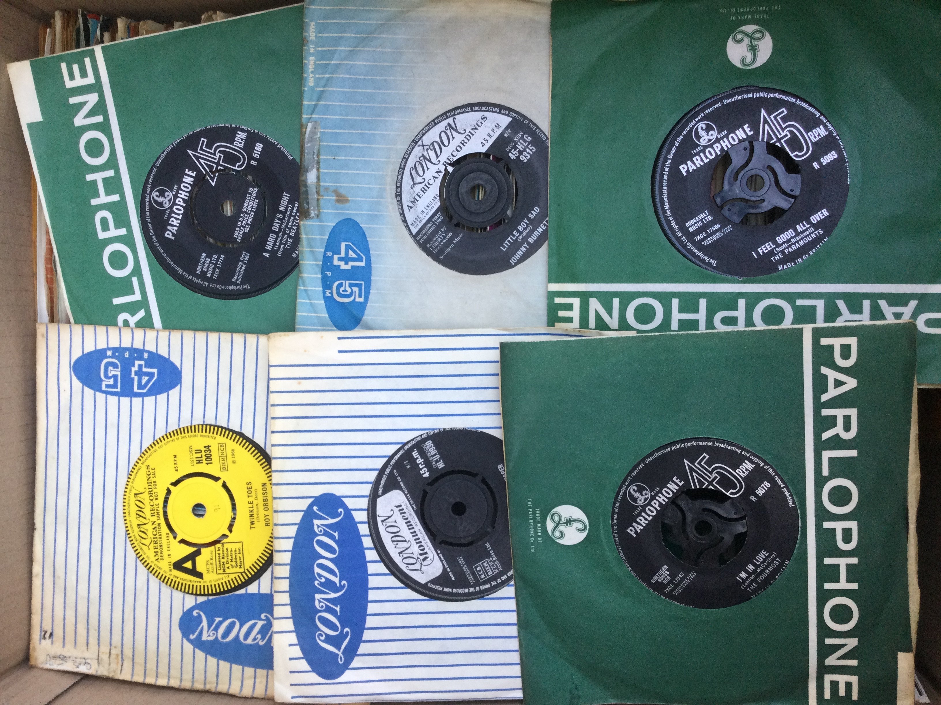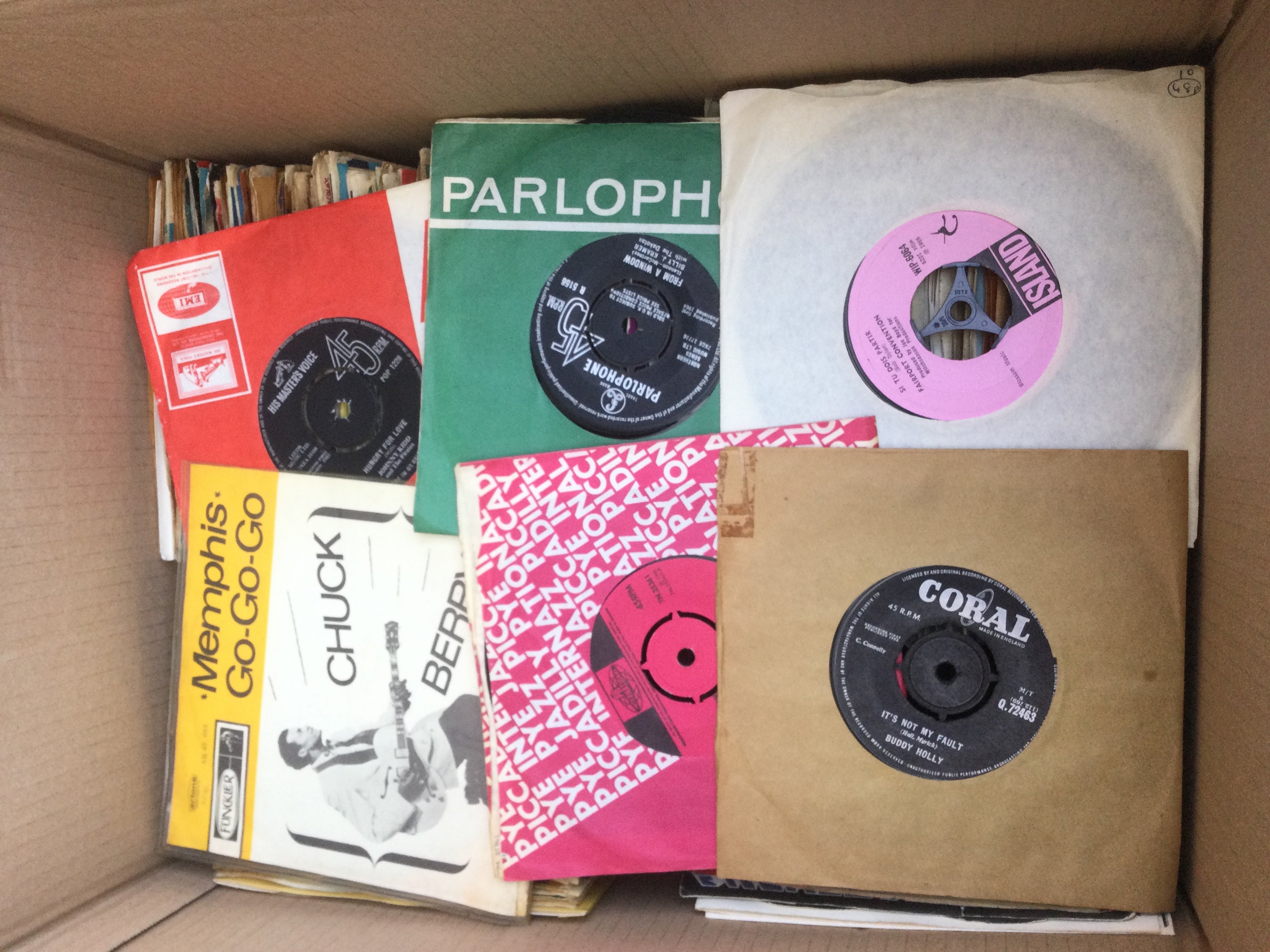A box of 7" singles by various artists including The Beatles, Johnny Burnette, Billy Fury and many more.