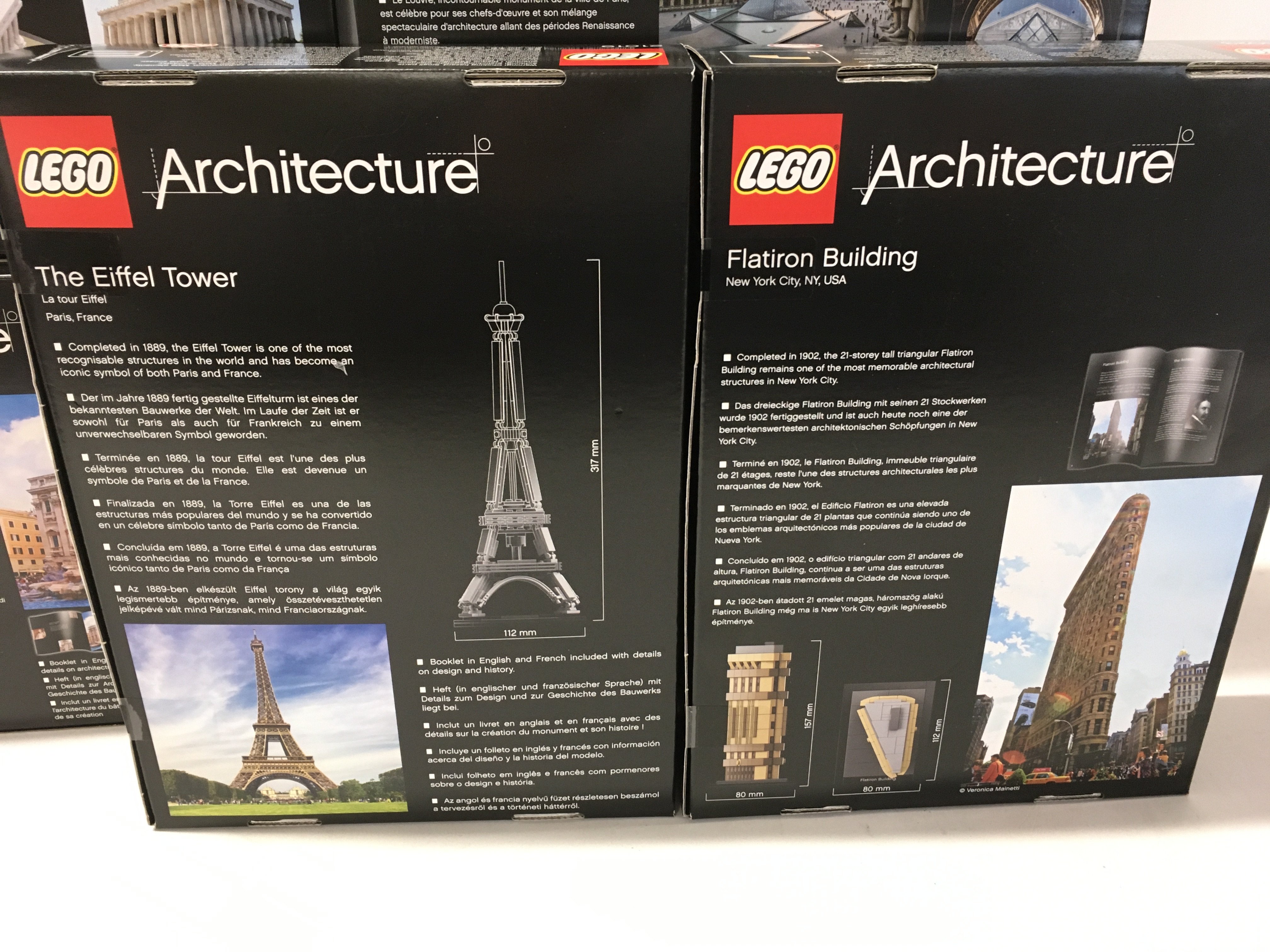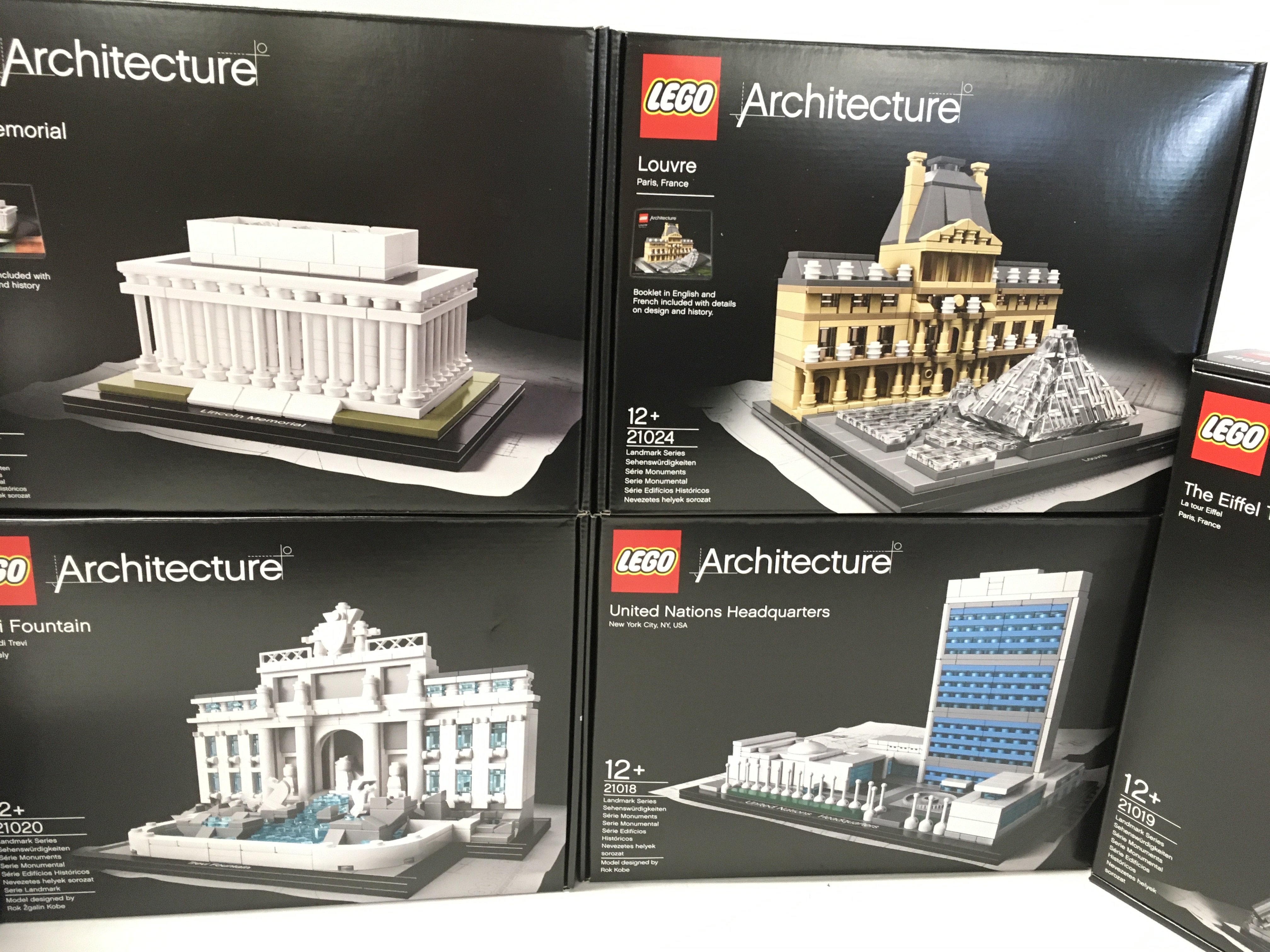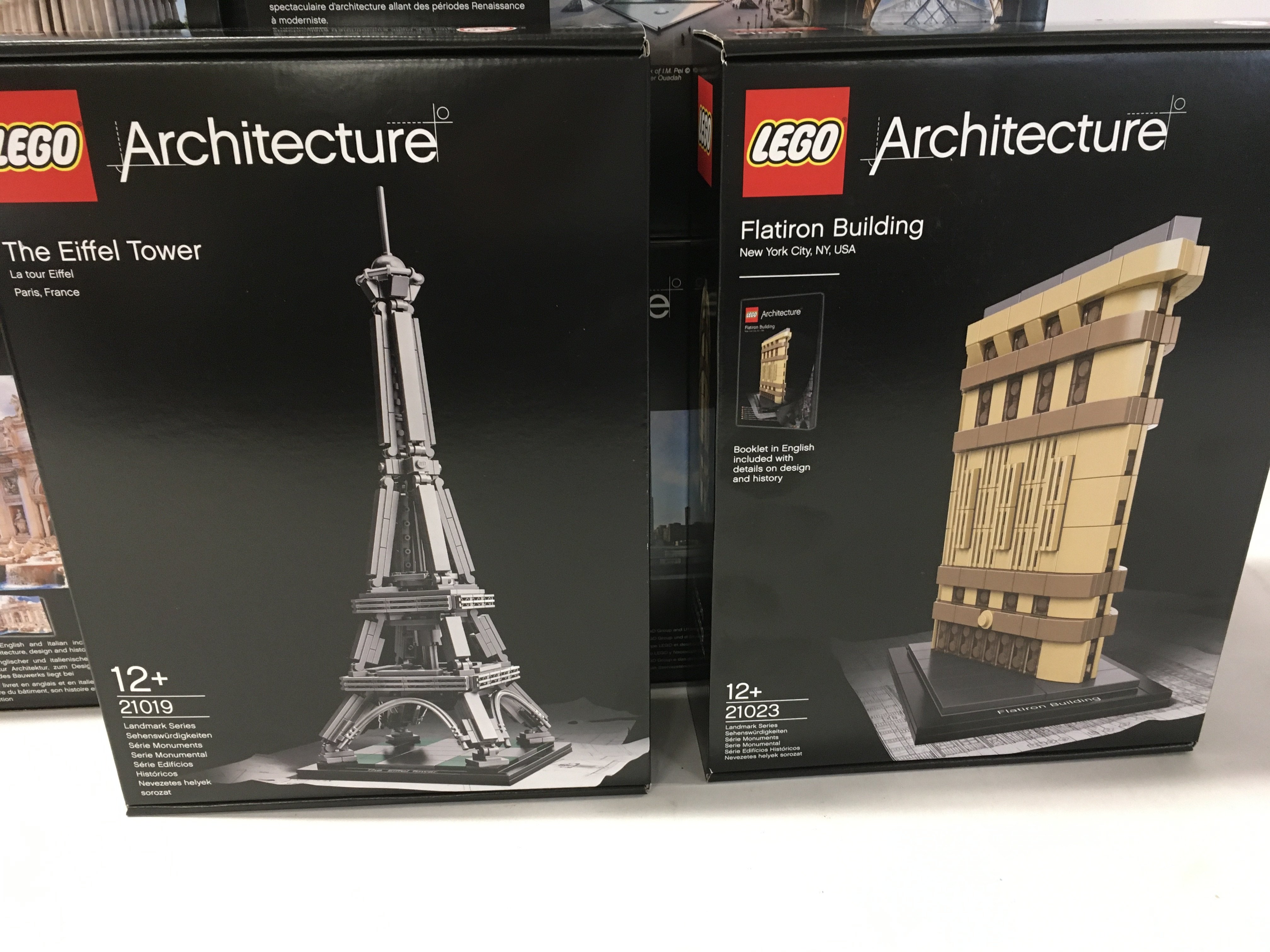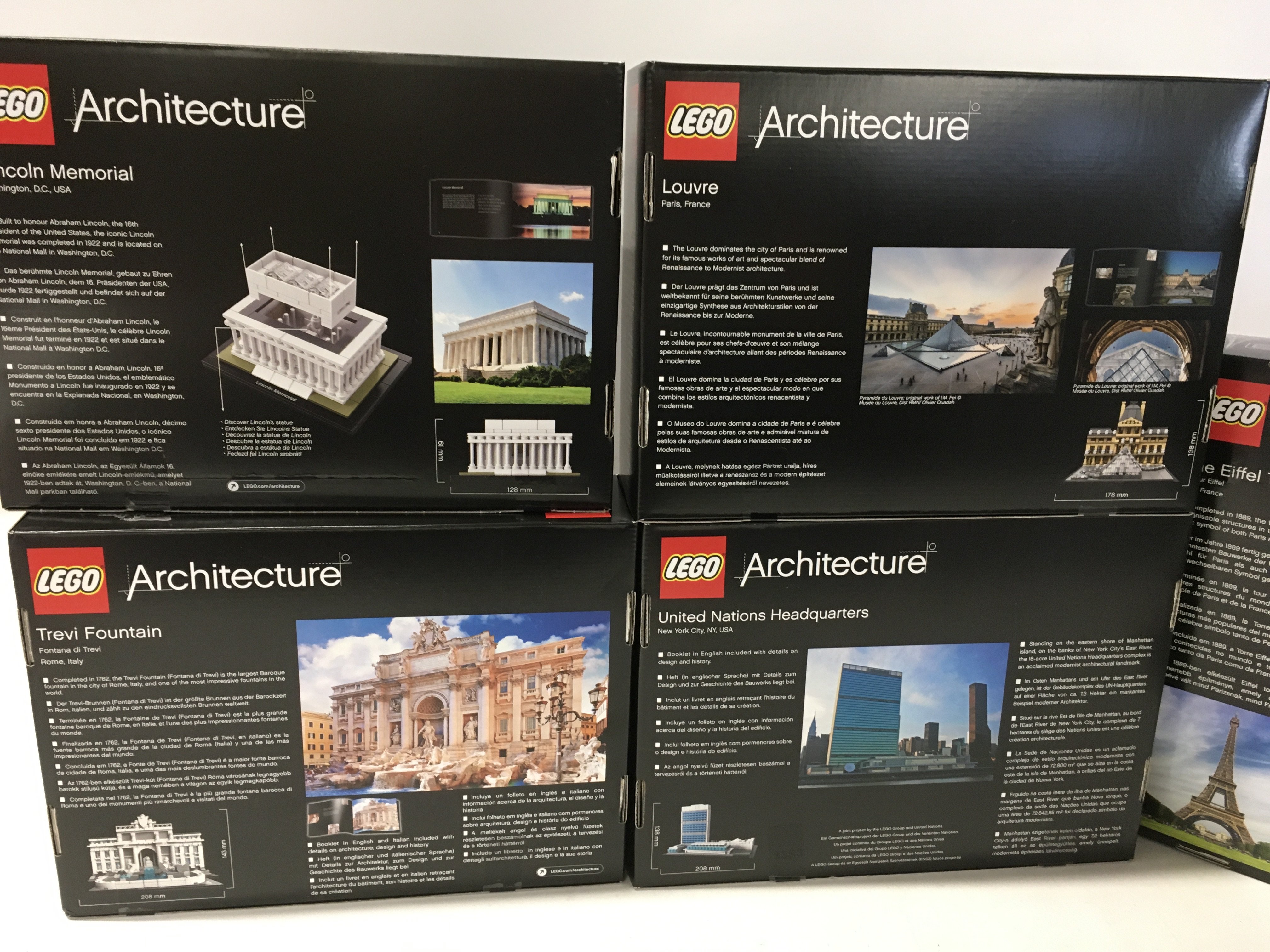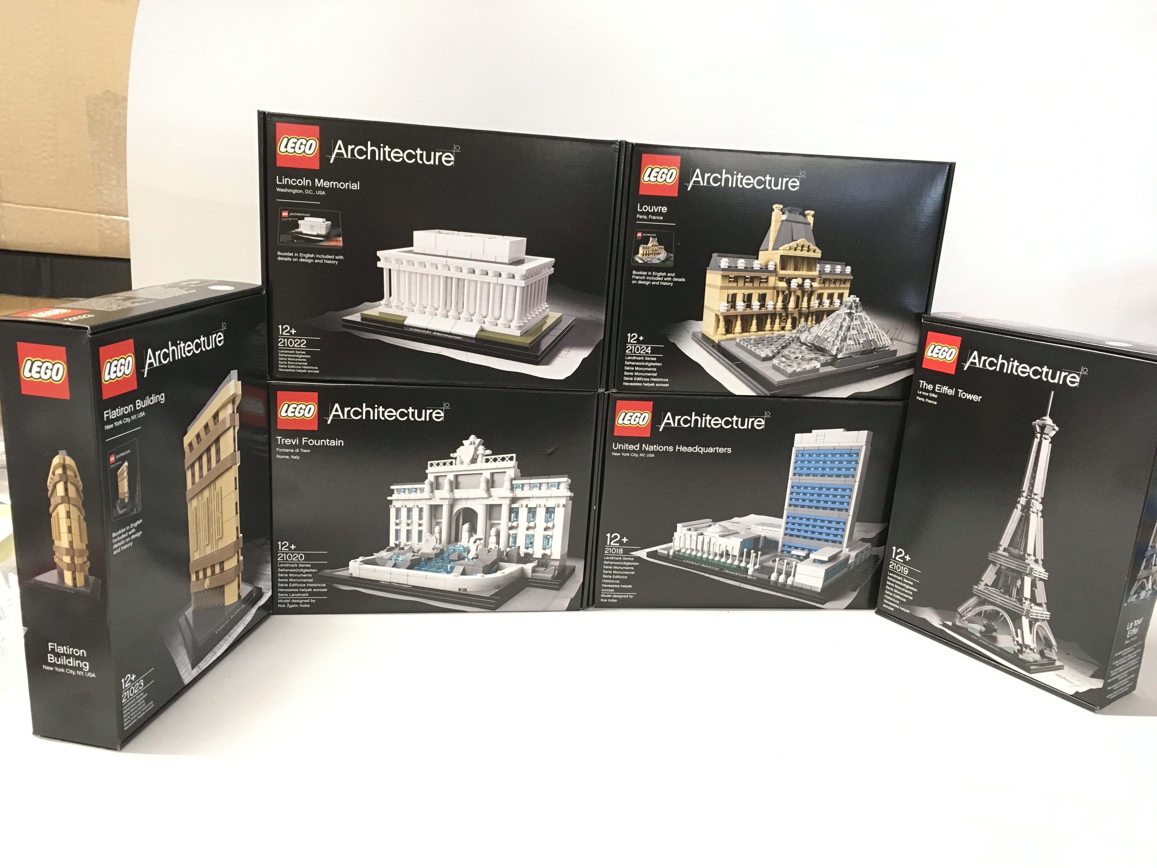 6x sealed boxed Lego Architecture sets includes..# 21023 Flatiron Building…# 21022 Lincoln Memorial…# 21020 Trevi Fountain… # 21024 Louvre…. #21018 United Nations Headquarters… # 21019. The Eiffel Tower. No reserve