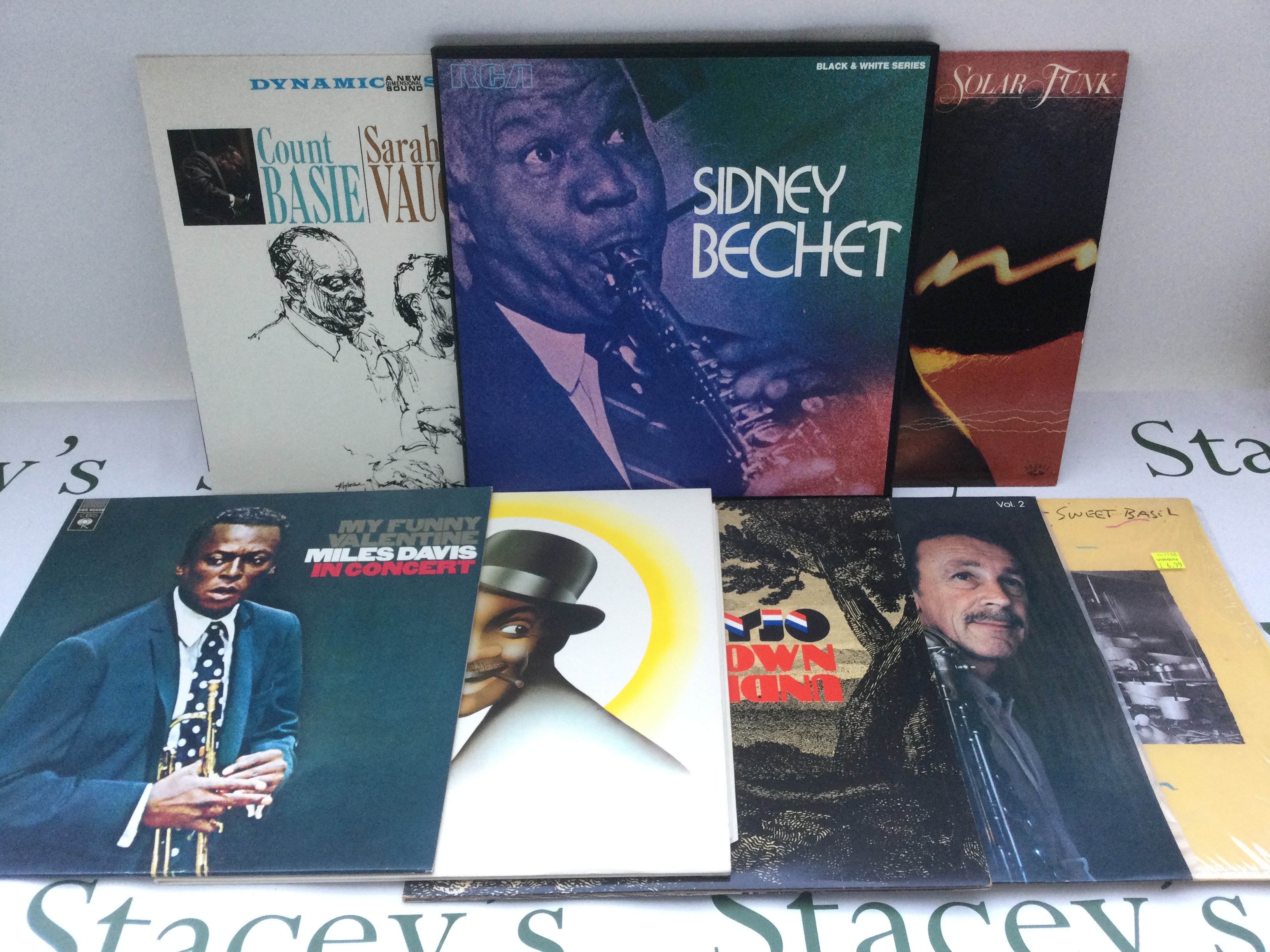 A box of mainly jazz LPs snd 78s by various artists including Miles Davis, Sidney Bechet, Fats Waller and others..